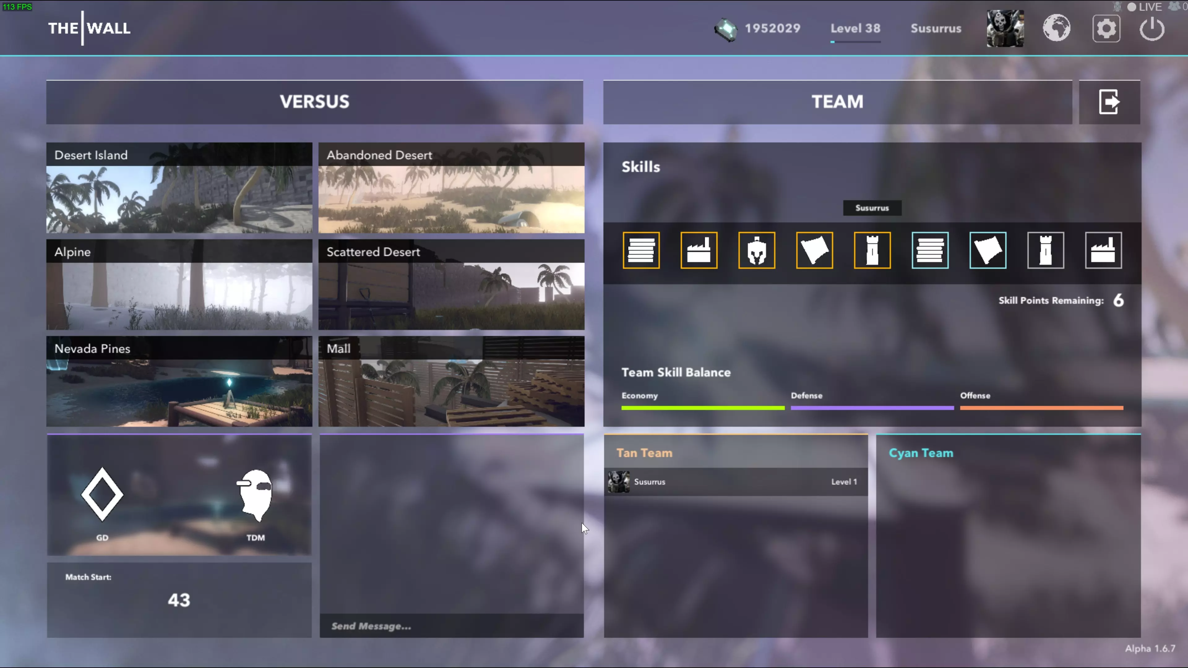 这是你匹配成功后会看到的界面。我知道,界面上信息很多,可能会让人感到混乱和紧张,还有倒计时在给你施压,但别担心,其实没那么糟。 左上角是地图选择,你可以为任意数量的地图投票,选出你最喜欢的。【分散沙漠】和【内华达松林】是大型地图,【阿尔卑斯山】和【废弃沙漠】(唯一会出现墙体倒塌的地图)是中型地图,【沙漠岛】和【购物中心】是小型地图。 左下角是模式选择、计时器和聊天框。目前有两种模式:发电机防御战和团队死亡竞赛。发电机防御战要求你的队伍保护己方的能量发电机,并摧毁敌方的发电机。团队死亡竞赛中,每支队伍都有固定数量的生命,率先耗尽生命的队伍失败。当计时器归零时,比赛将开始。此外,聊天内容对游戏内所有玩家可见。 右上角是技能选择区域。这里会显示你在技能菜单中装备的所有技能(最多9个),并允许你选择最多6个技能点。3级技能价值3个技能点,2级技能价值2个技能点,1级技能价值1个技能点。这意味着你可以选择2个3级技能、6个1级技能,或其他任何组合。每个技能在后台被归类为经济、防御或进攻类型,而【团队技能平衡】的数值会根据团队中所有人的选择而变化。 右下角显示所有玩家的Steam名称、头像以及他们所在的队伍。 资源收集