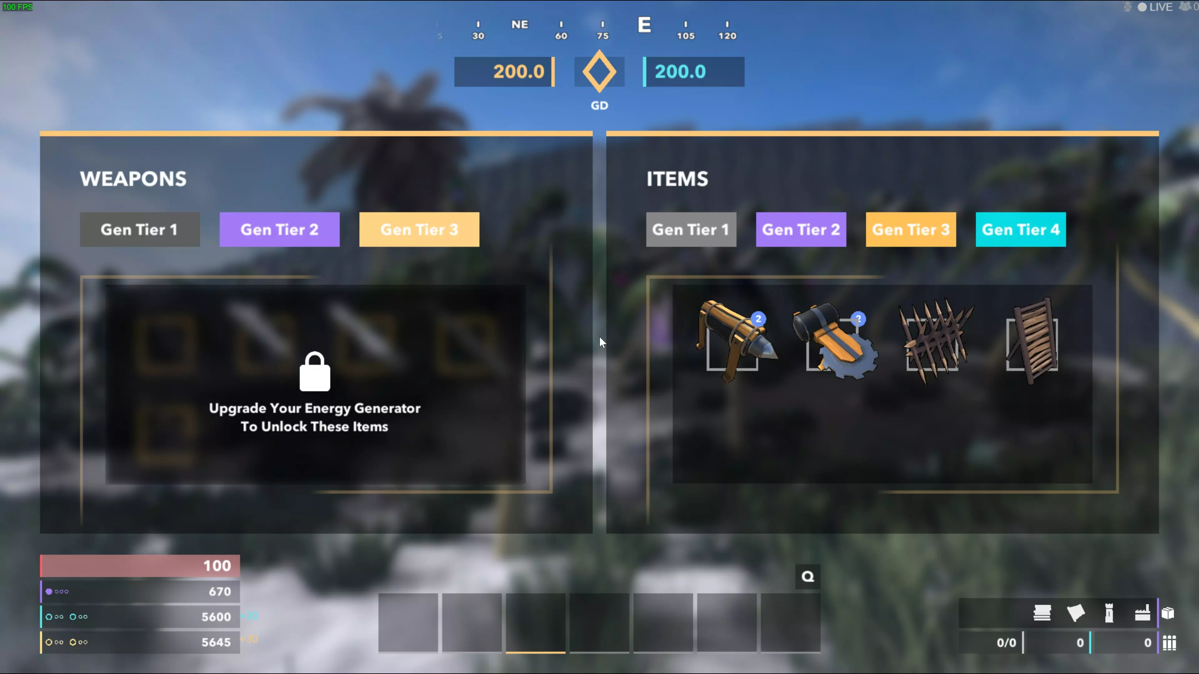 战斗所需的第一件东西显然是枪。标签菜单的左侧是武器,分为3个标签页:第1代、第2代和第3代,每一代都比上一代更贵且威力更强。要解锁下一级别的武器,你必须将能量发生器升级到相应的等级。铝热炸药仅对建筑造成伤害,不会对发生器或炮塔造成伤害。铝热炸药和C4的伤害相同,但C4的引爆速度要快得多。按住右键并点击左键可以投掷刀具。枪支拥有无限弹药,但需要资源进行 reload。所有 gunfire 均为 hitscan,没有弹道下坠或飞行时间。