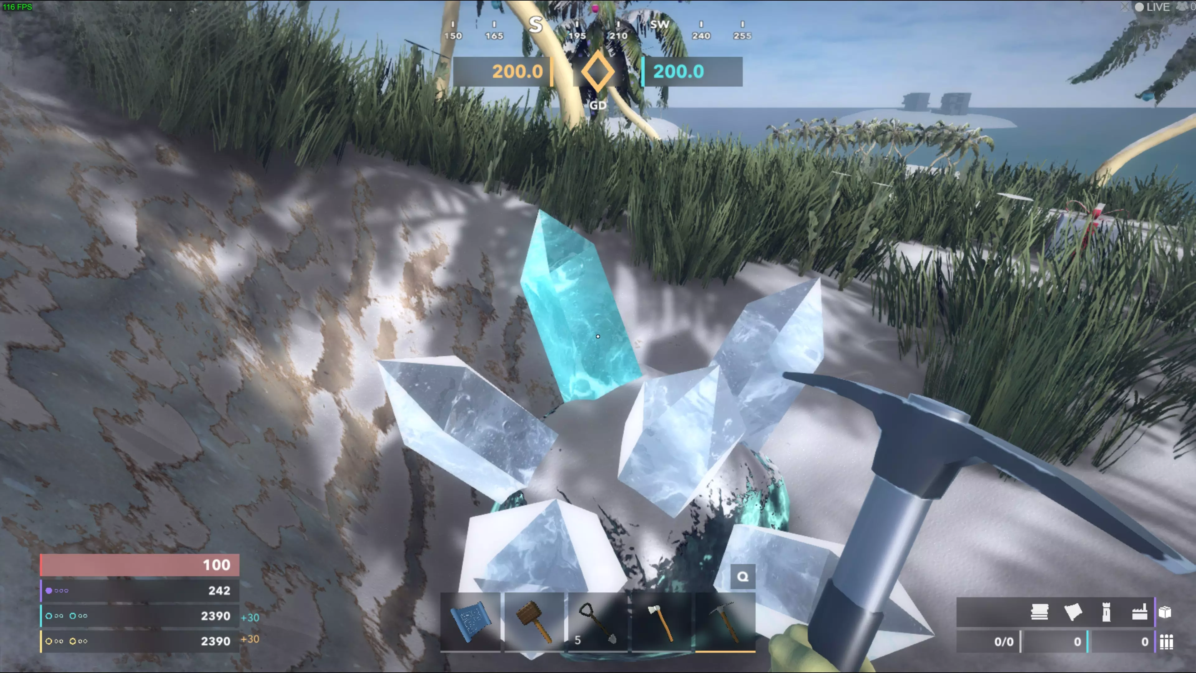 水晶:开采地面矿物时,务必确保击中蓝色水晶。它可能位于地下,因此需要用铲子四处挖掘直至找到。每次水晶破碎后,下一个水晶每次敲击能产出更多材料,这使得开采这些水晶比巨型水晶矿脉效率更高。当拥有足够资源后,你需要购买水晶生成器。方法是按Tab键,在右侧的【Gen Tier 1】标签下找到它,并将其放置在巨型水晶矿脉上;这样它就能为你被动生成水晶。巨型水晶矿脉有两种类型:普通型和高价值型。普通型为蓝色,高价值型靠近敌人基地且呈紫色。在高价值水晶上放置生成器,将能获得普通水晶1.5倍的材料产出。不过,这些生成器更容易被摧毁,因为它们不在你的基地附近。用锤子升级水晶生成器可以提高每秒的水晶产量,并且可以将其升级到3级。你最多只能放置2个水晶生成器。