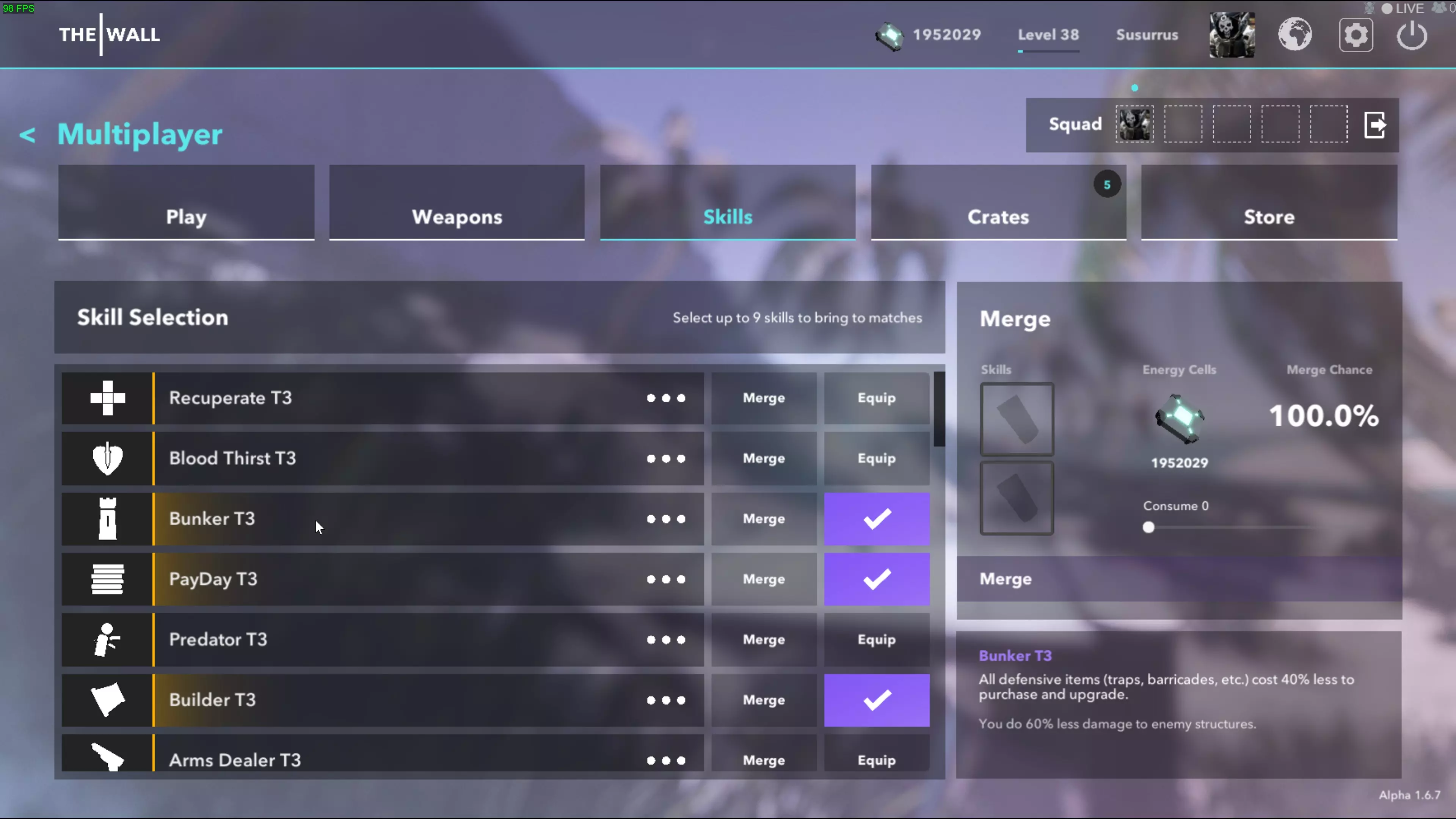 技能:这部分内容既有趣又复杂。每个技能都有正面和负面效果,旨在让游戏充满动态变化,同时为新玩家保持平衡。此界面会显示你通过技能 crate(技能箱)获得的所有技能,并允许你对这些技能进行合并和装备。 你最多可以装备9个任意等级的技能,在加载游戏时带到地图选择界面。在地图选择界面,你只能装备总计6个技能点。3级技能价值3个技能点,2级技能价值2个技能点,1级技能价值1个技能点。这意味着你可以携带2个3级技能、6个1级技能,或其他任意组合。你不能装备不同等级的相同技能来叠加效果。融合需要消耗2个相同等级的技能,并生成一个随机的下一等级技能,与用于融合的技能无关。默认情况下,融合的成功率为50%,但你可以添加能量电池来提高成功的可能性。融合失败会摧毁用于融合的两个技能,且不会获得任何东西。