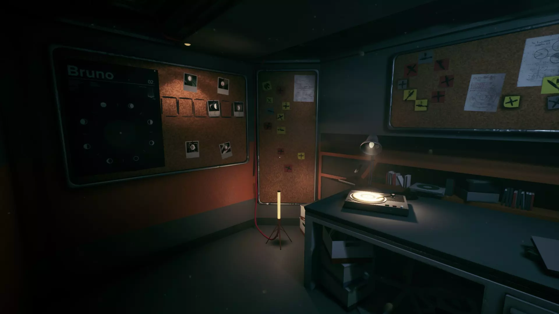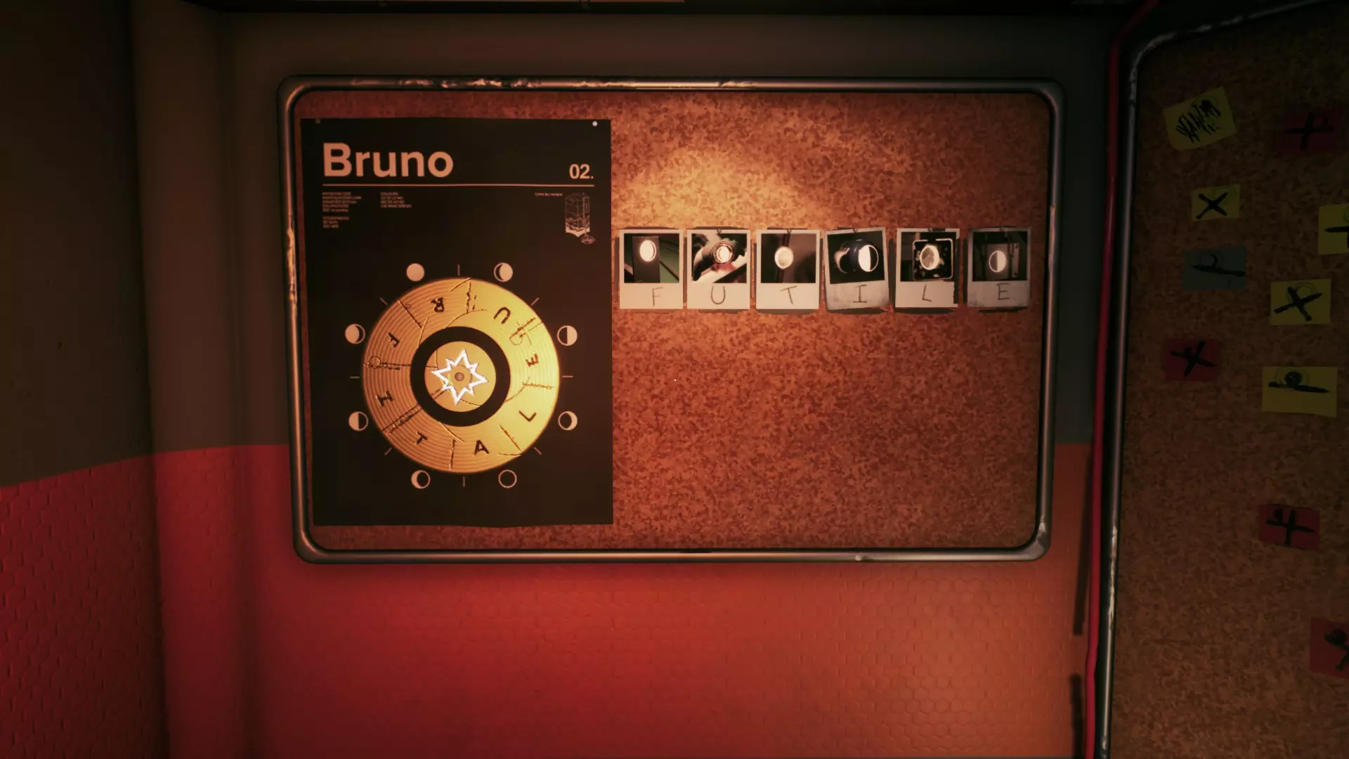 结局 舒缓的背景音乐,在恐怖游戏里这可真是难得…… 现在是时候把所有照片都放在板子上,找到最后一条线索来获取密码了。那么,我们开始吧。