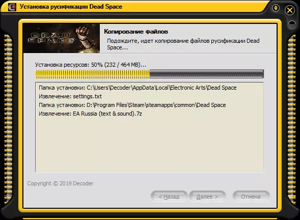 EA Russia原版制作的文本与语音二合一俄语化补丁(用户可选择)。 描述: 该俄语化基于EA Russia为《死亡空间》(2008)制作的本地化版本,因此翻译为官方版本。 在选择组件时,用户仅可选择以下两种俄语化选项: 1. 仅文本(EA Russia的原版文本翻译,不影响角色语音) 2.文本与声音(由EA Russia提供的完整游戏本地化) 技术支持指南会作为可选内容安装到游戏的Ru目录下。 安装本地化补丁后,游戏设置中英语选项将替换为俄语选项。 该翻译与Steam兼容,并已适配游戏最新版本。俄语化安装过程完全自动化,因此程序会在注册表中搜索之前安装的《死亡空间》(Steam版)。 需要注意: 游戏文件夹默认位于...Steam steamapps common 不会因游戏汉化导致账号封禁 安装汉化后,记得关闭自动更新 安装汉化后,不建议运行缓存完整性验证 游戏汉化补丁按"现状"原则提供,即"原样提供",因此不附带任何保证,也不做相关承诺。您使用本软件的风险由您自行承担。程序包作者不对使用或误用本软件过程中造成的任何数据丢失、损坏或任何损失负责。截图与下载