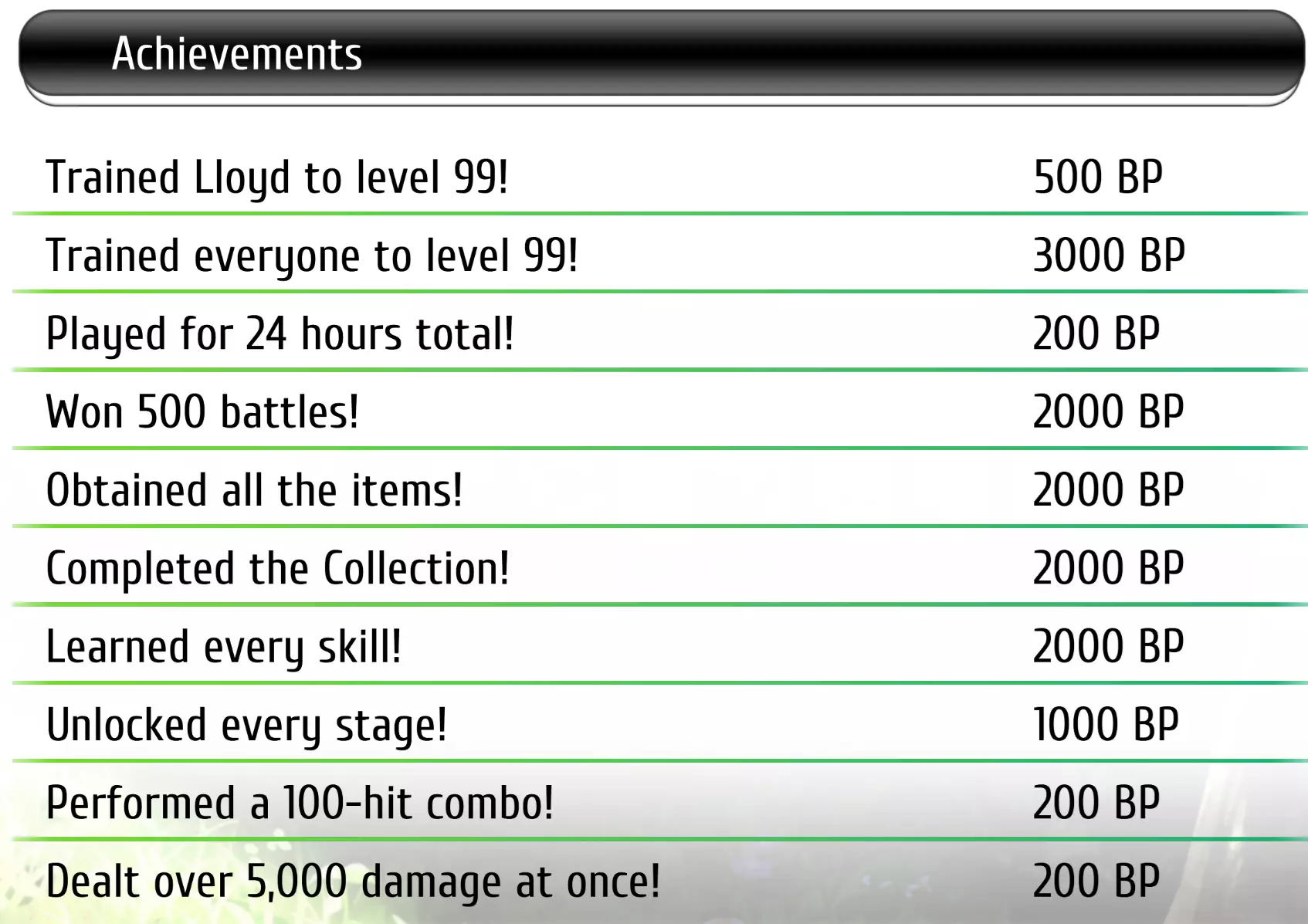 你需要提升BP等级以解锁屠龙者职业。这样做你将获得洛伊德。 其中许多内容与成就相关,因此无论如何你都需要完成。不过,有些内容与成就无关,你可以选择跳过,例如赢得500场胜利。 请注意,这些与BP成就相关的Steam成就会在你在游戏主菜单中解锁它们的那一刻弹出,而不是在你满足条件的那一刻。因此,如果你一直在进行故事模式并在过程中解锁了某个成就,它会在你观看完结束 credits 并返回主菜单后解锁。 通用指南 1. 完成5个角色各自的故事模式。 2. 以替换难度完成故事模式。你只需完成一次,无需为每个角色都完成。你无需在高级难度下通关故事模式,不过你可以在此难度下刷经验值、BP和摩纳点,但该难度不会提供任何独特奖励,也与成就无关。 3. 使用包括洛伊德在内的所有角色通关街机模式。 4. 将所有角色等级提升至99级。 (1) 这会奖励你一个物品。(该物品与某个成就相关) (2) 将角色等级提升至99级可获得BP。 5. 其他累计事项 以下内容为累计计数,无需一次性完成。 友谊的力量:使用支援行动100次。 摩纳²⁰⁰:访问摩纳商店200次。 爆发让我感觉良好:使用极限爆发100次。(根据记忆,游戏中没有关于此操作的教程弹窗。请查看你的按键设置,并查阅游戏内教程了解其功能。)哦,还有个小提示,击败最终 Boss 后,在胜利画面出现前会有一小段时间,因为会有龙倒下的动画。这段时间内使用 E-Burst 不会消耗 HP。所以趁这个机会狂按 E-Burst 吧。 【破坏 500 个物体】也是累计的,不过它不是 Steam 成就,只是 BP 成就。 一些注意事项: 你可以在多人模式下解锁成就。但如果我没理解错的话,必须由 1P 玩家达成条件。(不过我也有可能搞错了。) 所以你可以通过自己操控多个角色来创造达成条件的机会。 【生病的一天:同时处于所有异常状态】这一成就不可累积,必须在单场战斗中完成,且你的角色需同时受到所有状态异常影响。需要10个状态图标,但要注意像【SP减少】这类状态也会显示,不过它们不计入在内。只有教程中展示的状态异常才会被统计。 有一些饰品可以提供状态异常,但只能提供7种。因此还需要通过其他方式获得3种。 据CMDR Sho所说,吉尔伯特有时会施加所有状态异常,你可以利用这一点来达成条件。 以下是我使用的一些方法: 我通过以下方式达成:1.任意第一个角色 2.装备大量饰品的缇妲,并搭配【随机状态异常攻击】的坎帕内拉作为支援 3.装备饰品的克鲁兹和坎帕内拉 4.克洛伊CPU。 1.第二、第三角色和CPU组队对抗第一个玩家 2.2和3激活支援 3. 克鲁克西发动挑衅 4. 缇妲使用机关枪 5. 连续点击攻击按钮。 【Made of Sapphirl】:承受超过13000点伤害后赢得一场对战 这一描述有些误导。其实际含义为:(你的角色初始生命值)-(你获胜角色的最终生命值)>13000 我通过给多奇装备生命值饰品达成了这一成就。 【Building My Museum】:完成素材收集 虽然部分素材可通过战斗奖励获得,但你也可以在莫娜商店购买。 请注意,部分原声音乐需解锁相关关卡后,商店才会开放购买。 Steam专属成就。这些成就未在游戏内成就列表中显示,只要达成条件就会自动解锁。由于它们是隐藏成就,我在此列出以节省大家点击成就查看条件的时间。 Reluctant Leaders:使用科洛并以奥哈为支援赢得一场对战。 Bring the Hammer Down:使用克鲁克西并以穆斯塔法为支援赢得一场对战。 JoJo's Unusual Predicament:使用约书亚并以乔瑟特为支援赢得一场对战。 Oh, There She Is:使用艾夏并以希古伦为支援赢得一场对战。 That's Fact Up:使用亚特鲁并以暗之ファクト(Dark Fact)为支援赢得一场对战。 A Match Made in Heaven:使用奥利维尔并以雪拉扎德为支援赢得一场对战。 Ya Gotta Have Green Hair:使用艾尔克并以凯文为支援赢得一场对战。 Ancient Ys Vanished:使用亚特鲁并以菲娜与蕾雅为支援赢得一场对战。特殊支援组合:使用洛伊德并以艾丽为支援赢得一场对战。 乘风而行:使用蜜雪儿并以缇雅和玛娅为支援赢得一场对战。 继承的重任:使用缇妲并以尤妮卡和雨果为支援赢得一场对战。 壮汉压制:使用多奇并以金为支援赢得一场对战。 噬身之蛇的光与影:使用玲并以吉尔伯特为支援赢得一场对战。 斯托达特的勇士:使用切斯特并以艾莲娜为支援赢得一场对战。 零与二:使用罗伊德并以肯帕雷拉为支援赢得一场对战。 这应该不会造成心理阴影:使用盖伊斯并以厄恩斯特为支援赢得一场对战。根据CMDR Sho的说法,如果我理解正确的话,BP成就“Beat Arcade Mode unscathed”是指无伤通过街机模式中的任意一个关卡(而非整个流程)。“Dealt over 5,000 damage at once”这个BP成就指的是在连击期间造成5000点伤害,而非单次攻击。