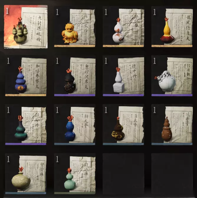 葫芦 共10种,其中部分需要二周目获取: 1. 五鬼葫芦:击败BOSS疯虎后开启宝箱获得 2. 争先红葫芦:豪华版奖励,不计入成就 3. 宝莲玉葫芦:完成六六村剧情后,向申猴购买 4. 燃葫芦:在极乐谷的一念壁区域开启宝箱获得 5. 妙仙葫芦:完成盘丝洞剧情后,向申猴购买 6. 湘妃葫芦:在盘丝洞的花间桥区域开启宝箱获得 7. 彩玉葫芦:击败BOSS毒敌大王后开启宝箱获得 8. 上清宝葫芦:宝莲葫芦满级后,在火焰山第五次遇见葫芦仙人获得 9. 乾坤彩葫芦:完成花果山剧情后,向申猴购买 10. 青田葫芦:二周目开启后,向申猴购买