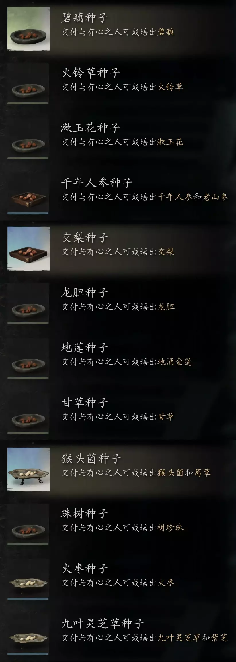 种子 共15种,实际上是12个种子,其中9个需要刷取: 1. 碧藕:很简单,到处都有 2. 交梨:快活林瀑布往下跳有很多 3. 龙胆:很简单,到处都有 4. 树珍珠:很简单,到处都有 5. 火枣:谷口、罗刹宫岩浆里有很多 6. 漱玉花:很简单,到处都有 7. 火铃草:很简单,到处都有 8. 甘草:很简单,到处都有 9. 地涌金莲:打地莲精获得 10. 九叶灵芝草、紫芝(共用一个):打九叶灵芝精获得 11. 猴头菌、葛蕈(共用一个):打蘑女获得 12. 老山参、千年人参(共用一个):打老人参精获得 注:白僵、龙胆不计入