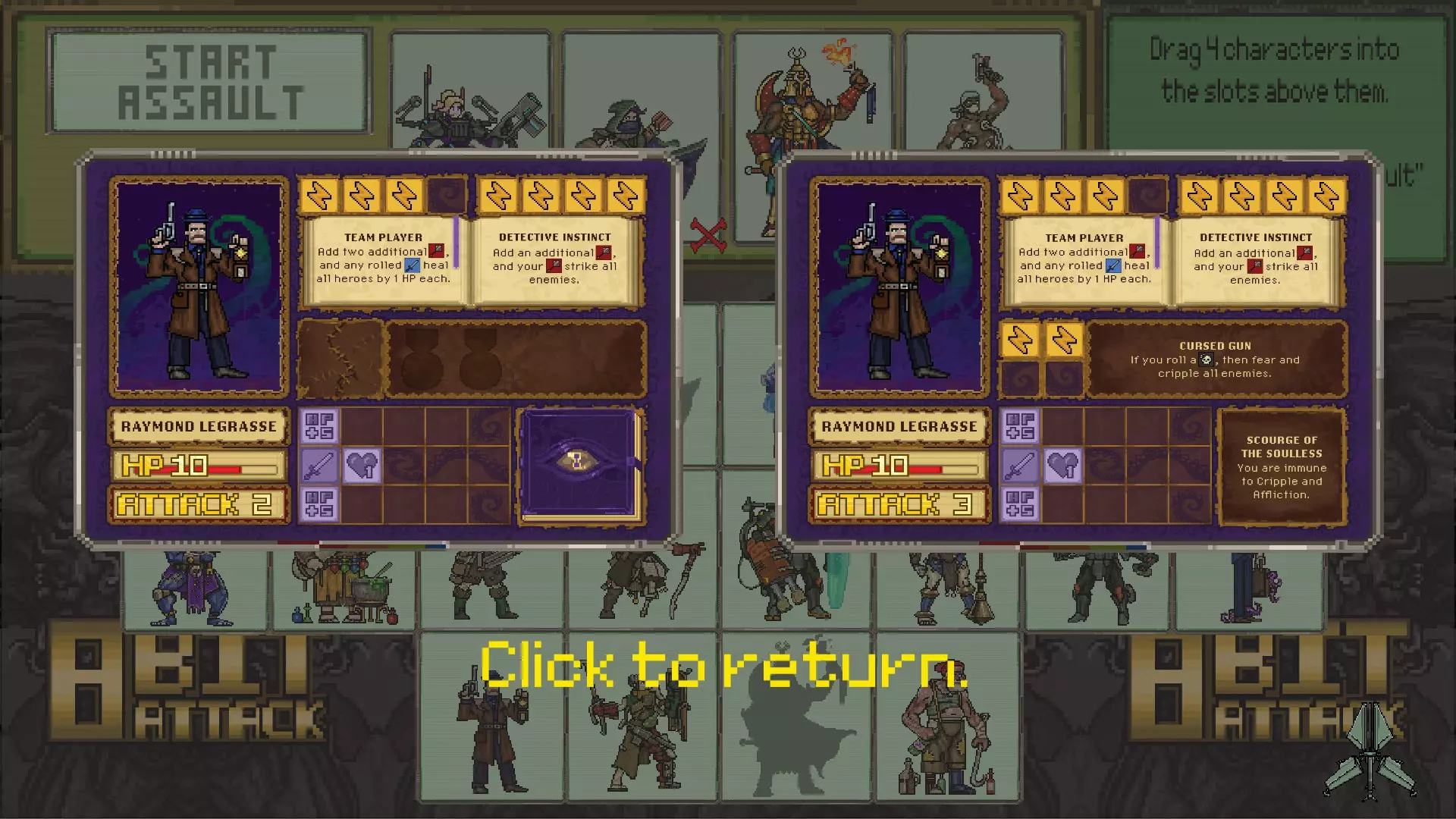 虽然我组建这支队伍的全部目的就是尽可能让这两个英雄存活更久,以便能一击秒杀更强的 bosses,但这也是两个英雄配合默契的绝佳示例。 另一个很好的例子是雷蒙德·勒格拉斯和亨特医生——亨特医生可以使用【强化】技能,之后雷蒙德会在亨特医生的【外科手术】技能基础上,为所有人额外恢复1点生命值,同时还能为队伍额外增加4点伤害输出。