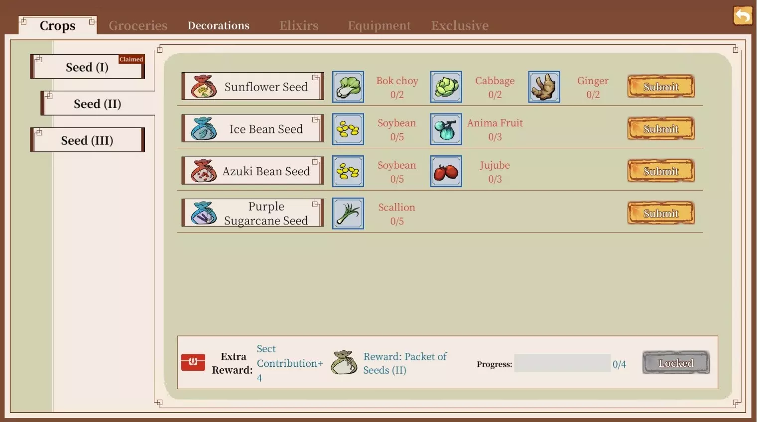 你也可以通过击败怪物获得种子,那些灌木状(通常掉落蔬菜种子)和花朵状(偶尔掉落花卉种子)的移动灌木丛也会掉落种子。我在雨花坞和归云山庄找到了一些,往前探索可能还会有更多。解锁更多种子(研发扩展) 若你想提前了解通过研发扩展解锁种子所需的条件,具体如下: 种子I: 糯米:需5个优质小麦 黄瓜:需5个优质土豆 胡萝卜:需5个优质白菜 红辣椒:需3个优质红枣和3个优质灵果 种子II: 向日葵:需2个优质白菜、2个优质卷心菜、2个优质生姜 冰豆:需5个优质大豆、3个优质灵果 红豆:需5个优质大豆、3个优质红枣 紫甘蔗:需5个优质大葱 种子III: 冬瓜:需3个传奇甜瓜 菊花:需1个优质芸苔花、1个优质向日葵 天离根:需3个优质胡萝卜、3个优质生姜柿子:通过5次优质番茄的机会和微调。不同类型的作物,其机会似乎有所不同。例如,获得优质甚至特级桑叶要比获得优质甚至特级小白菜容易得多。