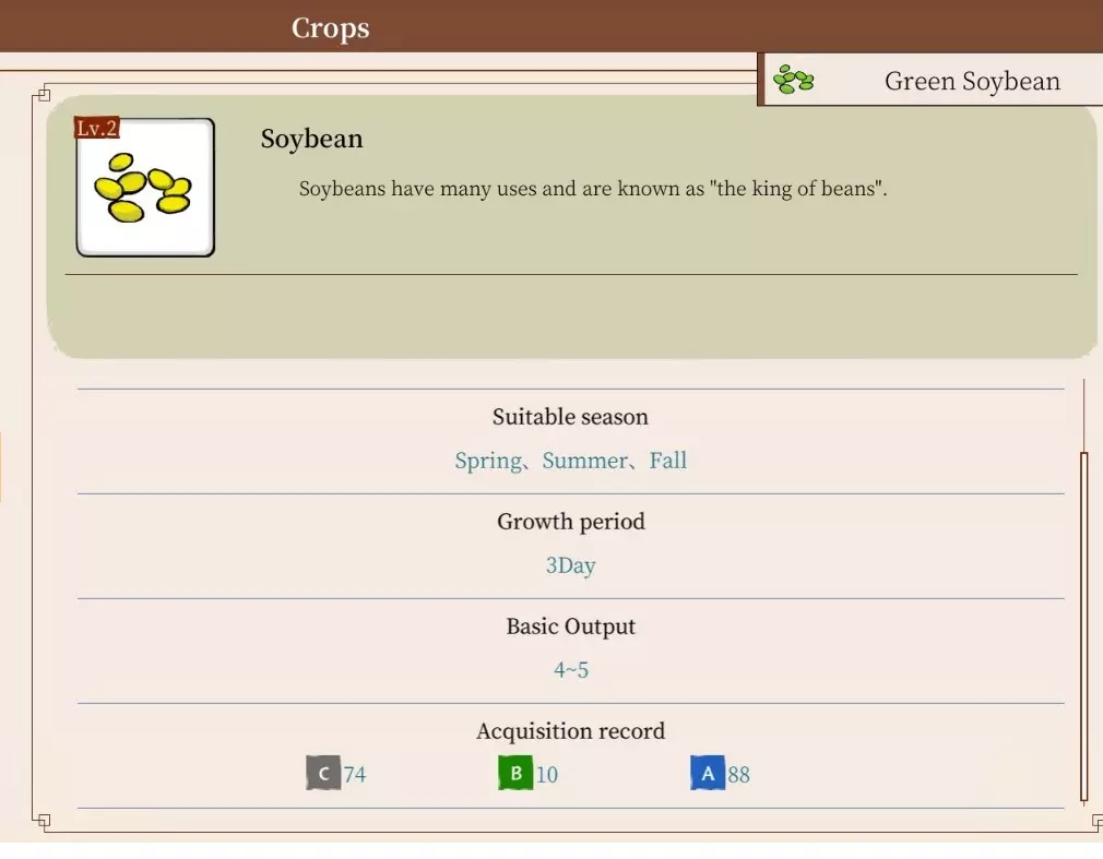 一次冰豆的收获。首次收获后,你的笔记会记录该植物及其生长习性(例如最佳生长季节等),以及收获的作物数量和品质。