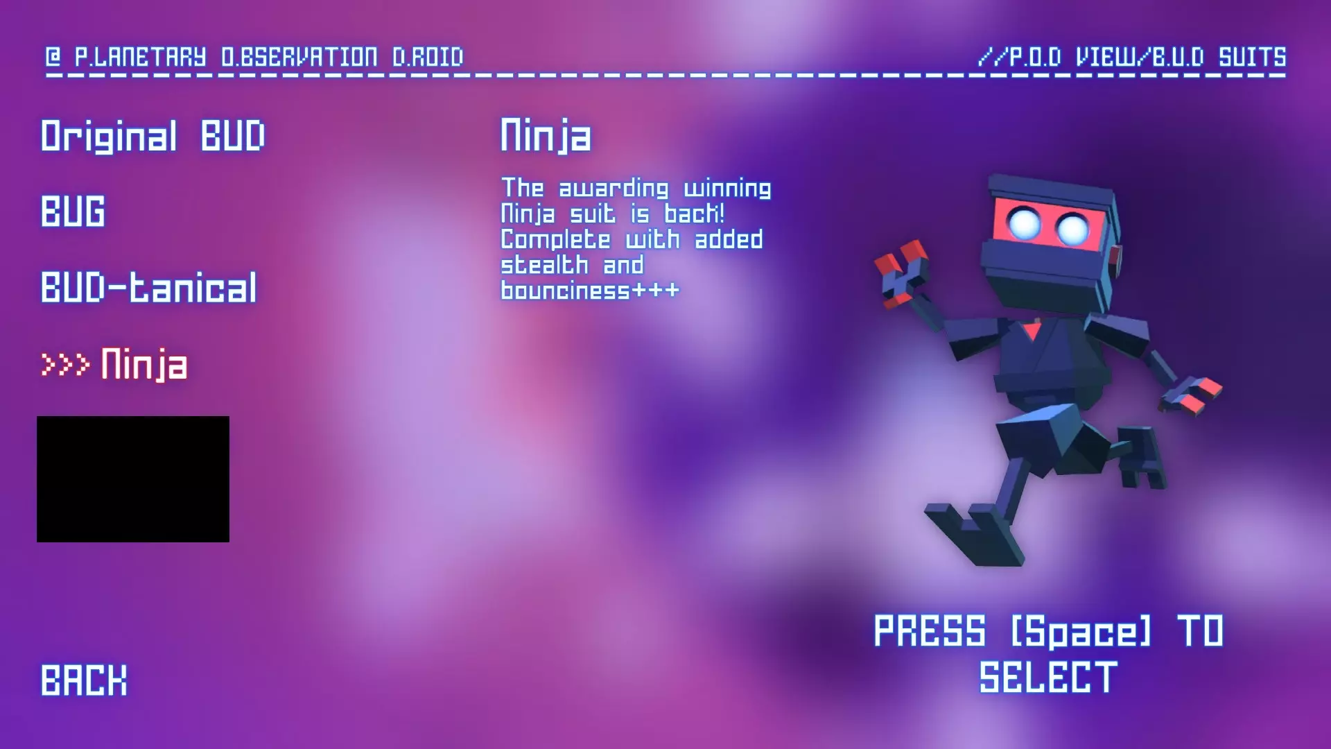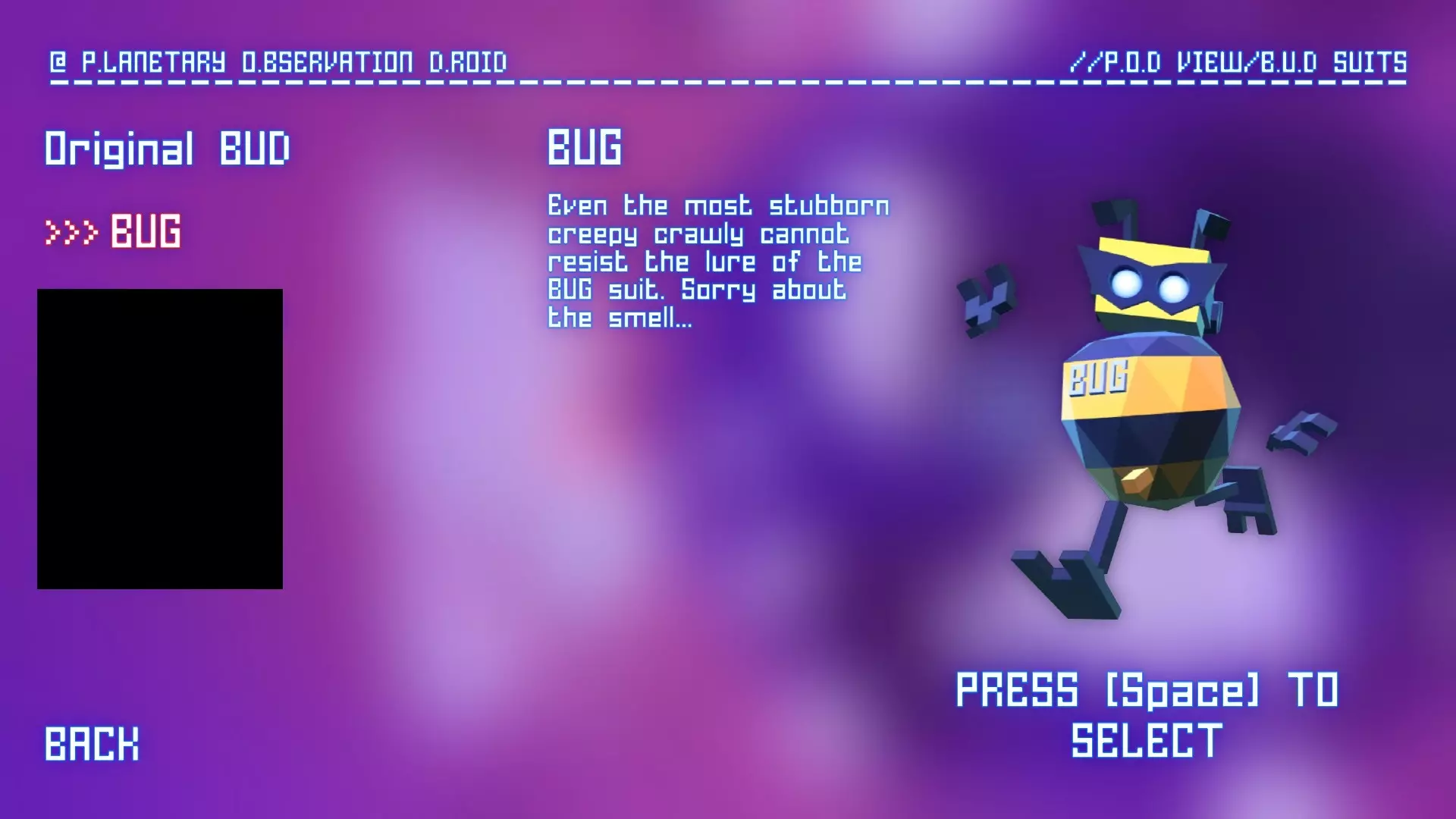 昆虫套装 解锁方法:完成1个POD挑战。 能力:似乎能让所有飞行昆虫跟随你。没有已知的实际好处(除了看起来很可爱)。 常规外观/描述