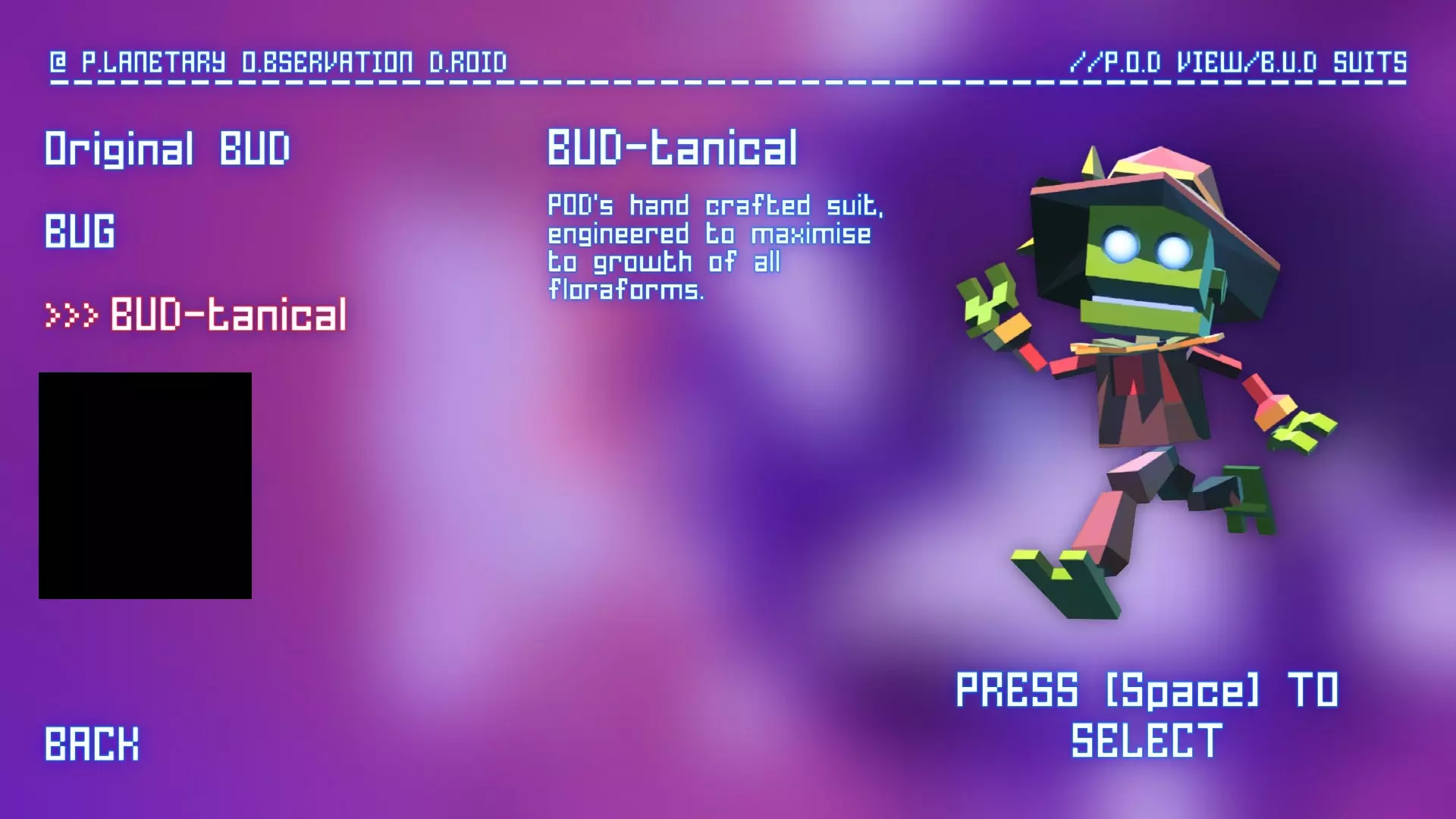 BUD植物套装 解锁方法:完成5个POD挑战。 能力:BUD种植的所有植物形态都会变为2倍大小,并且效果似乎更显著(例如,能将你弹得/抛得/射得更高) 常规外观/描述