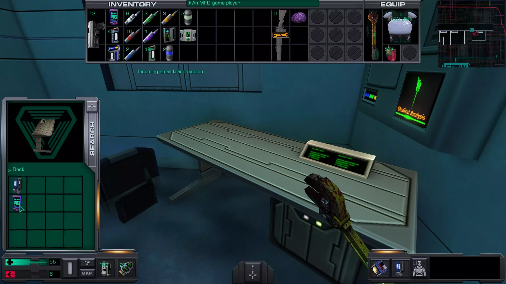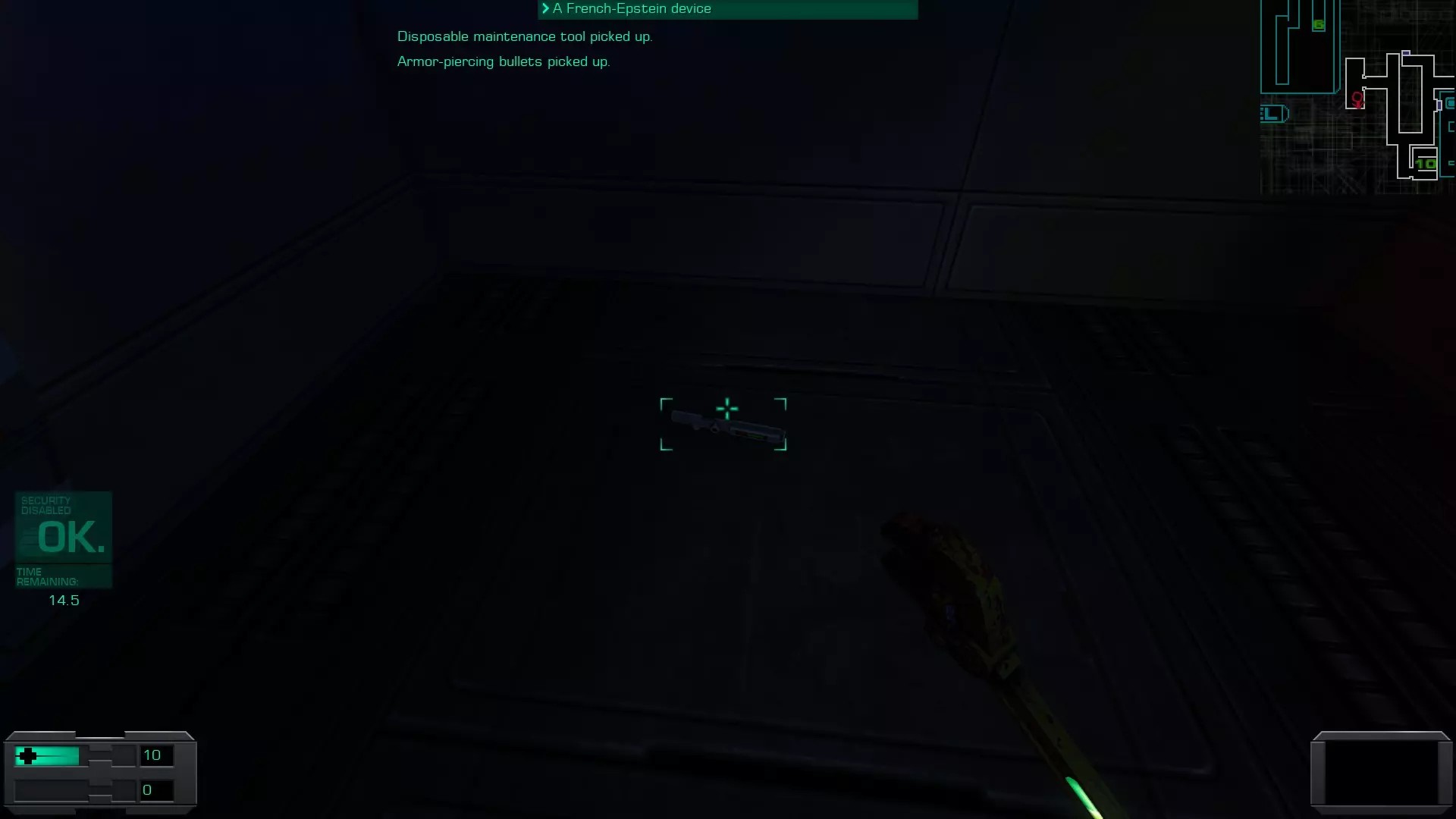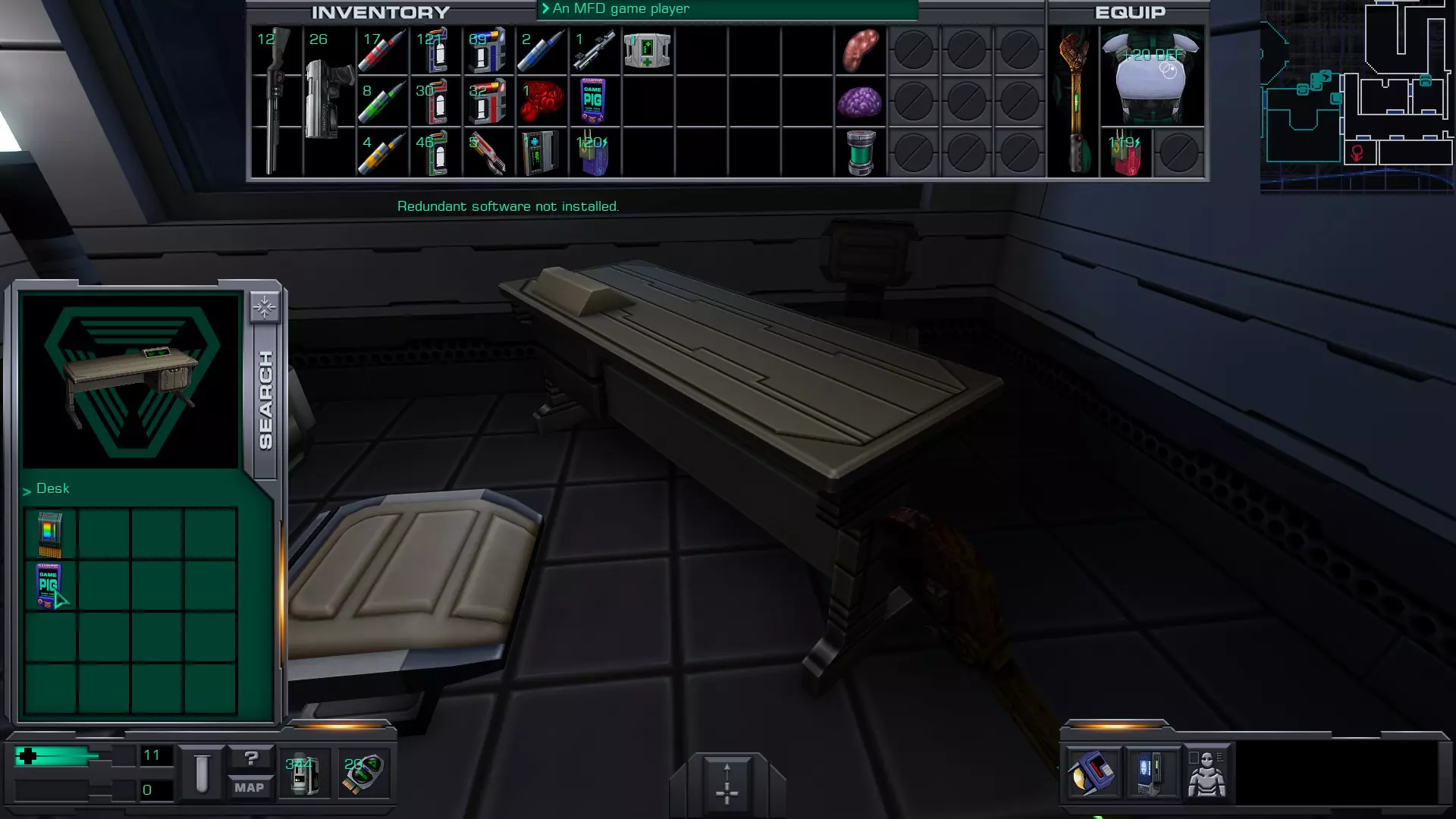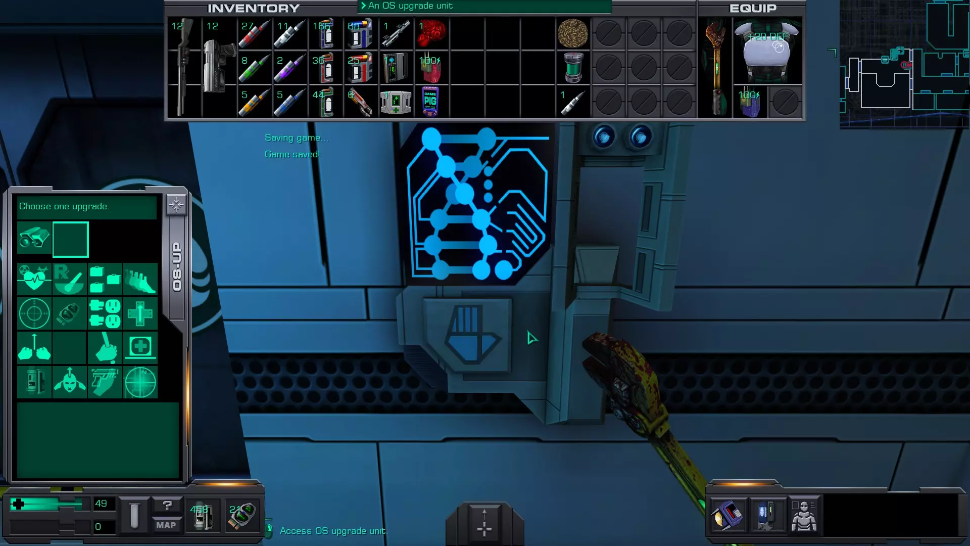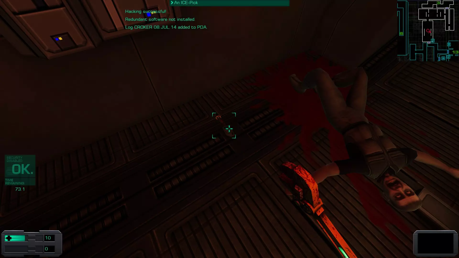准备工作:用回形针启动 破解GAMEPIG掌上游戏机 实际上,虽然你能获得GAMEPIG,但在游戏的这个阶段你无法破解它。即使在简单难度下,你在这个甲板上能获得的神经机械模块数量也不足以将你的黑客技能提升到6级。 GAMEPIG掌上游戏机在船上随处可见,但医疗/科学甲板上已经能找到一些。 你也可以使用ICE破解器道具来立即破解GAMEPIG。不过,这些道具要到游戏后期才能获得。