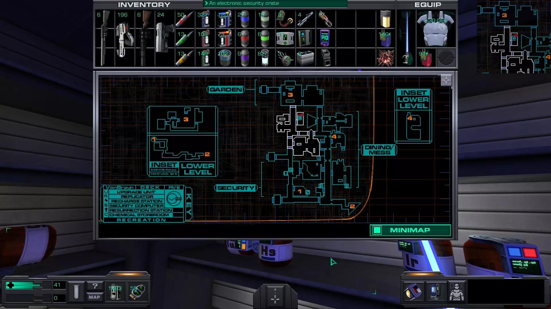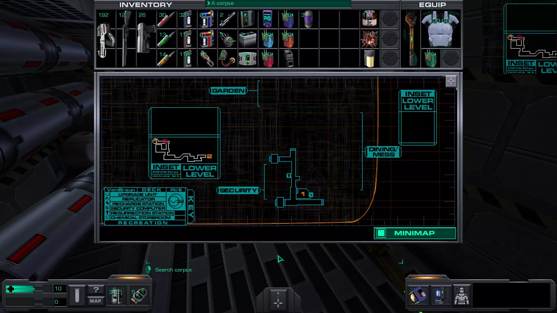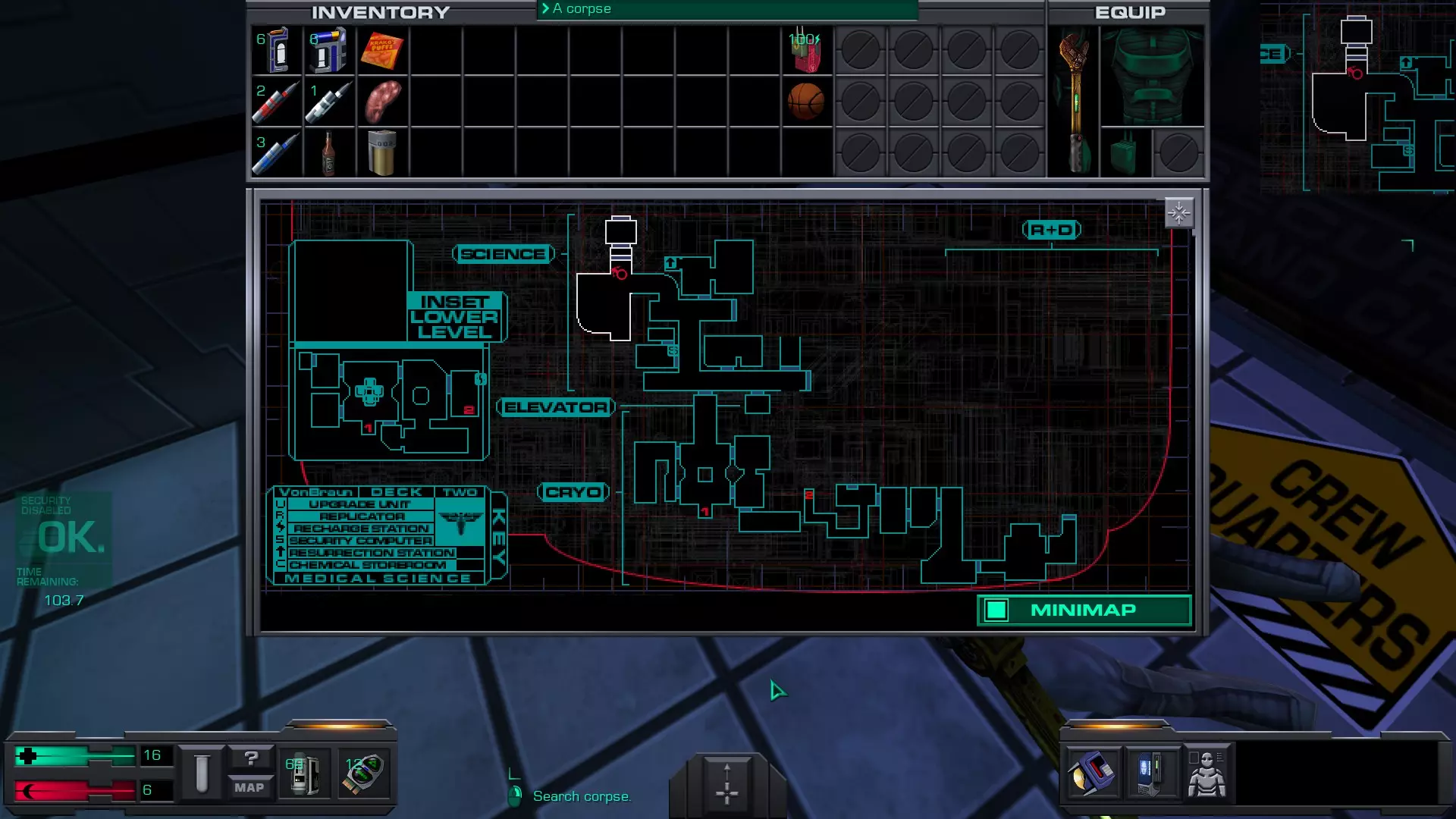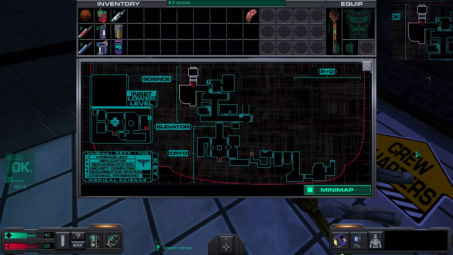 娱乐甲板 在安保区域维修隧道内的一具尸体上。可以先修复然后破解安保区域的门进入,或者向东走,找到一个观察室,从那里可以向下进入维修隧道的尽头。