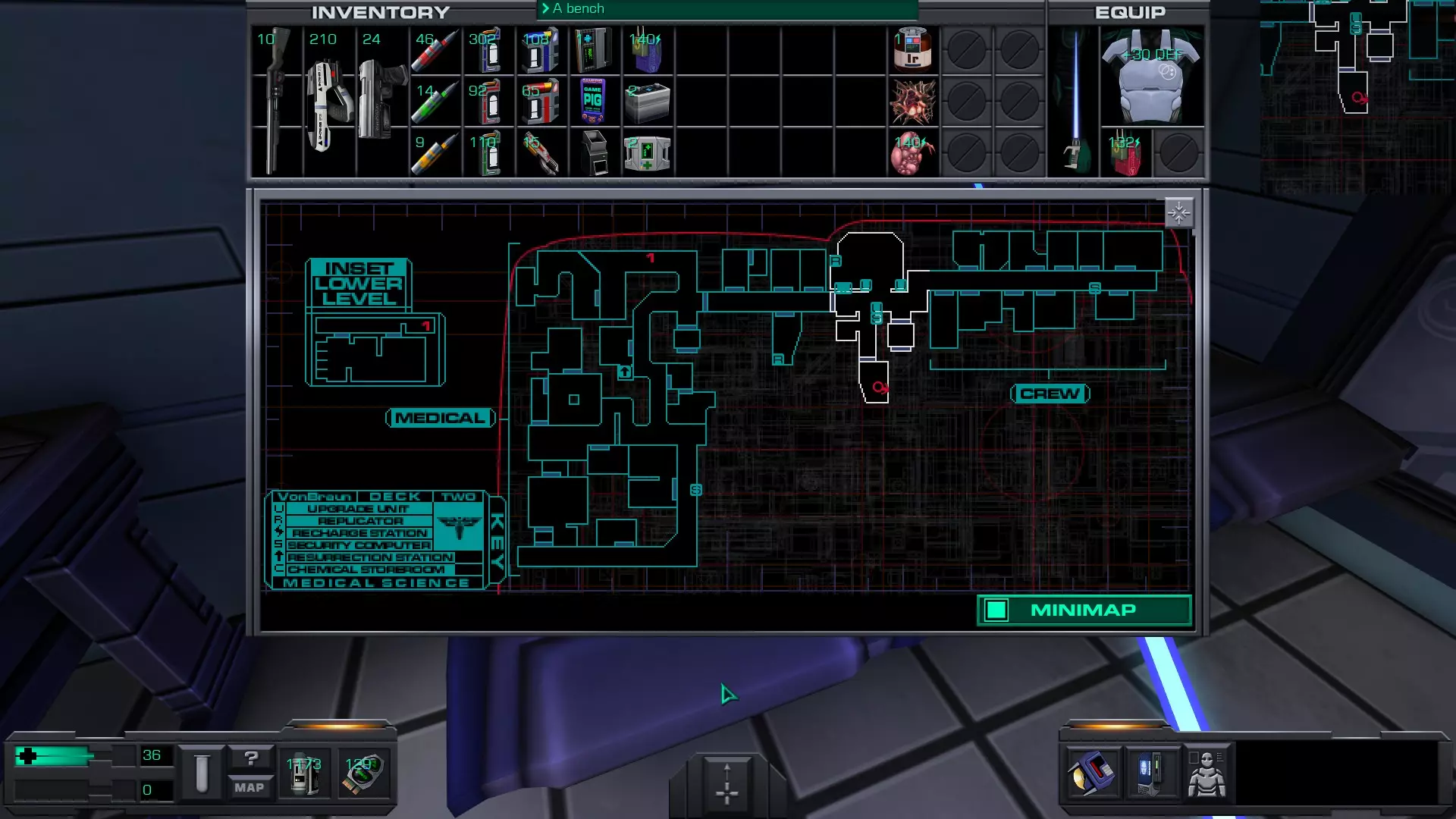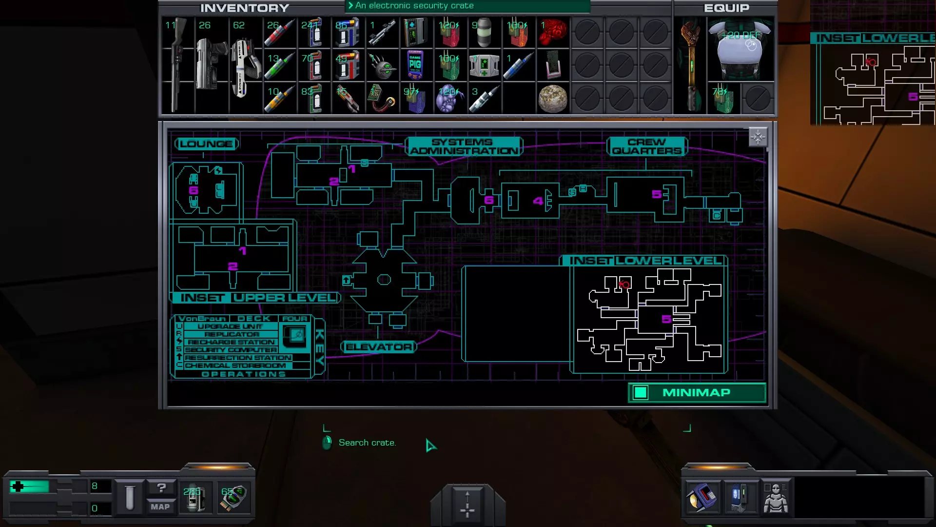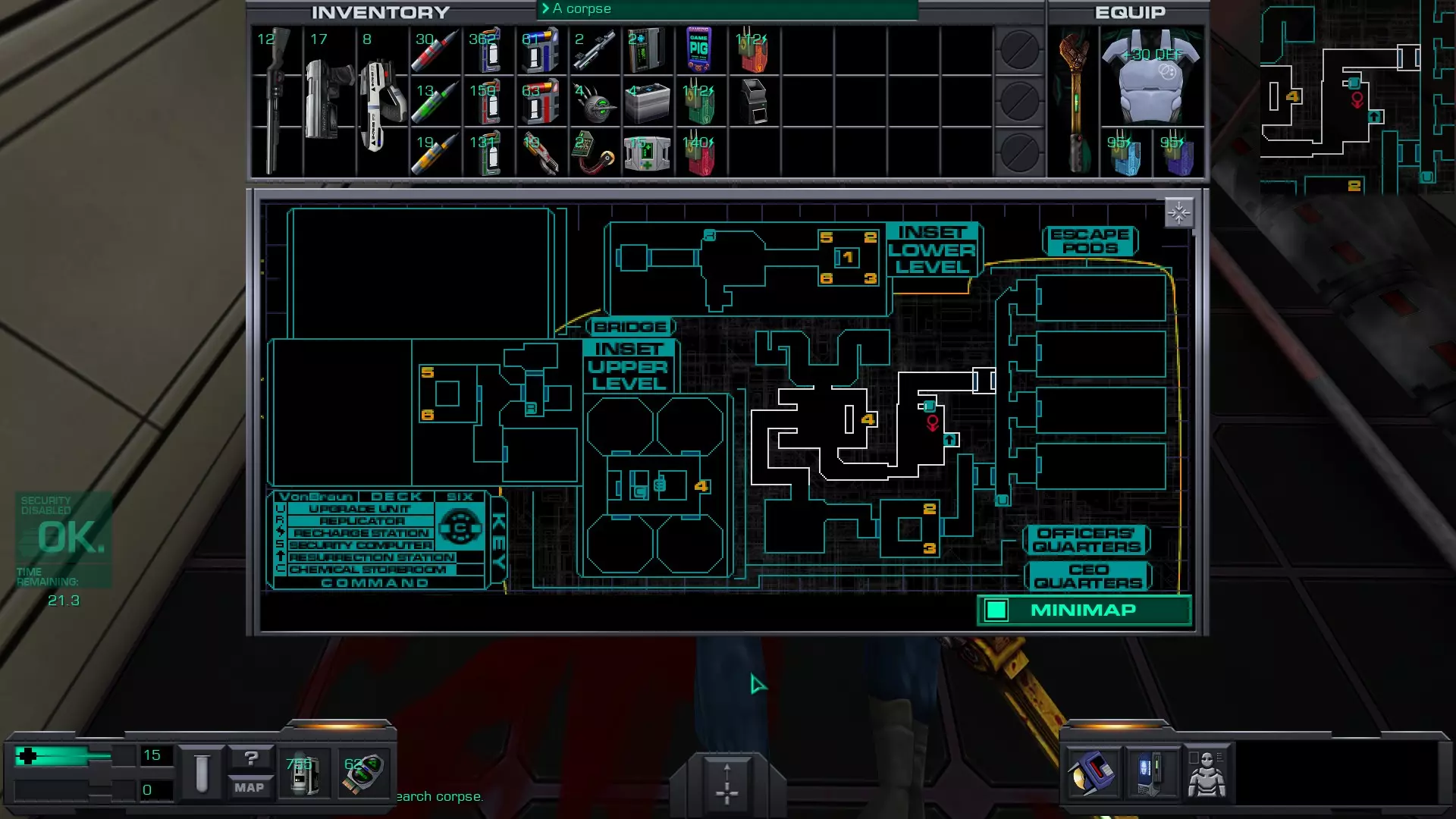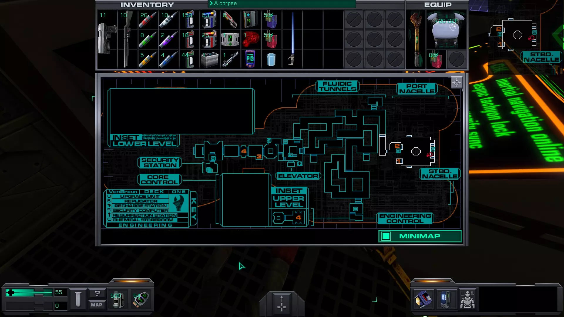 娱乐甲板 在安保区域维修隧道内的一具尸体上。可以先修复然后破解安保区域的门进入,或者向东走,找到一个观察室,从那里可以向下进入维修隧道的尽头。