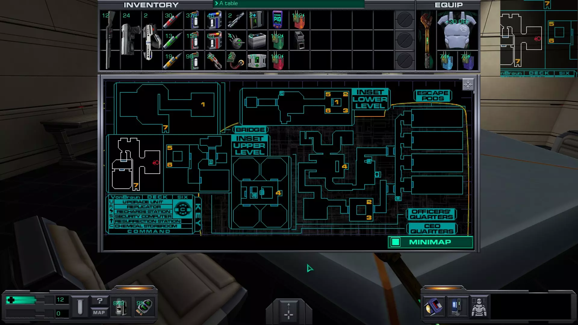 指挥甲板 舰桥的一张桌子下方,靠近一个发射火箭的炮塔。