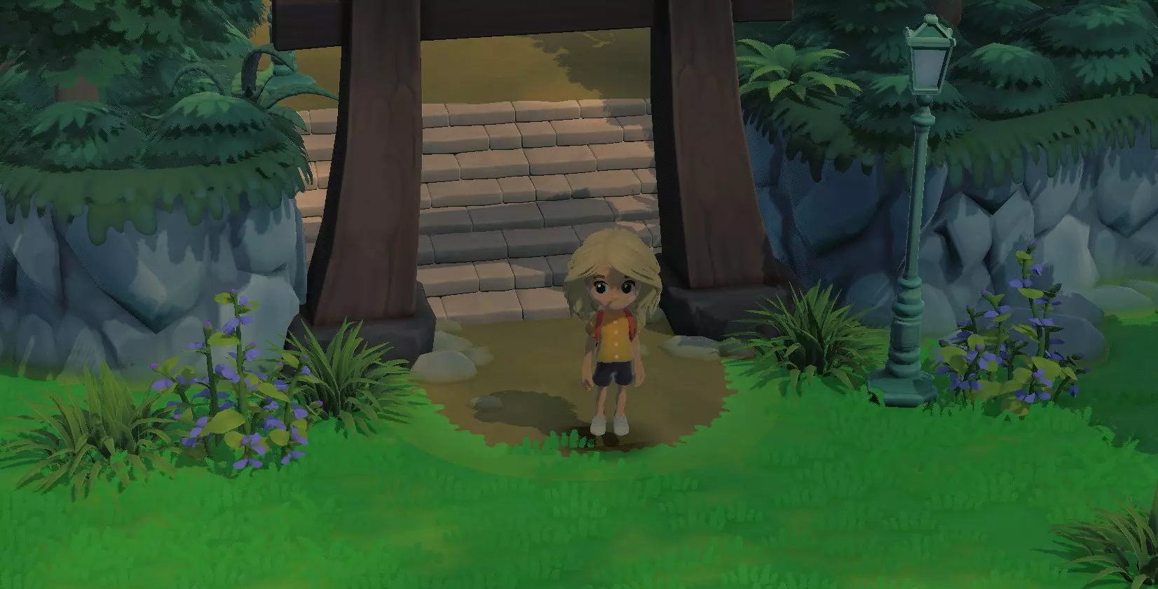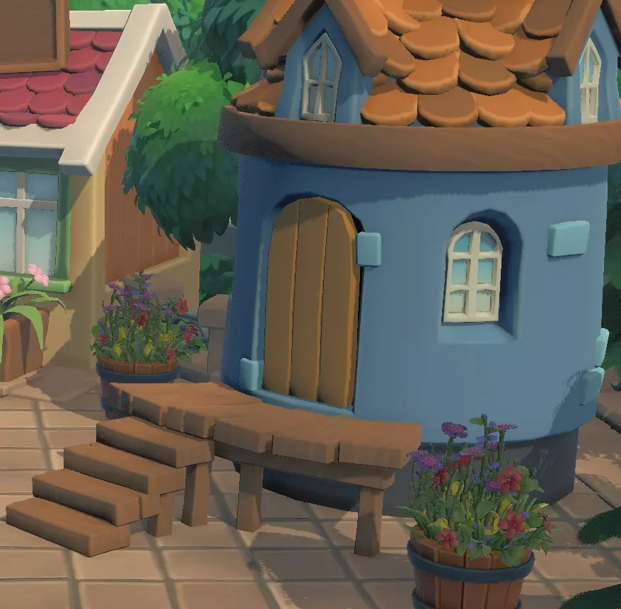 只需将这两个物品(床和纸灯笼)放置在房屋内,第一间房子就完成了。玩家可以通过房屋旁的告示牌更换居民,以及编辑房屋的墙壁和屋顶(这些需要在罗莎的建筑事务所购买)。一旦玩家拥有自己的第一间房子,就会获得一个邮箱。此外,从这时起,莫斯商店里会出现一台电脑。玩家可以通过这台电脑,使用创作者代码购买其他玩家的物品和家具,还能上传自己的设计。 为草坪建造楼梯
