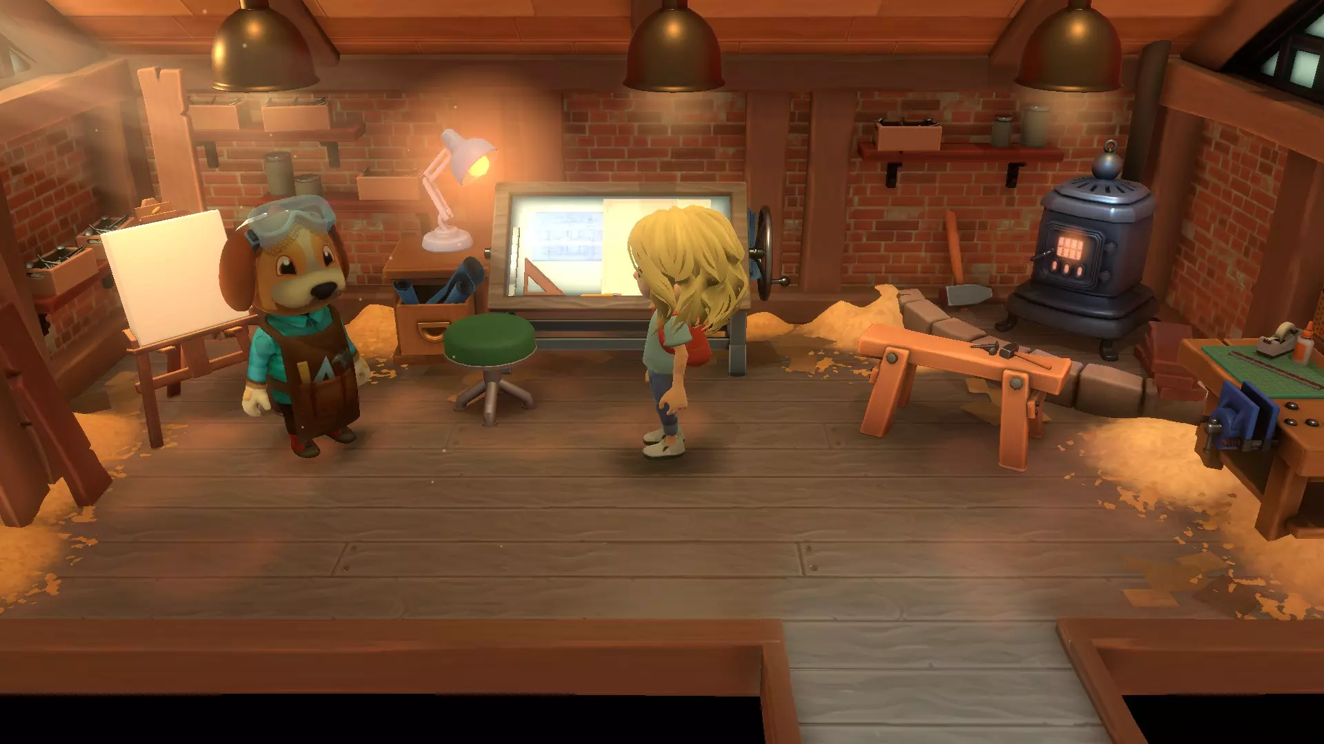 萨莉的工坊分为不同区域:制造台和设计桌。要在制造台上制造或进一步加工物品,必须向萨莉付费解锁该功能。同样,要在设计桌上制作例如家具的设计图,也需要向萨莉付费解锁特定的设计图。之后,你就可以在《哈克小镇》的设计桌上自由发挥创意,设计自己的家具了。游戏过程中还会解锁更多设计图。 建造桥梁 初期,草地区域被一条河流隔开。玩家需要向萨莉建造一座桥梁,才能探索草地的另一部分。为此,一方面需要解锁【小桥】设计图并准备好所需材料(木材)。接着,玩家可以在设计桌根据个人喜好设计一座桥(初期用一块木板也可以)。完成的设计图会保存在自己的背包中。现在,玩家可以走到地图上想要过河的位置,从背包中放置桥梁。 建筑事务所
