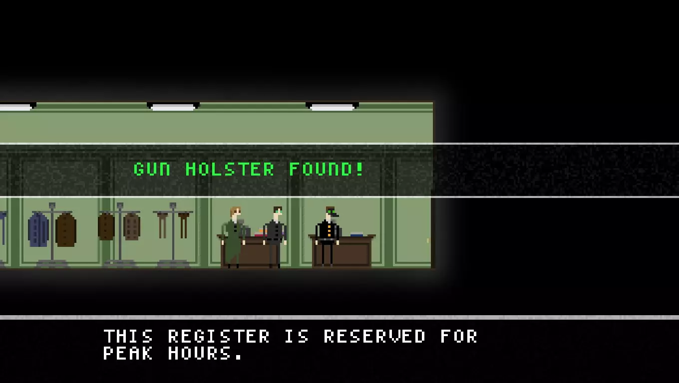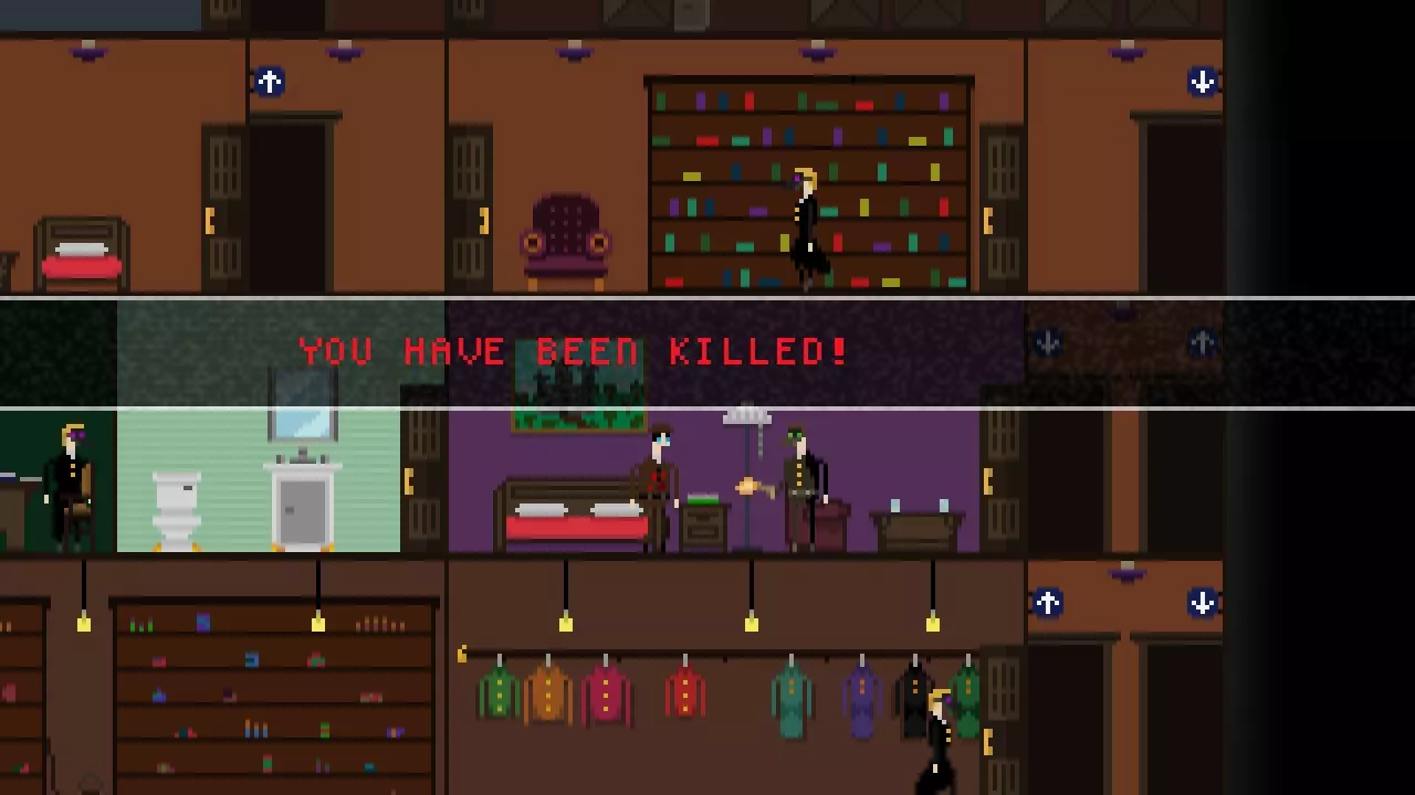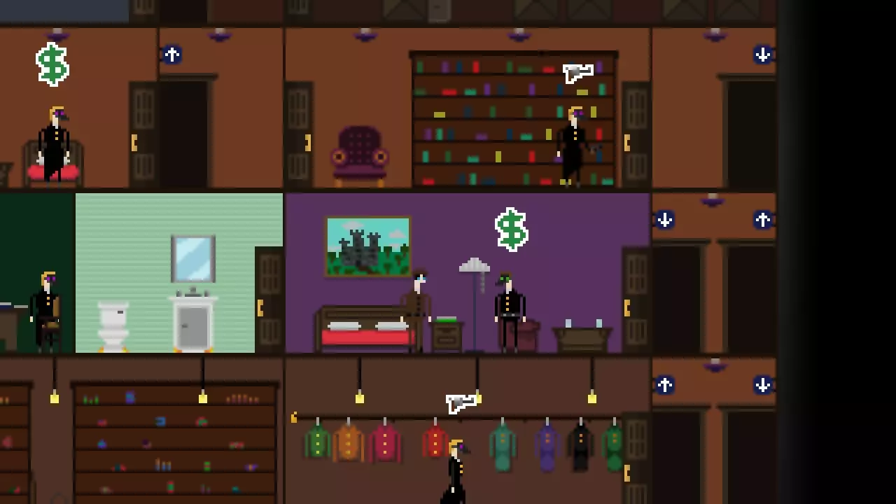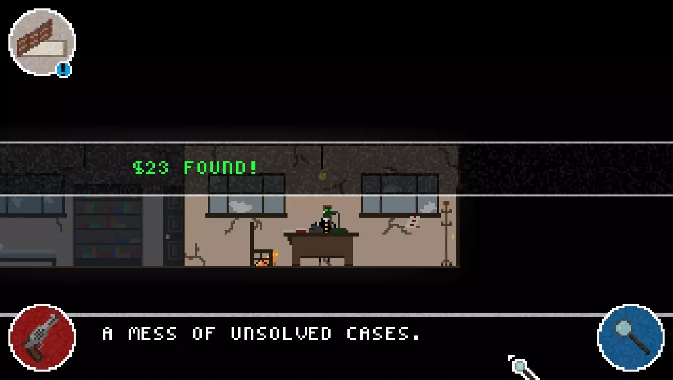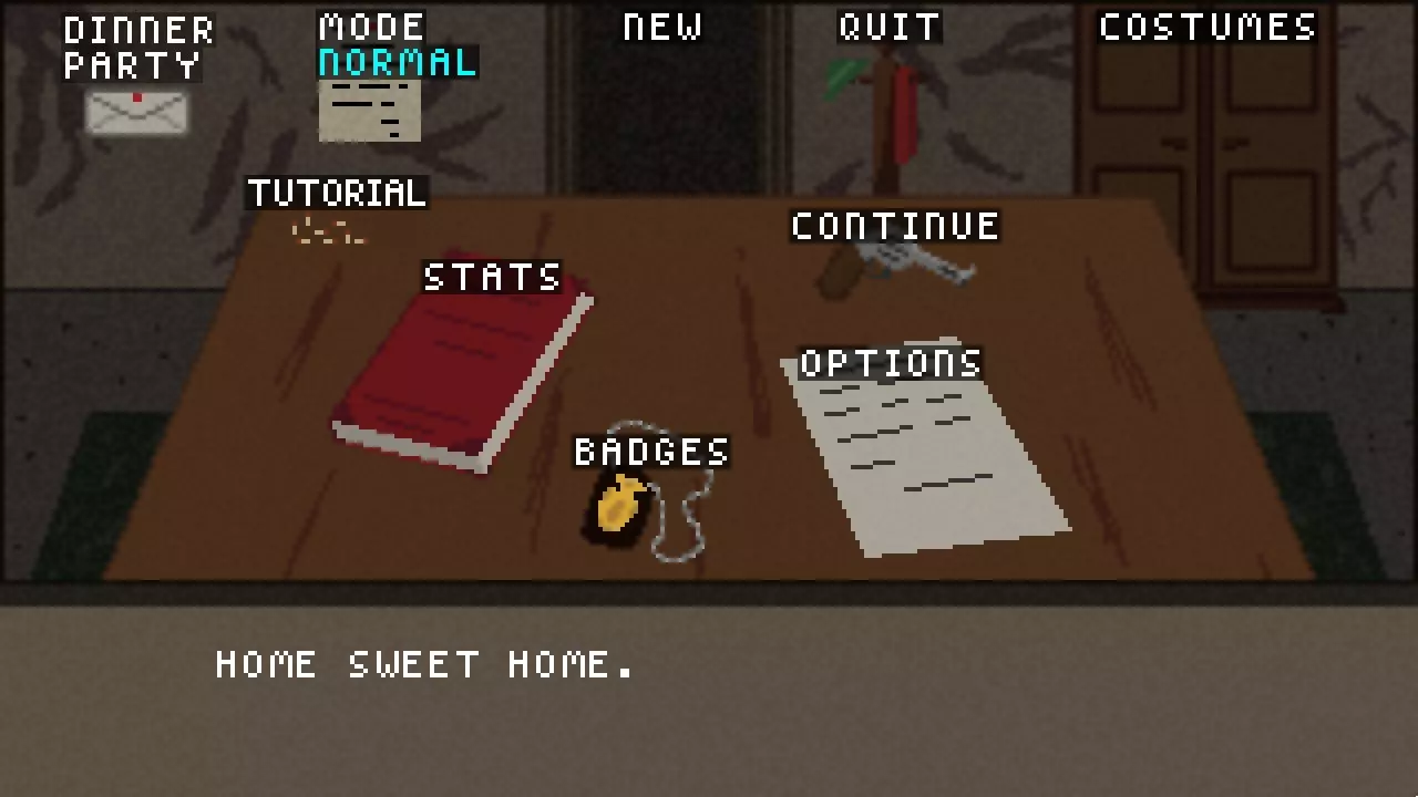 晚宴派对:选择此项将启动晚宴派对模式,具体说明如下。 模式:点击此项可更改难度,该难度同时适用于常规游戏和晚宴派对模式。游戏共有三种难度:普通、困难和不可能。 新游戏:开始新游戏 退出:退出游戏 服装:可使用衣柜选择不同服装。解锁新服装需要服装碎片,这些碎片可在常规模式中购买或在晚宴派对模式中获得。 教程:简要介绍故事背景、 controls 及部分游戏基础玩法。 统计:列出你的总体数据,包括已结案总数、食物总消耗量、游戏游玩次数及其他多项数据。徽章:此页面显示你已解锁的徽章以及解锁所需条件,同时会显示你当前的侦探等级。获得更多徽章可在未来的游戏流程中解锁额外奖励。 继续:继续进行中的游戏。游戏仅能从地图界面进行保存。 选项:允许你重新绑定 controls(按键)、选择游戏是否全屏以及调整音量大小。 controls(按键操作)相当简单直观。 默认情况下,方向键用于左右移动角色。 Z键用作通用行动按钮。你可以使用Z键与他人交谈、从商贩处购买物品、撬锁、开门以及搜索区域寻找线索和其他物品。 X键用于射击。角色会向其面朝的方向发射一发子弹。一颗子弹足以杀死任何人,包括你。 按C键可打开笔记本。 地图 地图是玩家在不同地点间移动的方式。 访问一个地点会使时间推进一天,如果14天后仍未找到凶手,玩家将失败。
