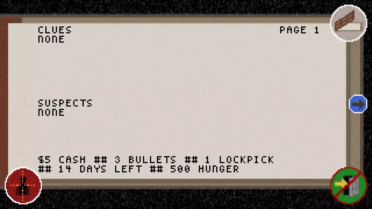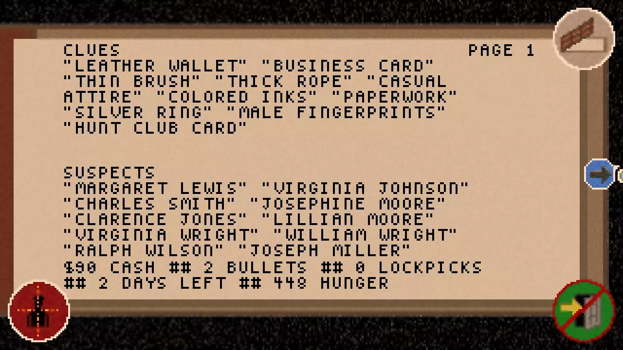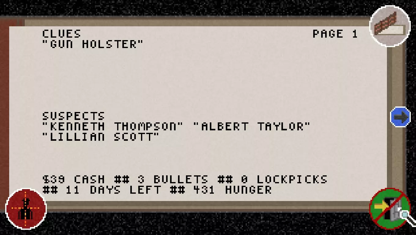 如我们所见,目前还没有发现任何线索,也没有了解到任何嫌疑人。 在底部我们可以看到当前的现金、子弹和开锁器数量。 我们还能看到剩余时间以及饥饿程度。 右上角的笔记本图标用于关闭笔记本。 箭头或方向键用于在页面之间切换。 左下角的准星图标用于进入罪犯界面。 右下角的门图标用于保存并退出游戏,但这只能在地图界面进行操作。 接下来的两页会是这样的。