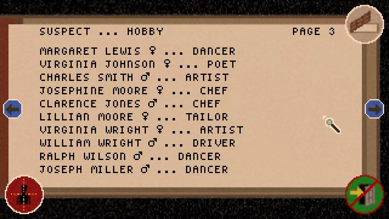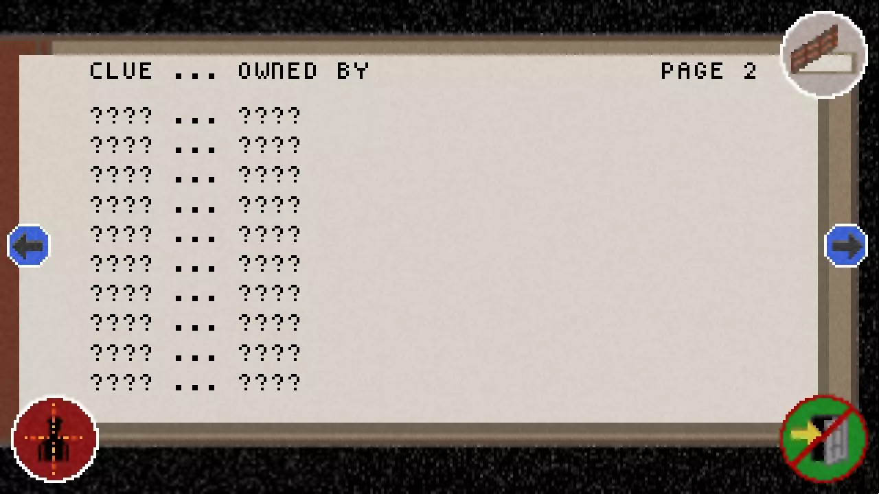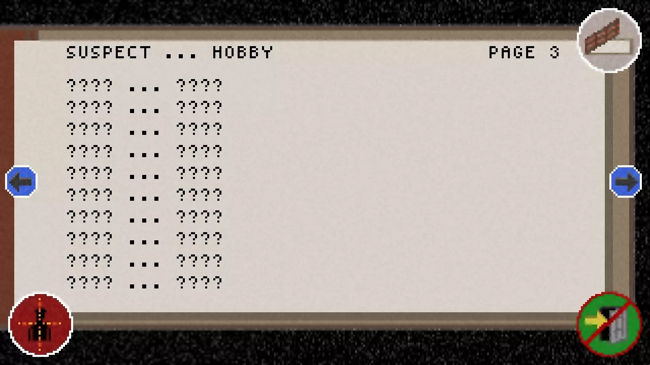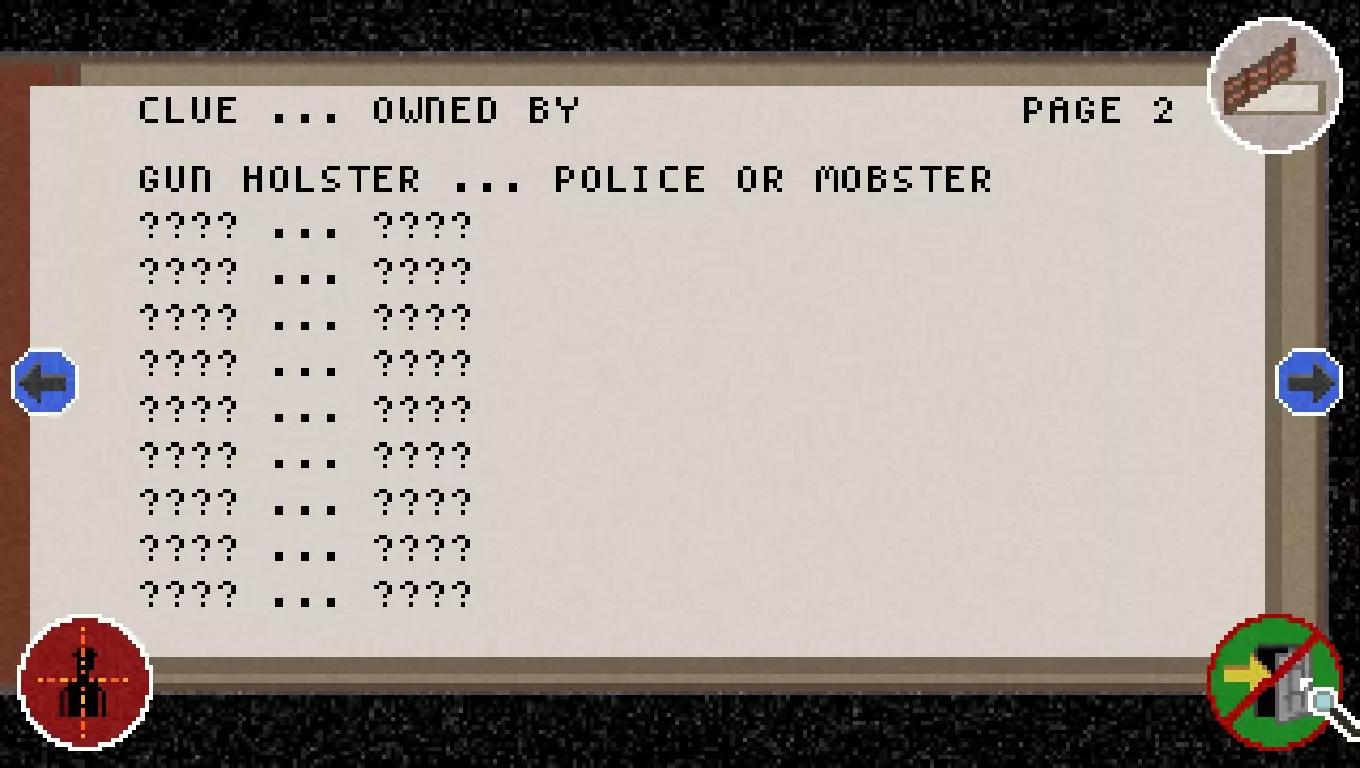 如我们所见,目前还没有发现任何线索,也没有了解到任何嫌疑人。 在底部我们可以看到当前的现金、子弹和开锁器数量。 我们还能看到剩余时间以及饥饿程度。 右上角的笔记本图标用于关闭笔记本。 箭头或方向键用于在页面之间切换。 左下角的准星图标用于进入罪犯界面。 右下角的门图标用于保存并退出游戏,但这只能在地图界面进行操作。 接下来的两页会是这样的。