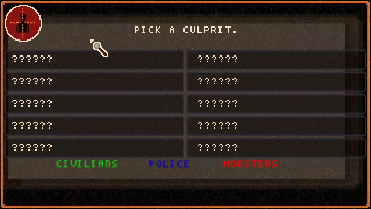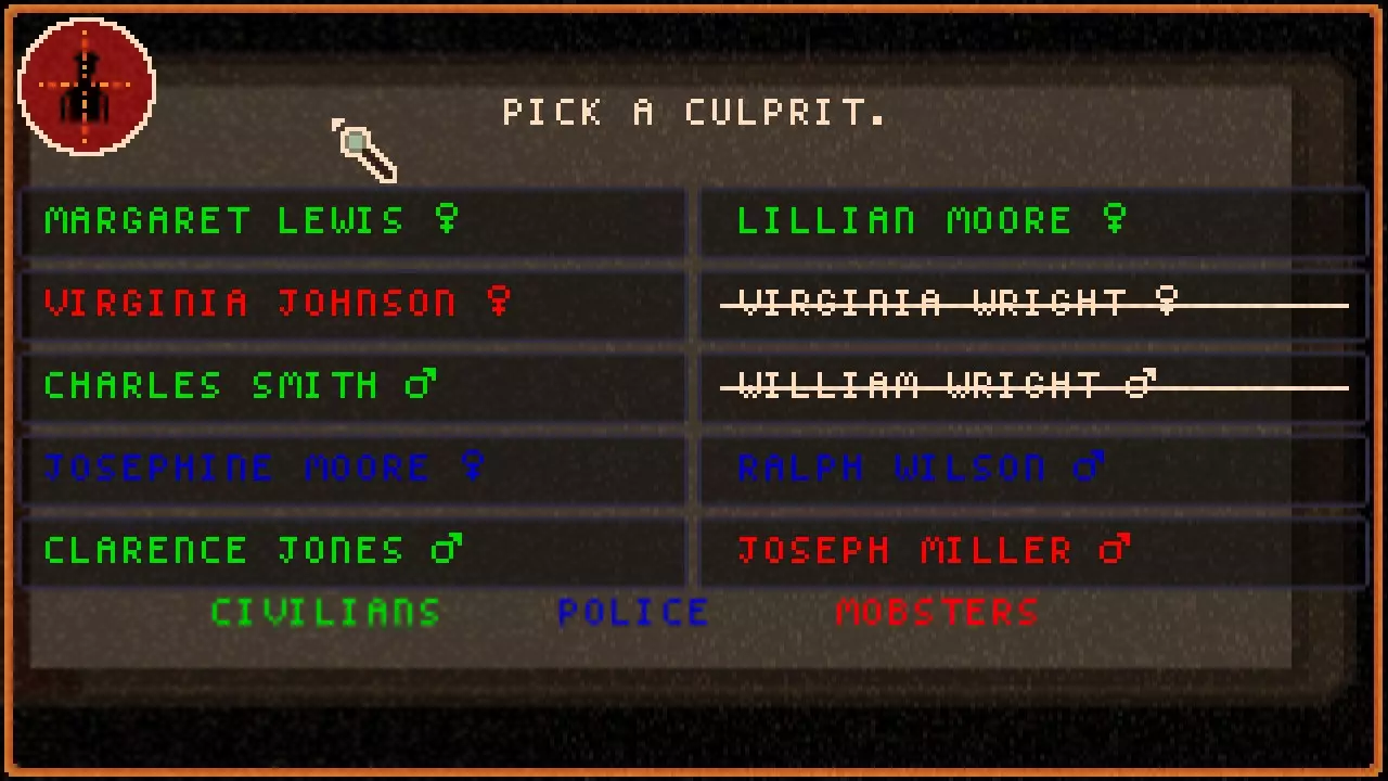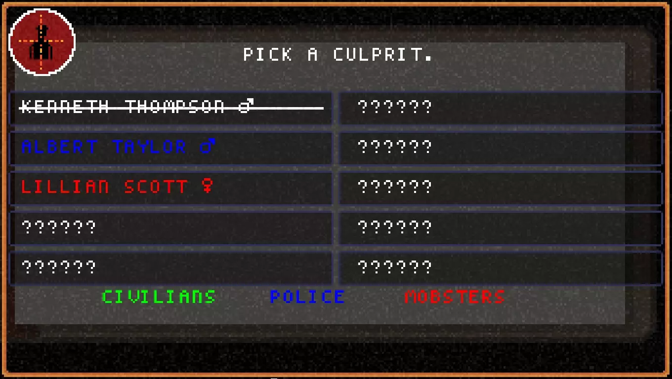 线索能为你提供关于凶手的信息,用于排除嫌疑人。 枪套线索表明凶手一定属于警察或黑帮,因此我们得知所有已知的平民嫌疑人都是无辜的。 一旦我们找到足够的线索,并了解到足够多的嫌疑人以缩小范围,就能找到凶手并将其逮捕。 关于此流程的更多信息可在笔记本部分查看。 嫌疑人 拥有所有线索固然重要,但我们需要的第二件事是嫌疑人的名字。 我们通过与人交谈来了解新的嫌疑人。 和搜索类似,交谈会消耗饥饿值。 在普通难度下交谈消耗4点饥饿值,困难难度消耗6点,不可能难度消耗8点。