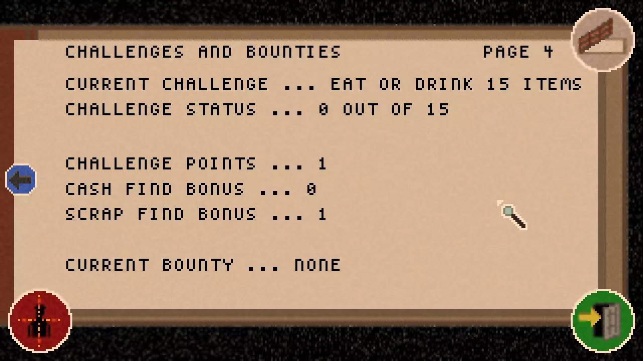 你可以通过走到环境中的物体旁,按下Z键或点击右下角的放大镜图标来进行搜索。 屏幕中间会显示我们找到的物品信息,在这个例子中是23美元。 屏幕底部则会显示我们搜索的物体相关信息。 搜索会消耗饥饿值,消耗的数量根据难度不同而有所变化:普通难度消耗2点,困难难度消耗4点,不可能难度消耗6点。 你可以对同一区域进行两次搜索,也可以在没有任何物品的区域(例如屏幕上的空白区域)进行搜索。 无论是否找到物品,搜索都会消耗饥饿值。 通过搜索,我们可以像上面那样找到金钱,还能找到开锁器、子弹(?)、服装碎片(在晚宴模式中)以及线索。