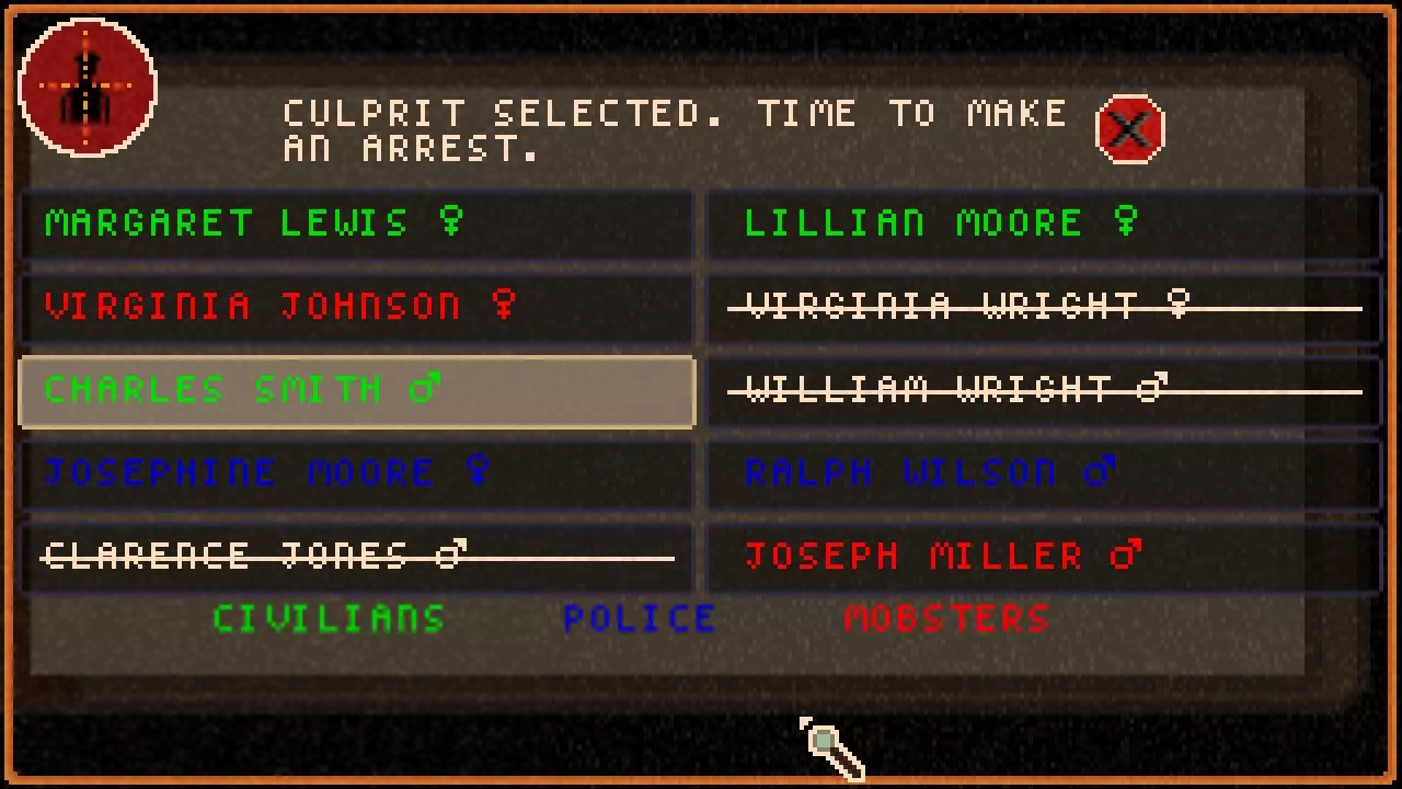 这里我们再次看到所有已知的嫌疑人,以及他们所属的派系。平民显示为绿色,黑帮成员显示为红色,警察显示为蓝色。白色且带有删除线的名字是已被玩家或阿努比斯杀死的已知嫌疑人。你有可能误杀凶手,导致游戏无法获胜。目前我们已经知道凶手是谁,但有时你会得到多个名字,此时了解目标所属派系可以帮助你进一步缩小范围,锁定正确的罪犯。不过就目前情况而言,我们已经确定凶手就是查尔斯·史密斯。
