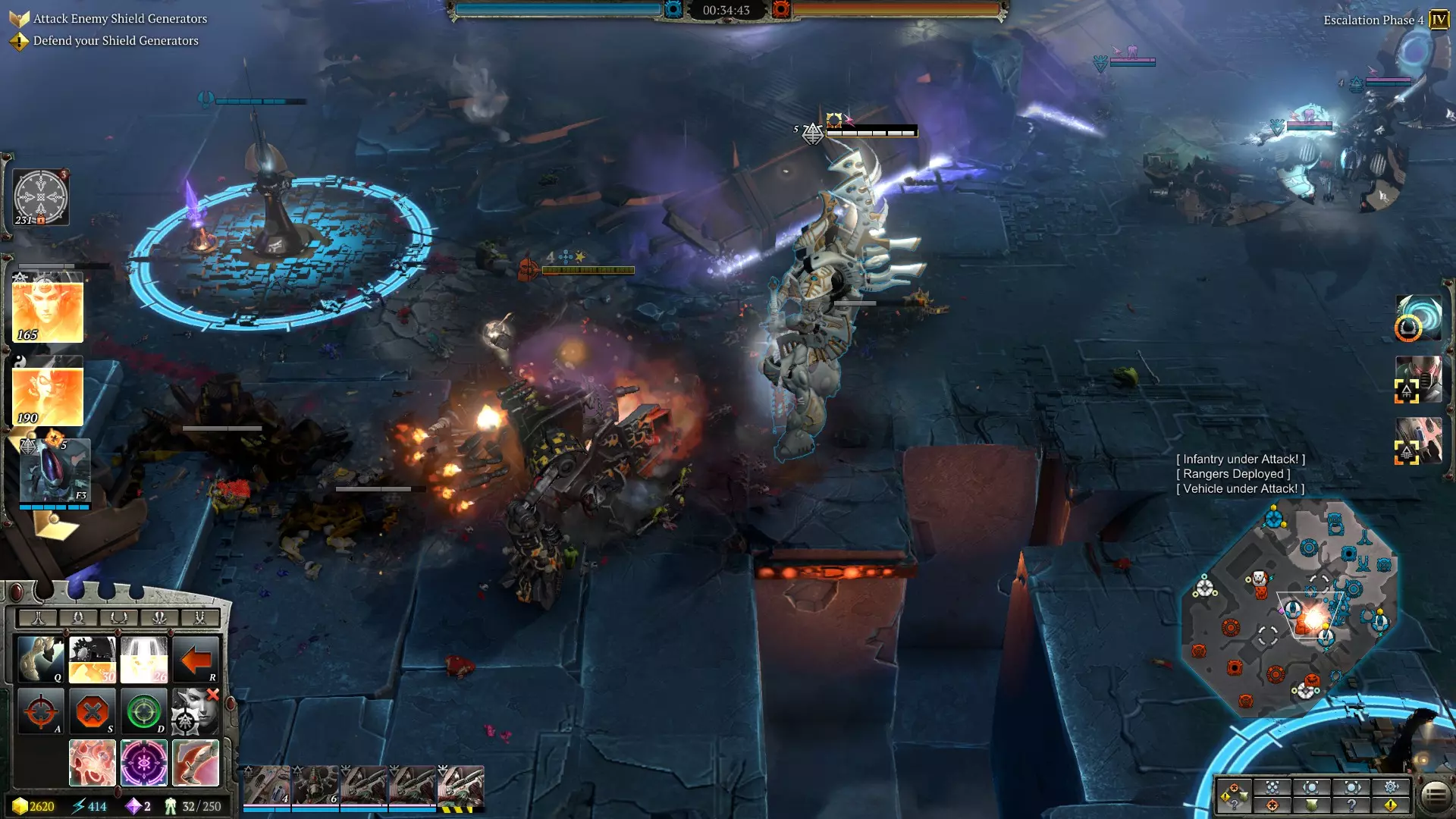 微操地狱 你可能已经猜到,《战锤40K:战争黎明3》是一款重度微操的游戏。每个种族都有大量具备可用技能的单位,精英单位自身也拥有数种技能。通过升级还能获得更多技能(例如战术星际战士的火焰喷射器),这使得需要记住和使用的快捷键数量不断增加。另一个迫使玩家进行微操的因素是军队规模,与《战锤40K:战争黎明2》相比,本作的军队规模相当庞大。为了更好地管理,部队必须被分配到多个控制组中,可以共享控制组,也可以单独编组。在《战锤40000:战争黎明3》的激烈战斗中,与其说是战术的较量,不如说是速度的考验。由于多支部队的联合火力和技能能让敌方军队迅速溃败,因此需要玩家高度专注并快速反应。