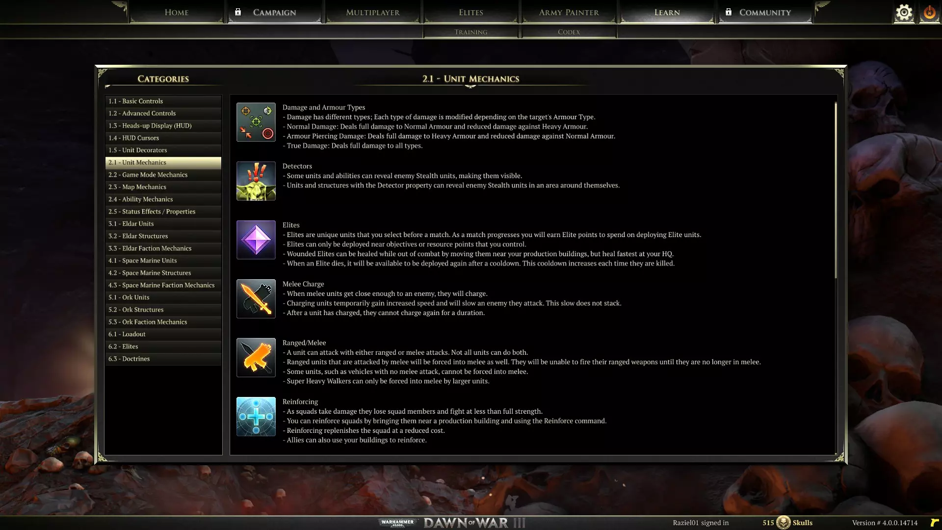 查看游戏内的圣典 我已经介绍了《战锤40000:战争黎明3》的一些重要机制和特色,但要全面涵盖所有内容需要大量时间和篇幅。请查看位于【学习】标签下的游戏内圣典,以获取关于《战锤40000:战争黎明3》玩法机制的详细信息。