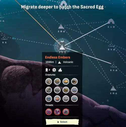 探索者 在每个生物群系中完成一个关卡 你总是从家乡水域开始,最终在火山生物群系结束。只需确保沿途也访问所有其他生物群系: 海藻森林 洞穴 盐池 选择关卡时,注意连接各个不同地点的线条。当你选择关卡时,这些线条会被高亮显示。