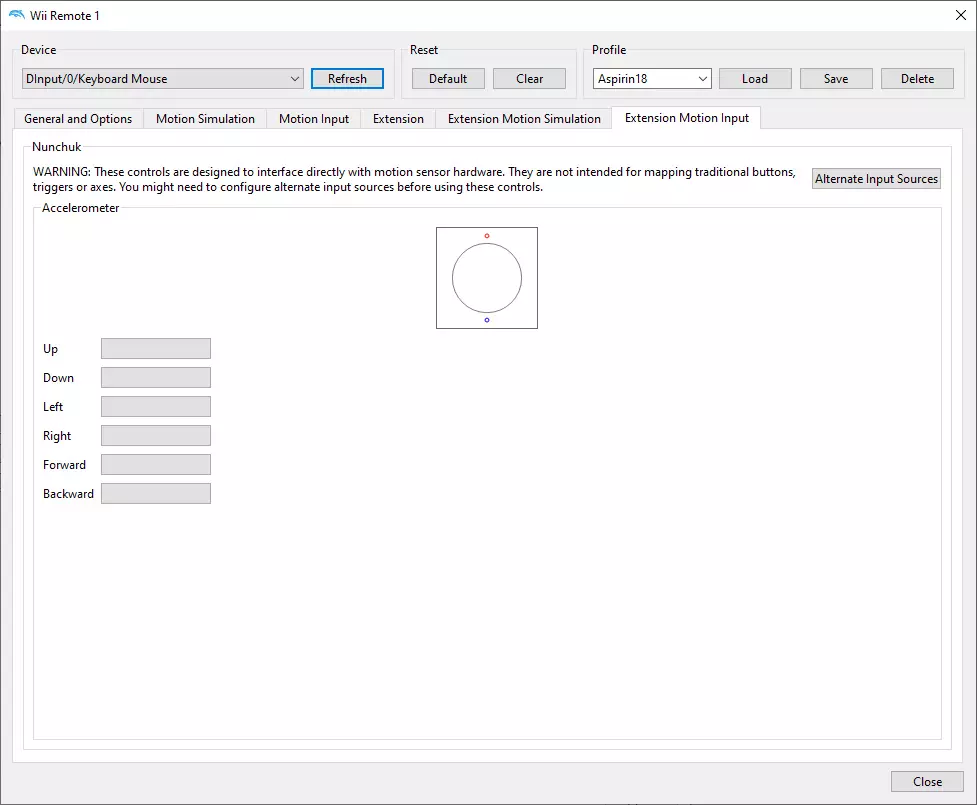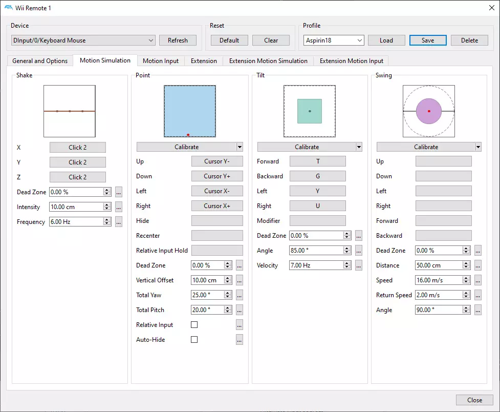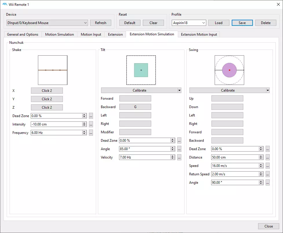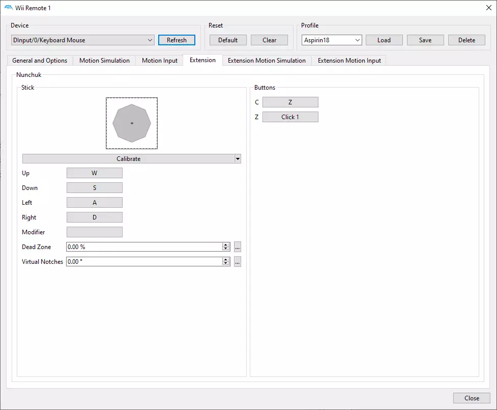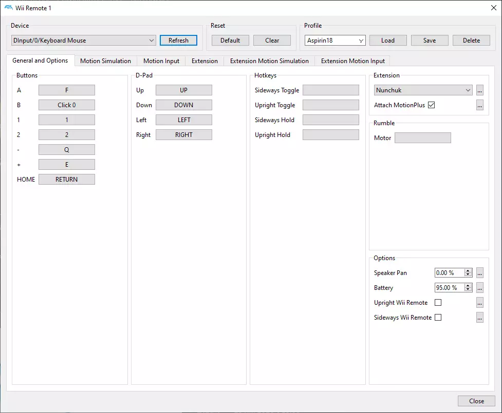 下载游戏 我想你知道该做什么以及怎么做。 设置模拟器 重要的是先配置模拟器,然后再配置游戏。 进入【选项】—【控制器设置】—【Wii Remote 1】—【配置】部分。我们需要创建一个新配置文件。在【常规与选项】、【体感控制】、【扩展】等标签页中,按照截图中的设置来配置控制方式。