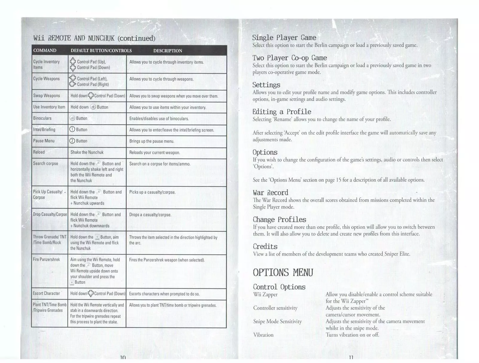游戏内控制: 移动 — W、S、A、D 射击 — 鼠标左键 瞄准镜 — 鼠标右键 装填 — 鼠标中键 望远镜 — Q 改变姿势 — Z 瞄准屏息 — F 点击游戏菜单按钮 — F 选择物品、使用急救包或绷带 — E 拾取其他武器 — 按住↓键 瞄准和望远镜模式下缩放 — 按住F,按W和S 切换武器 — ←键、→键 选择装备 — ↑键、↓键 投掷手榴弹、石头 — 按住鼠标左键,按鼠标中键 放置绊发手榴弹 — 按住F,按鼠标中键 放置TNT或定时炸弹 — 按住F,按鼠标中键 设置定时炸弹时间 — 按住F,按Y键减少;按住F,按U键增加 搜索尸体 — 按住F,按鼠标中键 搬运尸体 — 按住F,按G键 放下按住F键,按下T键。瞄准模式下略微侧身——右键。左箭头←,右箭头→ 使用坦克杀手射击——按下左键,按住F键,按住鼠标侧键,按下左键 潜行——多次点击W、S、A、D键(不确定是否有效) 地图和任务——1键 返回菜单——2键 回车——任天堂Wii主机菜单 说明书页面扫描图: