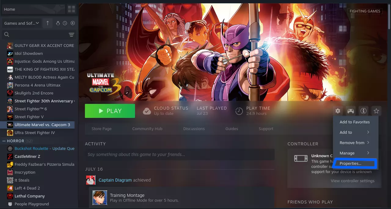 重新安装《终极漫画英雄VS卡普空3》 虽然可能并非必需,但建议完全卸载《终极漫画英雄VS卡普空3》以进行全新安装。 在Steam库中找到该游戏,点击齿轮图标>管理>卸载。