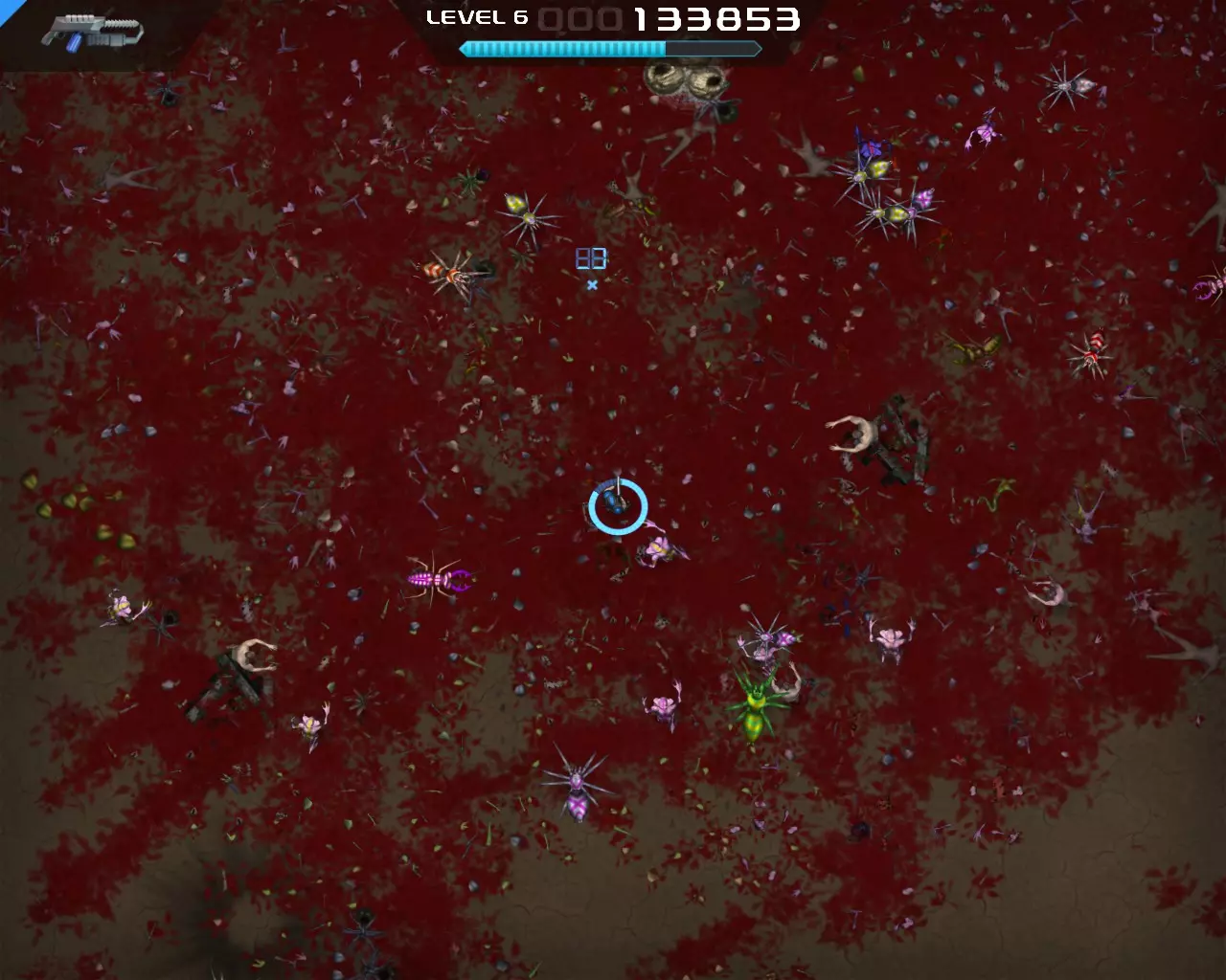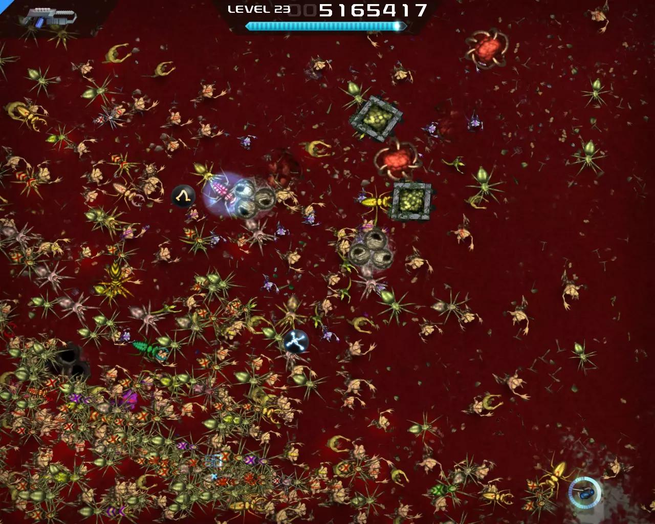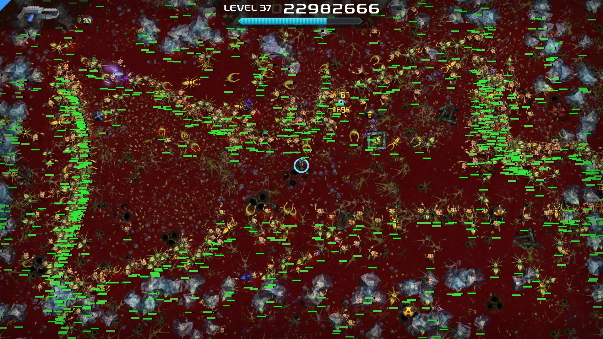 将提供的 perk 数量增加1和2。减少升级所需的经验值。在后期阶段几乎能立即升级。 策略 游戏初期可以用任何武器牵制怪物,此时只需选择所需的 perk。 中期阶段(15-20级)你将开始面临挑战。是时候使用分裂枪了(其实也可以更早)。此时你应该已经拥有坚韧装填者 perk。在这里你的生存能力会大幅提升,因为大部分时间你都会处于无敌状态,这得益于较长的技能冷却时间。 【火焰子弹】和【等离子超载】这两个增益效果要极其谨慎地选择,因为你将无法进行技能冷却。如果你身处怪物群中,绝对不能选择这两个增益,否则你会死亡。 到了后期阶段,你将无法击杀任何敌人,因为怪物的生命值会变得过高。这时你将不得不选择【等离子超载】。火焰子弹和等离子超载的增益时间会叠加,因此如果同时获得这两个增益,应先拾取火焰子弹,再拾取等离子超载。 不要指望火焰子弹,用它你也杀不了任何人。等离子超载的威力要大得多。 尽量始终选择减速。在减速状态下,你的伤害会提升10倍,但你会变得脆弱,因此不能穿过密集的敌人。 不过有时还是不得不穿过密集的敌人,这时闪避者和忍者这两个技能会保护你。在游戏后期,尽量跑到屏幕边缘附近,这样怪物会聚集在一起形成一大波。 小心那些红色的小怪物,它们的伤害非常高。 黄色的射击蜘蛛非常耐打。如果无法快速消灭它们,就离远一点,它们的攻击会打到其他怪物身上。 最好不要把注意力集中在黄色的复活怪物上。击杀普通敌人,因为它们会掉落奖励 截图