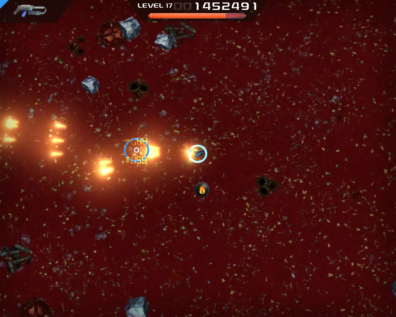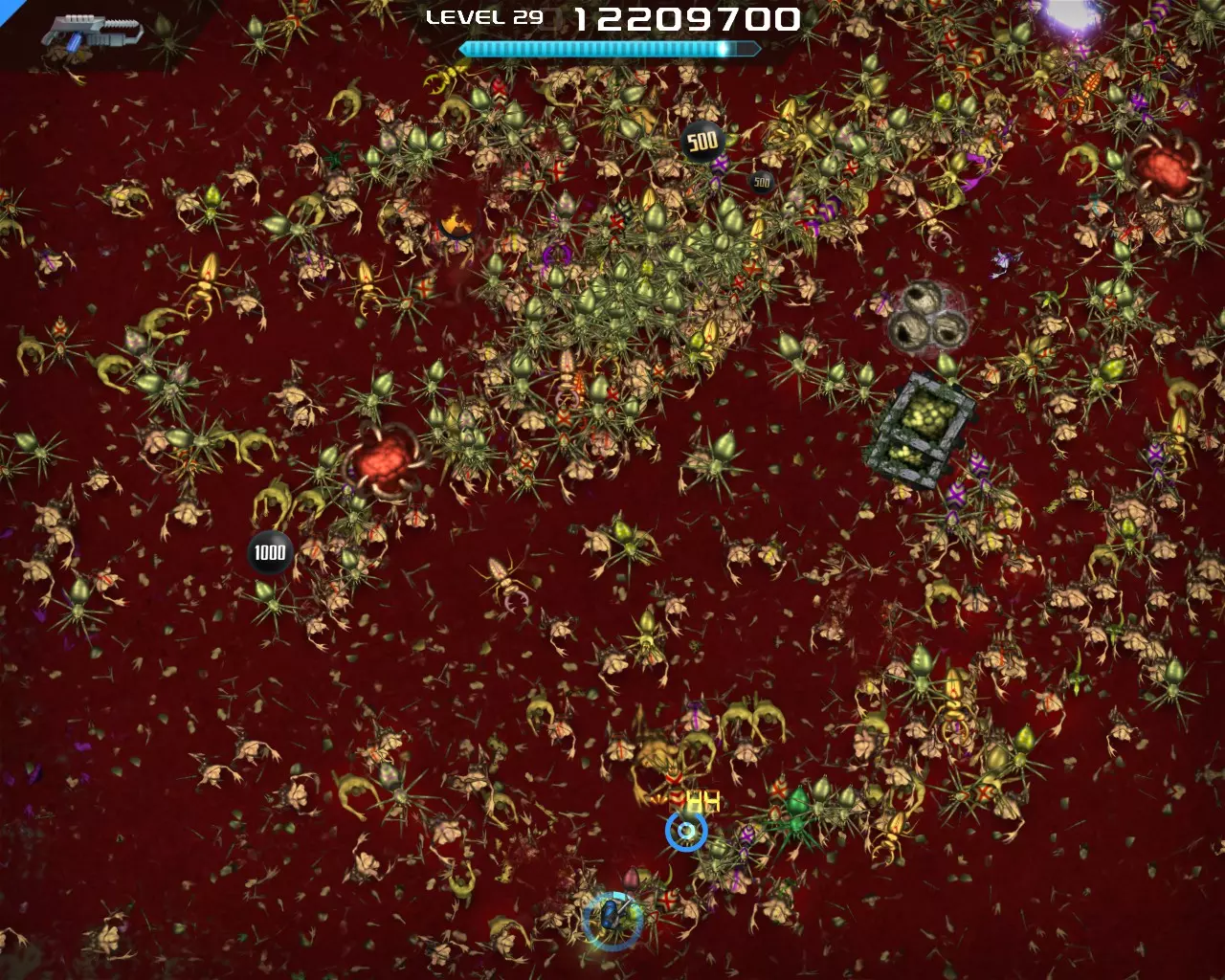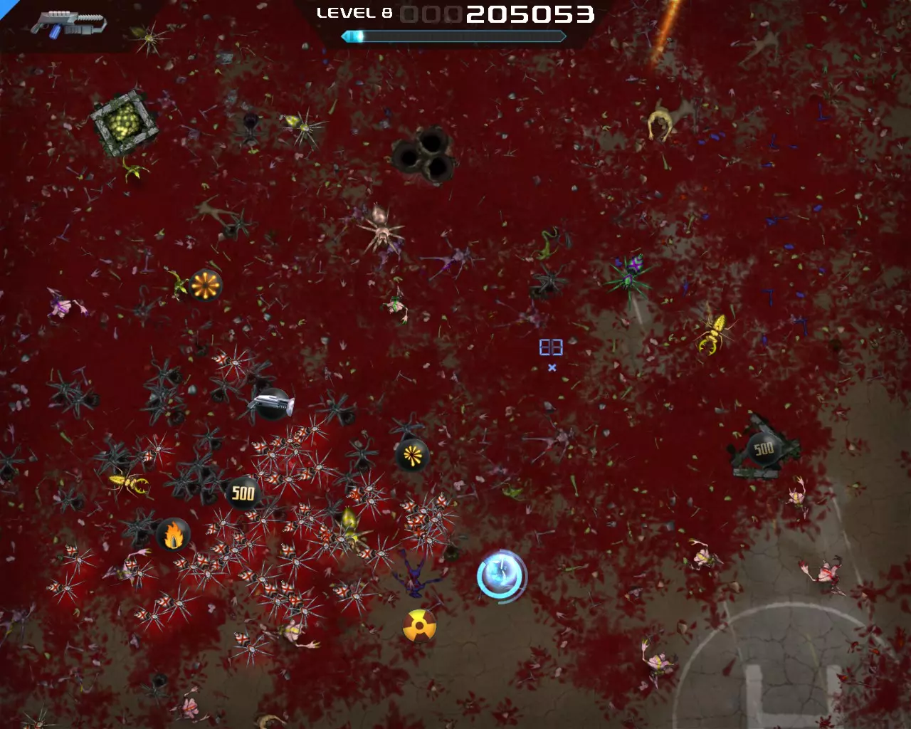 将提供的 perk 数量增加1和2。减少升级所需的经验值。在后期阶段几乎能立即升级。 策略 游戏初期可以用任何武器牵制怪物,此时只需选择所需的 perk。 中期阶段(15-20级)你将开始面临挑战。是时候使用分裂枪了(其实也可以更早)。此时你应该已经拥有坚韧装填者 perk。在这里你的生存能力会大幅提升,因为大部分时间你都会处于无敌状态,这得益于较长的技能冷却时间。 【火焰子弹】和【等离子超载】这两个增益效果要极其谨慎地选择,因为你将无法进行技能冷却。如果你身处怪物群中,绝对不能选择这两个增益,否则你会死亡。 到了后期阶段,你将无法击杀任何敌人,因为怪物的生命值会变得过高。这时你将不得不选择【等离子超载】。火焰子弹和等离子超载的增益时间会叠加,因此如果同时获得这两个增益,应先拾取火焰子弹,再拾取等离子超载。 不要指望火焰子弹,用它你也杀不了任何人。等离子超载的威力要大得多。 尽量始终选择减速。在减速状态下,你的伤害会提升10倍,但你会变得脆弱,因此不能穿过密集的敌人。 不过有时还是不得不穿过密集的敌人,这时闪避者和忍者这两个技能会保护你。在游戏后期,尽量跑到屏幕边缘附近,这样怪物会聚集在一起形成一大波。 小心那些红色的小怪物,它们的伤害非常高。 黄色的射击蜘蛛非常耐打。如果无法快速消灭它们,就离远一点,它们的攻击会打到其他怪物身上。 最好不要把注意力集中在黄色的复活怪物上。击杀普通敌人,因为它们会掉落奖励 截图