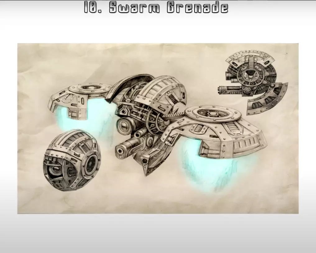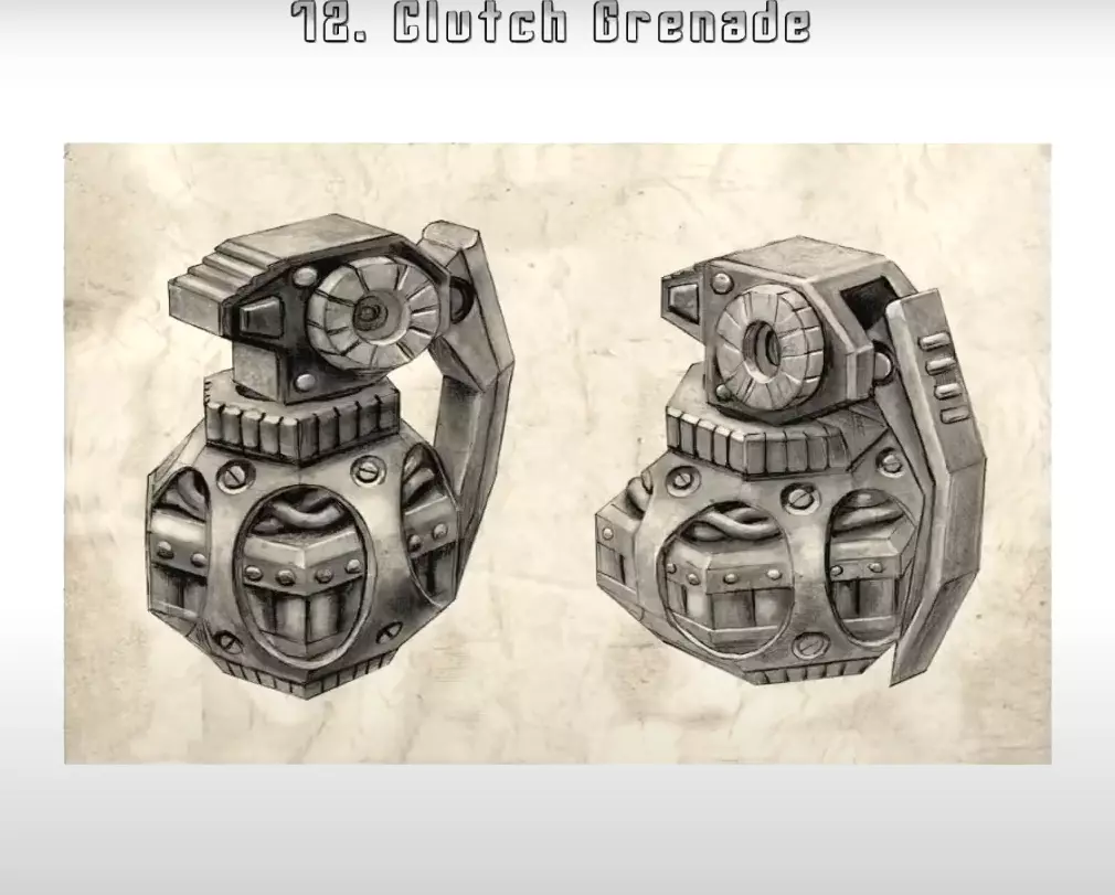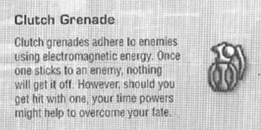 七、(A)《时空飞梭》的武器: grenades 和 turrets 《时空飞梭》中有四种功能和使用方式各不相同的 grenades。 Clutch Grenade