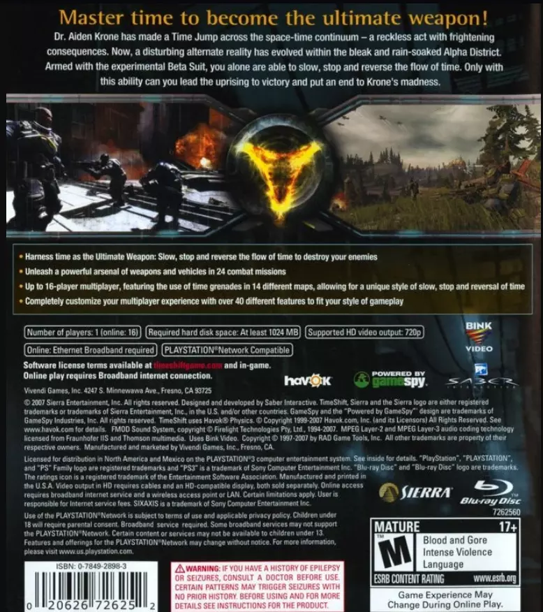 《时空飞梭》(2007)全方位指南 本指南将记录和存档与《时空飞梭》(2007)相关的所有游戏内外内容。 本指南旨在表达对《时空飞梭》(2007)的热爱,并为新老玩家提供更易获取的相关信息。欢迎任何批评和建议。 一、什么是《时空飞梭》? 基本信息:《时空飞梭》是由Saber Interactive开发、Vivendi Games发行的2007年第一人称射击游戏。 该项目最初于2005年1月10日公布,因发行权从Atari转移至Sierra Entertainment以及对游戏各方面进行根本性修改等原因,经历了多次延期。最终版本的《时空飞梭》于2007年5月25日在与IGN的采访中正式公布。《时空飞梭》原计划登陆Windows和Xbox 360平台,在2007年索尼春季玩家日活动中,官方宣布将推出PlayStation 3版本。 《时空飞梭》分别于2007年10月30日和11月19日在Microsoft Windows、Xbox 360平台以及PlayStation 3平台发售。 游戏设定:“掌控时间,化身为终极武器!艾登·克朗博士进行了一次穿越时空连续体的时间跳跃——这一鲁莽行为引发了可怕的后果。如今,在阴冷潮湿的阿尔法区,一个令人不安的平行现实已然形成。” 《时空飞梭》的故事发生在两条不同的“时间线”中:一条是“近未来”,另一条是与公元1939年最为接近的平行时间线。 游戏的玩法和任务均发生在阿尔法区,这是一个位于平行公元1939年的区域。而预渲染过场动画则会在玩家推进剧情任务时,呈现“近未来”时间流的“闪回”画面。另一条时间线——公元1939年的平行时空,是一个由暴君克朗统治的反乌托邦世界。这里阴雨连绵,阿尔法区常年处于被围困状态,由梅森·库克指挥官领导的反抗军正奋力抵抗克朗政权日益增长的势力。“近未来”时间流几乎与我们的世界完全相同,只是存在一个秘密组织在进行时间旅行应用方法的私人研究,该项目被称为N.E.X.T.2计划。 剧情:你是“贝塔套装者”,身份不明,有着充满隐秘动机的可疑过往。你的研究项目“N.E.X.T.2”的负责人艾登·克朗博士背叛了你和你的同事们。他偷走了阿尔法战衣——N.E.X.T.2经过大量研究后制造的两套时间旅行战衣之一,随后“跳跃”到过去,并留下一枚武装炸弹,企图摧毁你和同事所在的设施以斩草除根。在炸弹爆炸前几秒,你穿上贝塔战衣,跟随克朗博士进入过去。就在你目睹共事之人丧命的瞬间,你也进行了“跳跃”,但问题出现了……你跳回的时间不够早,如今被困在一个由残酷暴君克朗博士统治的平行时间流中。利用战衣拥有的减缓、停止和倒转时间的能力,现在由你协助反抗军击败克朗博士。克朗,并寻找回到自己时代的方法,希望在此过程中拯救阿尔法区和你的同事们。 “欢迎来到时空飞梭 掌控时间,成为终极武器 为了追捕背叛者克朗博士,你已进入他的平行时间流…… 掌握贝塔套装的时间操控能力,带领叛军起义走向胜利。” ——《时空飞梭》游戏用户手册 游戏玩法 《时空飞梭》的核心玩法机制是贝塔套装的时间操控能力。贝塔套装能够实现时间减速、时间停止或时间倒流,每种能力都会不同程度地消耗贝塔套装有限的能量。一旦贝塔套装的能量耗尽,它将开始逐渐充能。这些能力会影响世界中的一切,但对【Beta Suiter】(贝塔套装)无效,让玩家能够应对战斗和环境谜题。在某些特定剧情时刻,这些能力的能量消耗会降低,使玩家能更长时间地使用它们。 “借助贝塔套装的力量,你能够在第四维度中穿梭。你控制时间的能力让你能做到看似不可能的事情,比如在水面行走或穿越火焰。当你使用时间能力时,贝塔套装之外的世界万物都会受到影响,而你不会:这意味着无论你使用何种时间能力,你和你操控的武器都以正常速度移动。贝塔套装配备了名为【S.S.A.M.】的人工智能。”它对您遇到的各种情境都十分敏感。由于S.S.A.M.能够智能选择在特定时刻最有助于您达成目标的时间能力,因此您可以通过一个按钮来控制时间转移的所有三个方面。——《时空飞梭》游戏用户手册