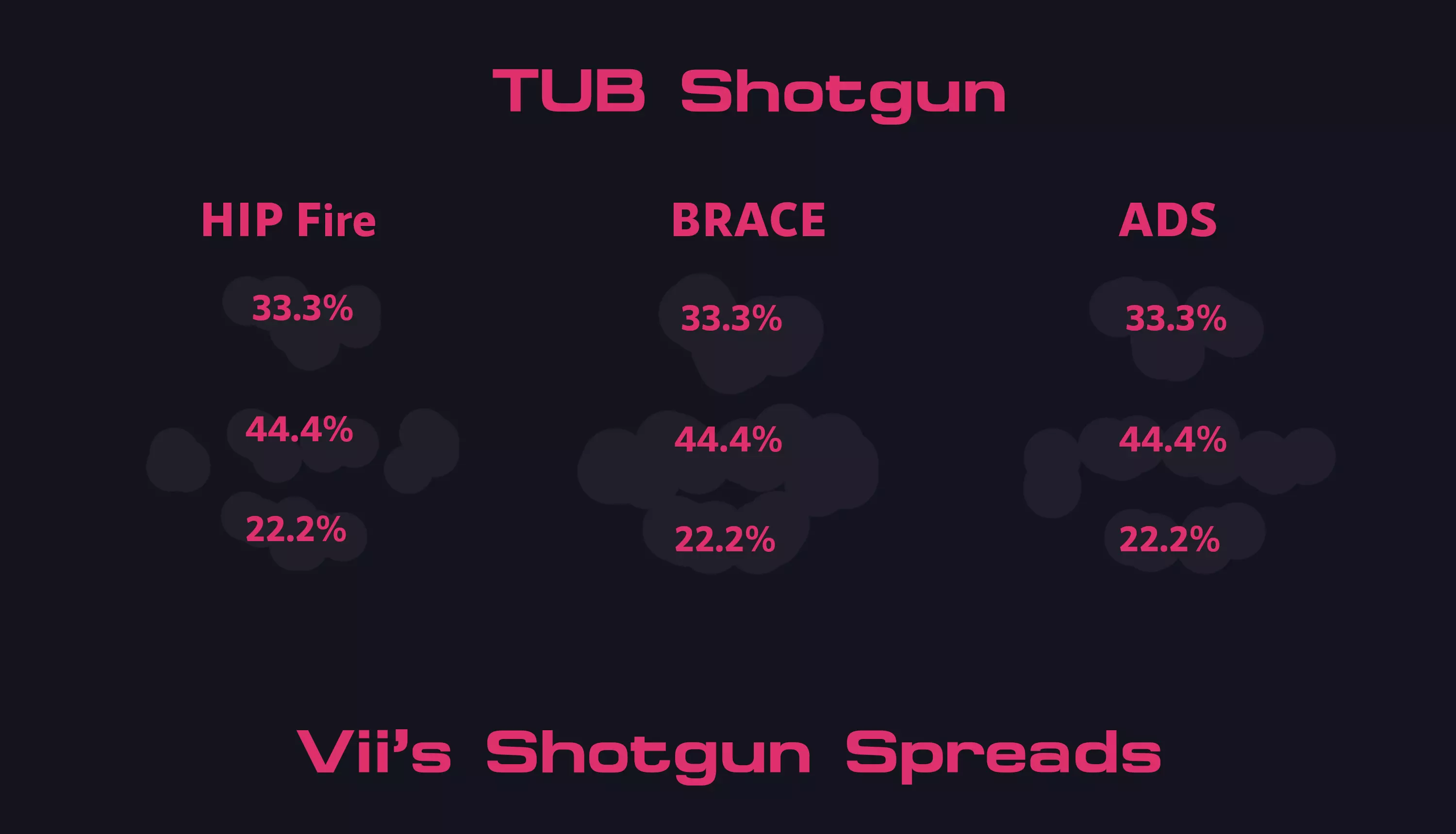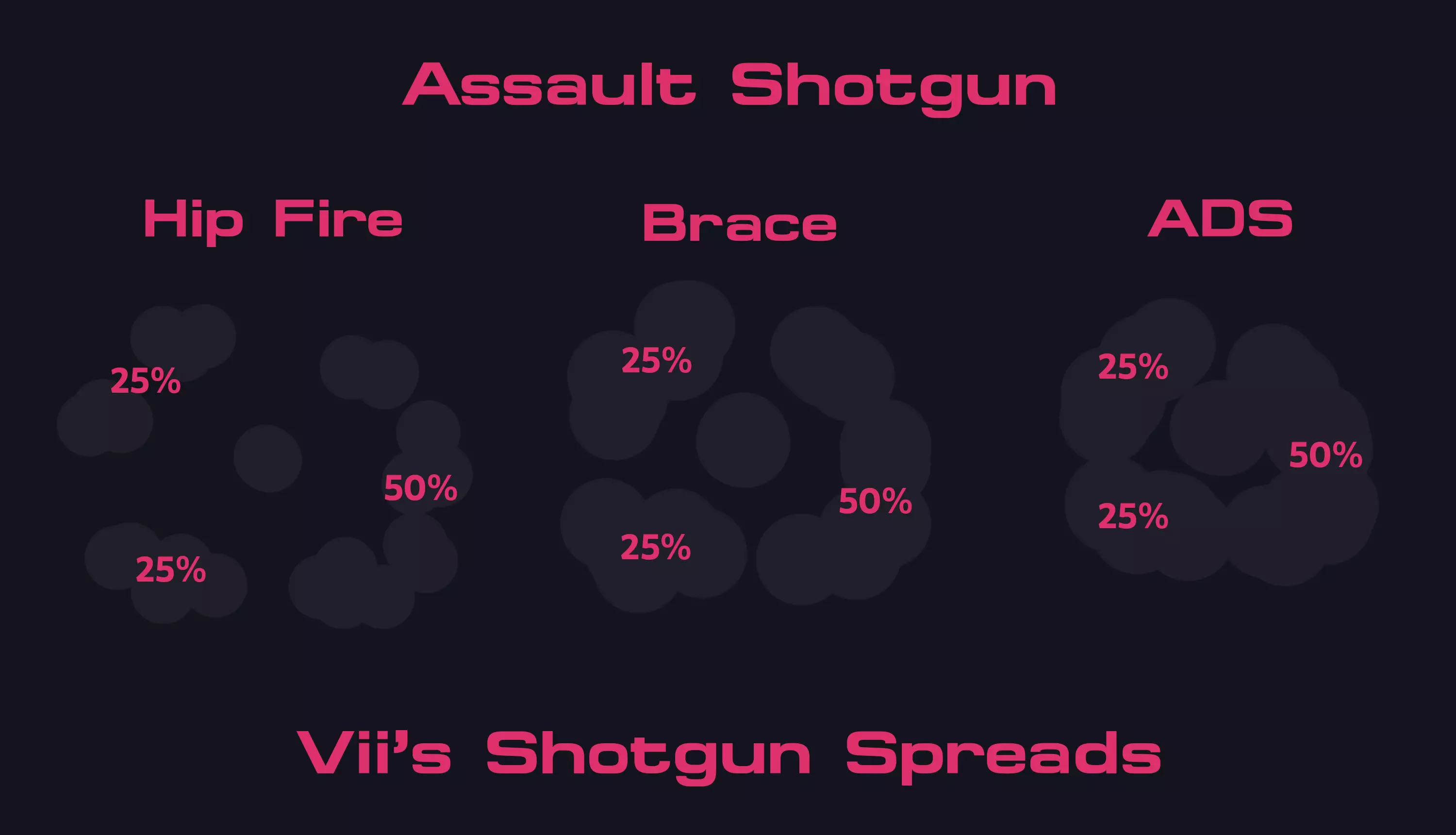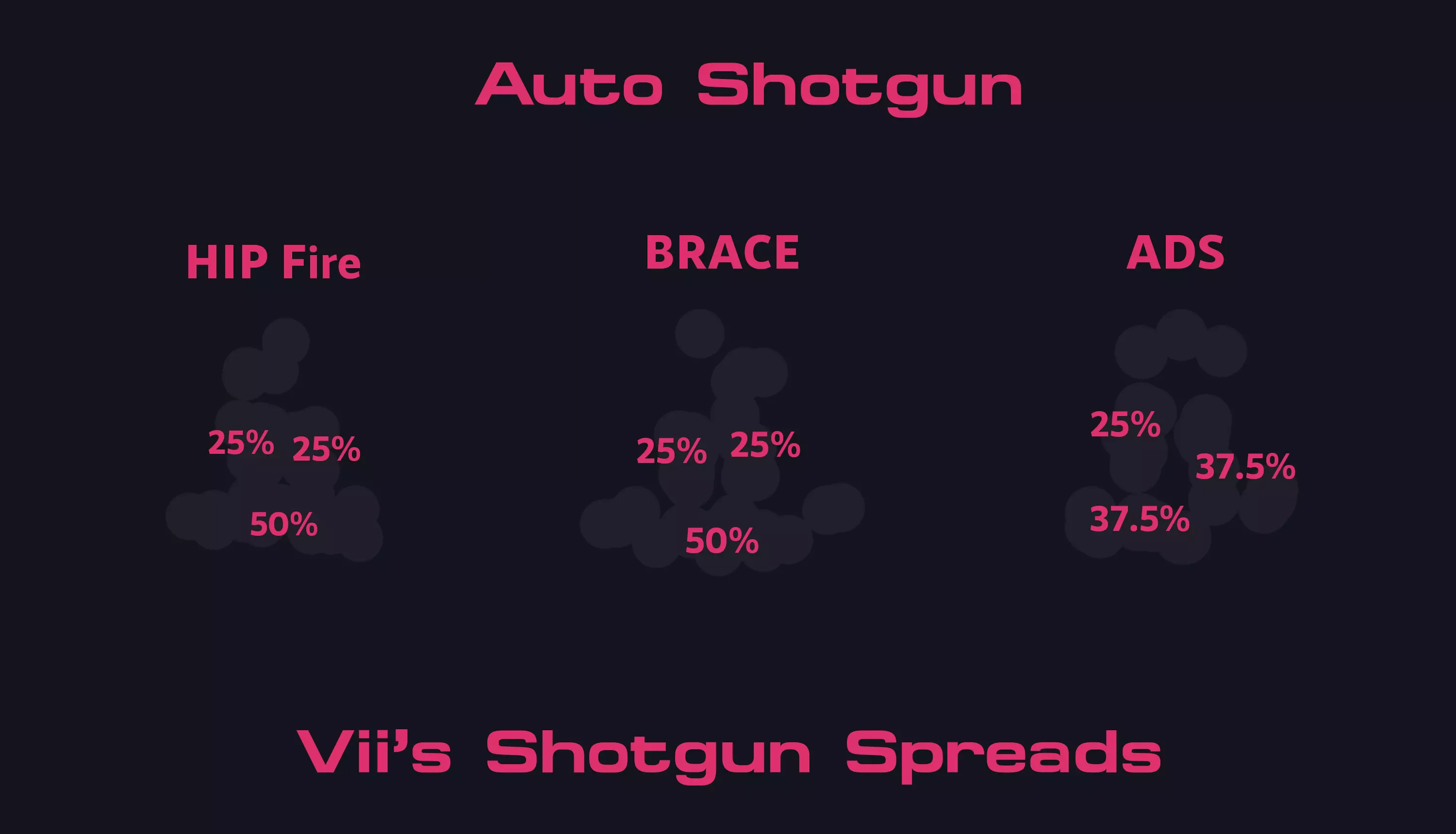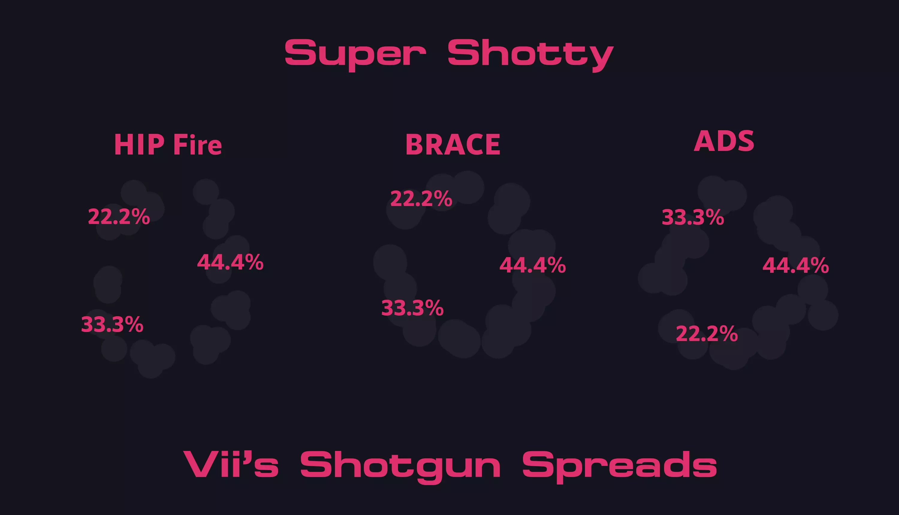 大家好,我是Vii。我是DPL战队Fierce的平面设计师,同时也是社区的一员。在本指南中,图表将向你展示弹丸占总弹丸数的百分比。弹道散布是由3-4种不同的散布类型组合而成。所有散布数据均是在距离目标1格的位置获取的,且散布范围会随距离增加而扩大。 本指南纯粹展示不同霰弹枪的弹道散布模式以及弹丸落点的百分比。利用散布模式的最佳方法是让尽可能多的弹丸命中单个目标,因此了解弹丸的最高百分比落点,能帮助你确定希望弹丸击中的位置。 进攻方霰弹枪