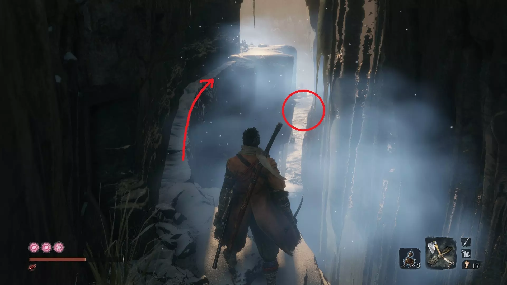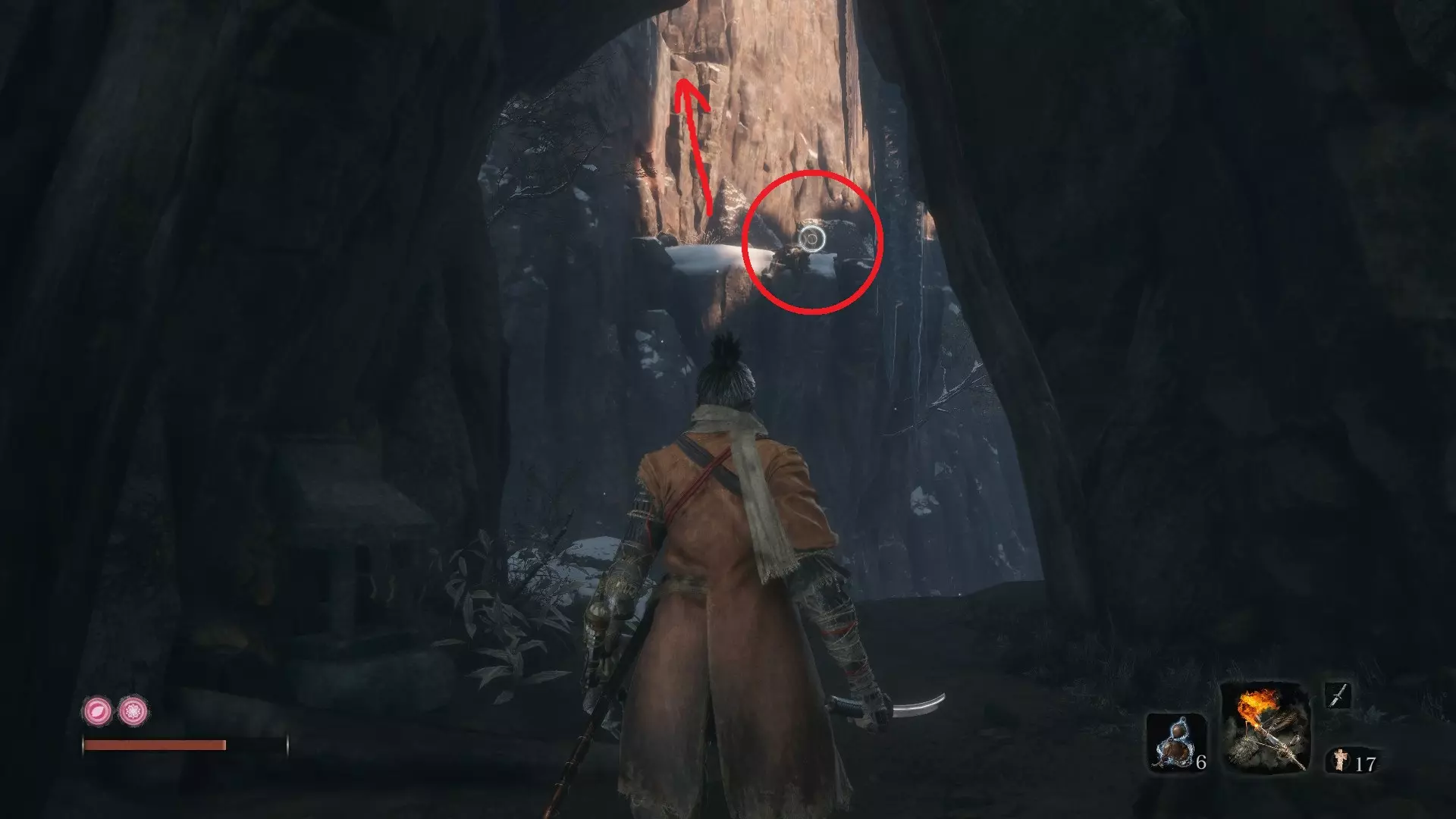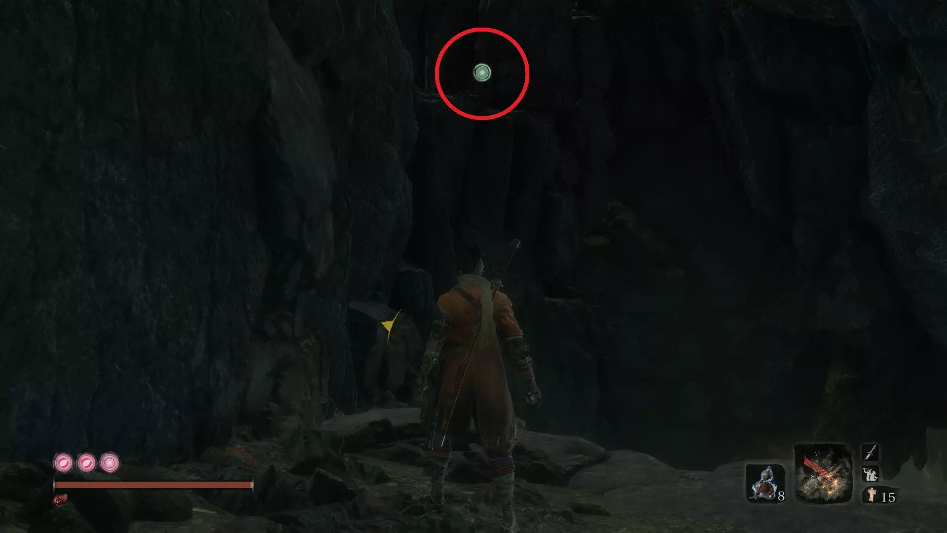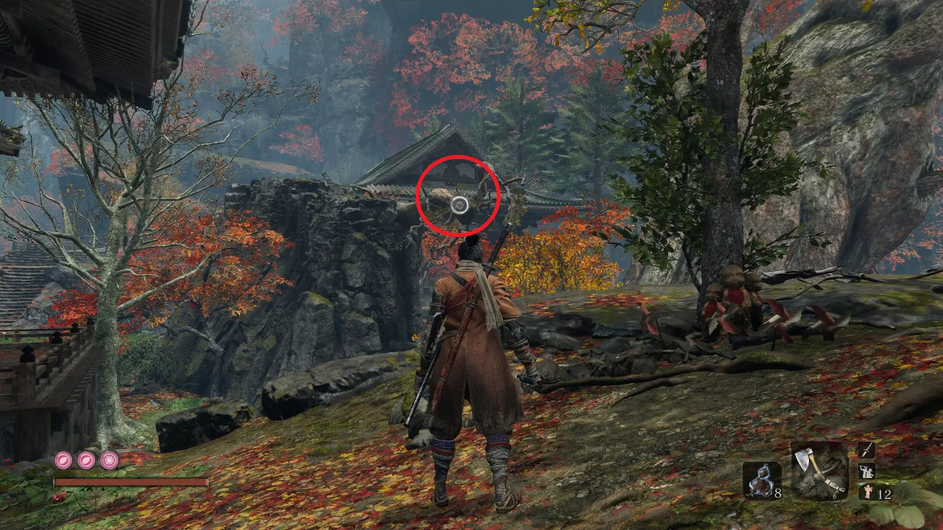 金刚山·仙峰寺 葫芦种子#6:金刚山·仙峰寺 获得第一个仙峰寺鬼佛后,沿着小路前进,会看到十几个僧人漫无目的地游荡。在这片区域的后方有一座大型建筑。悄悄靠近建筑,你会发现可以钩爪抓住天花板进入。一个有三个僧人的房间里藏着你的种子! 坠落之谷 葫芦种子#7:坠落之谷 - 社下山谷 到达社下山谷鬼佛后,按正常路线前进。钩爪抓住一次树枝,再抓住另一根。右侧是主线流程,但我们要先向左爬上可悬挂的墙壁。 爬上墙壁后,会找到另一个钩爪点,抓住它前往另一面墙。向上攀爬,就能在顶部发现一间小屋。里面有一些不错的物品,还有另一颗葫芦种子,可以增加你的葫芦瓶数量!