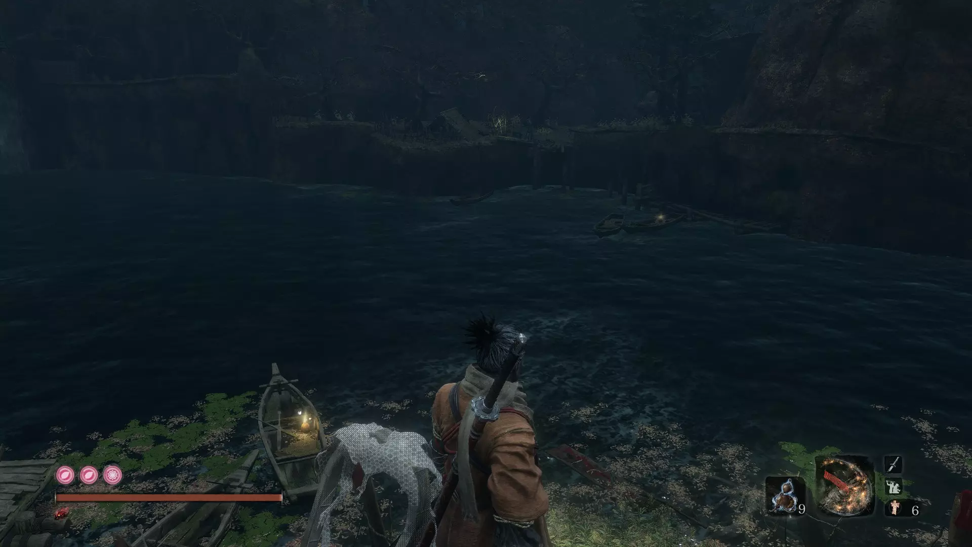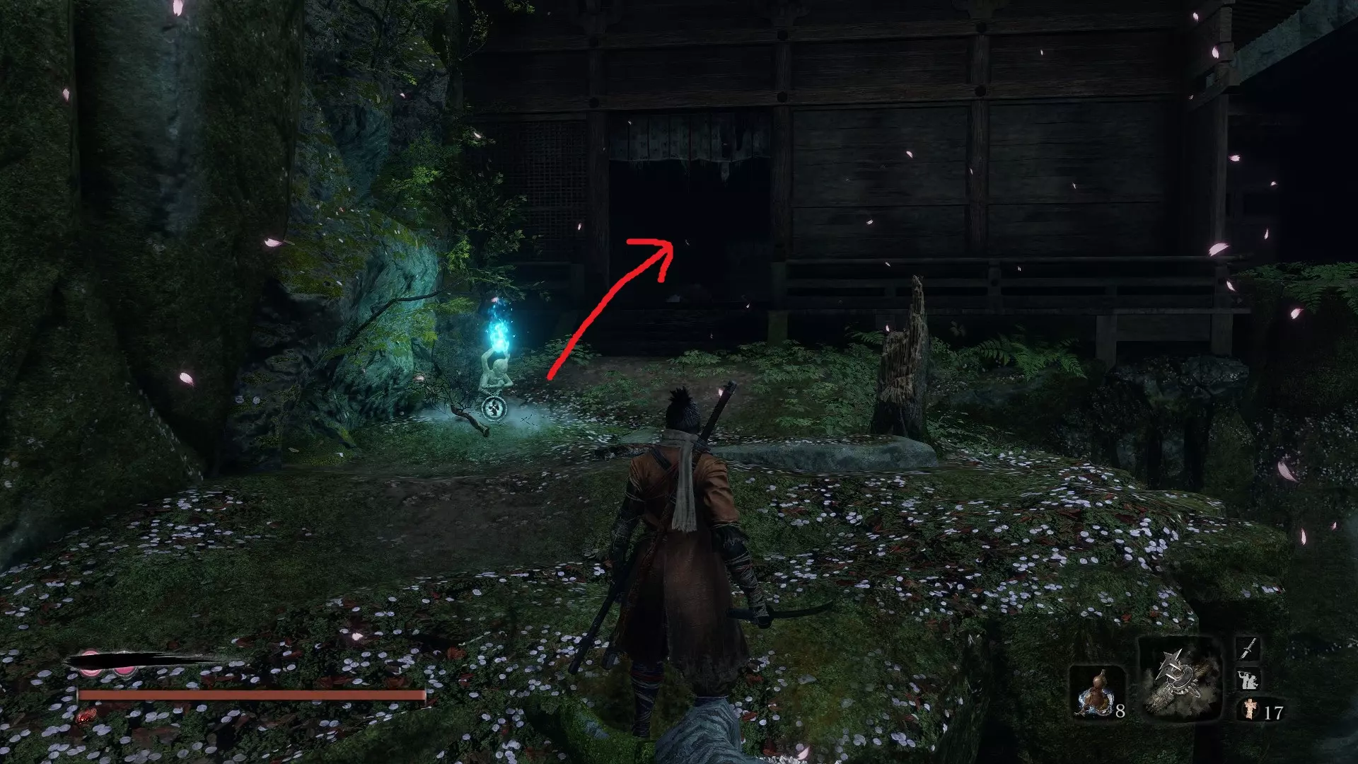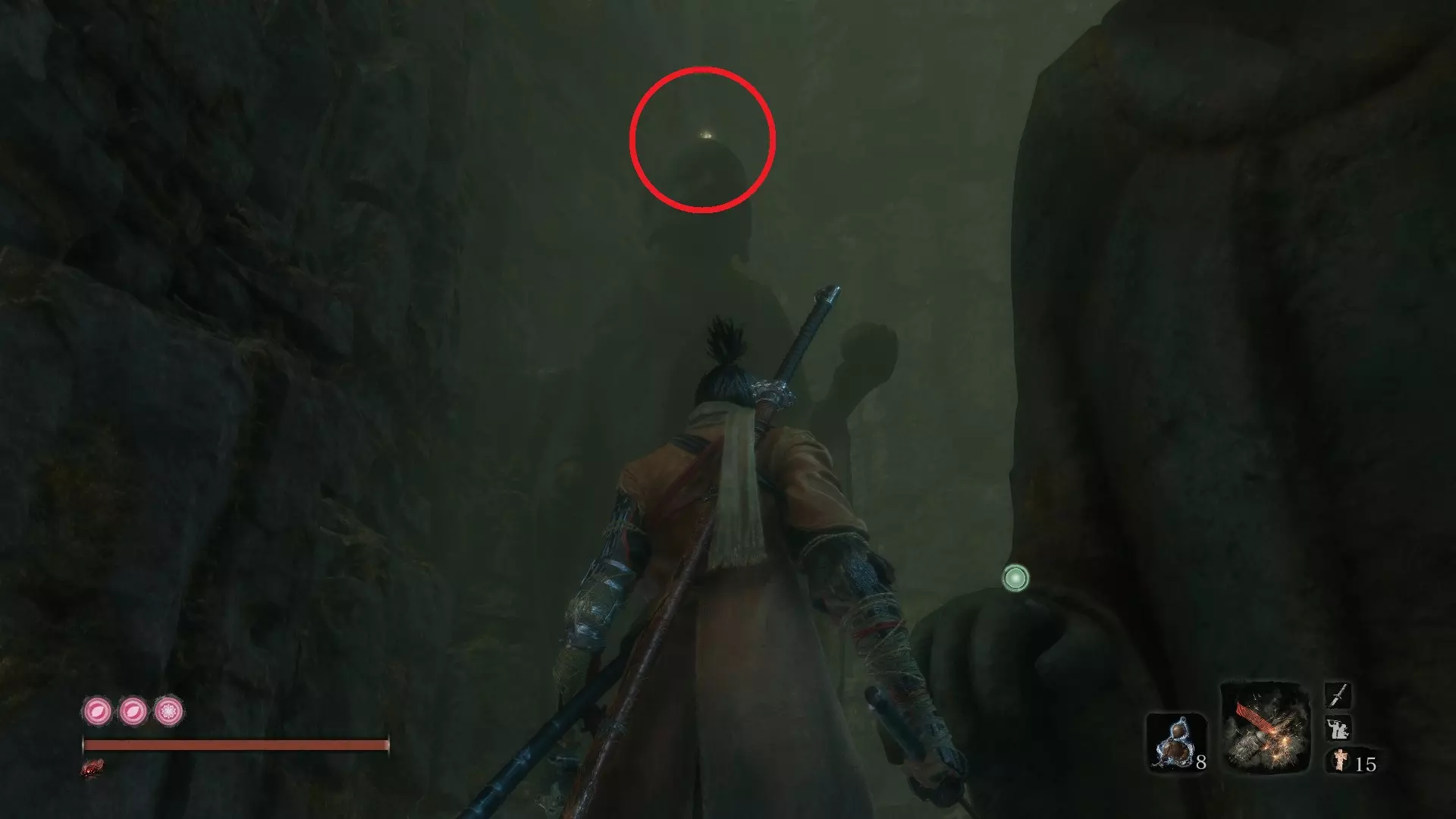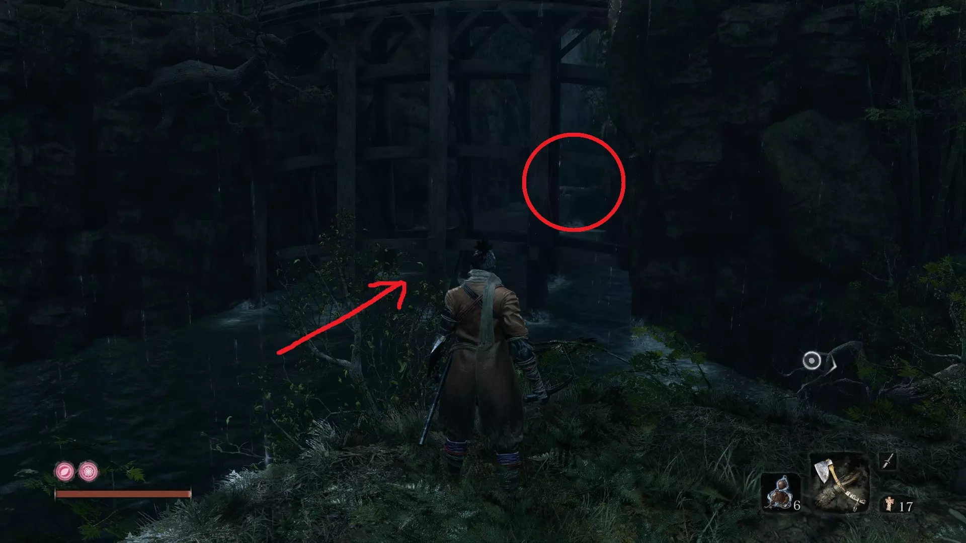 巅峰体力(续) 佛珠#23和#24:毒池 由苇名之底的守护猴掉落 注:击败后务必刺穿蜈蚣以获得Immortality Severed成就。 隐藏森林 佛珠#25:隐藏森林 由贪食小Boss掉落 具体位置:从第一个隐藏寺庙鬼佛出发,经过小佛像后到达第二个区域。在最左侧墙壁上,你会找到一个钩爪点,可借此登上一个小平台。平台之后,你会发现一个被小猴子包围的贪食小Boss。 佛珠#26:隐藏森林 - 水车 这个我必须详细写出来,因为它曾让我费了不少功夫。 到达水车鬼佛后,按正常流程推进。你会经过弹琵琶的女子,走过桥梁,很快就能看到一座破败的房屋,里面有一群敌人。你需要跳进右手边的河里,注意不是下游那条,而是离你最近的那条河。 到达河边后,游到桥下,将视角转向房屋的上层。贴着离房屋最近的石墙站好,先跳跃,然后接后空翻跳跃,这样应该能获得足够的高度,让你用钩绳钩上去。
