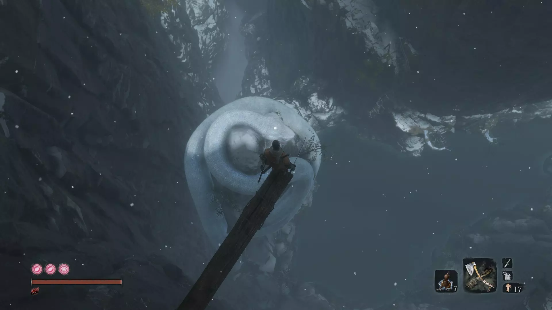 瞄准它,然后像对付任何怪物一样直接跳下去攻击。系统会提示你再次进行忍杀,完成后就没问题了!不用担心掉落,在你处决那条蛇之后,会安全地落在岩石上。