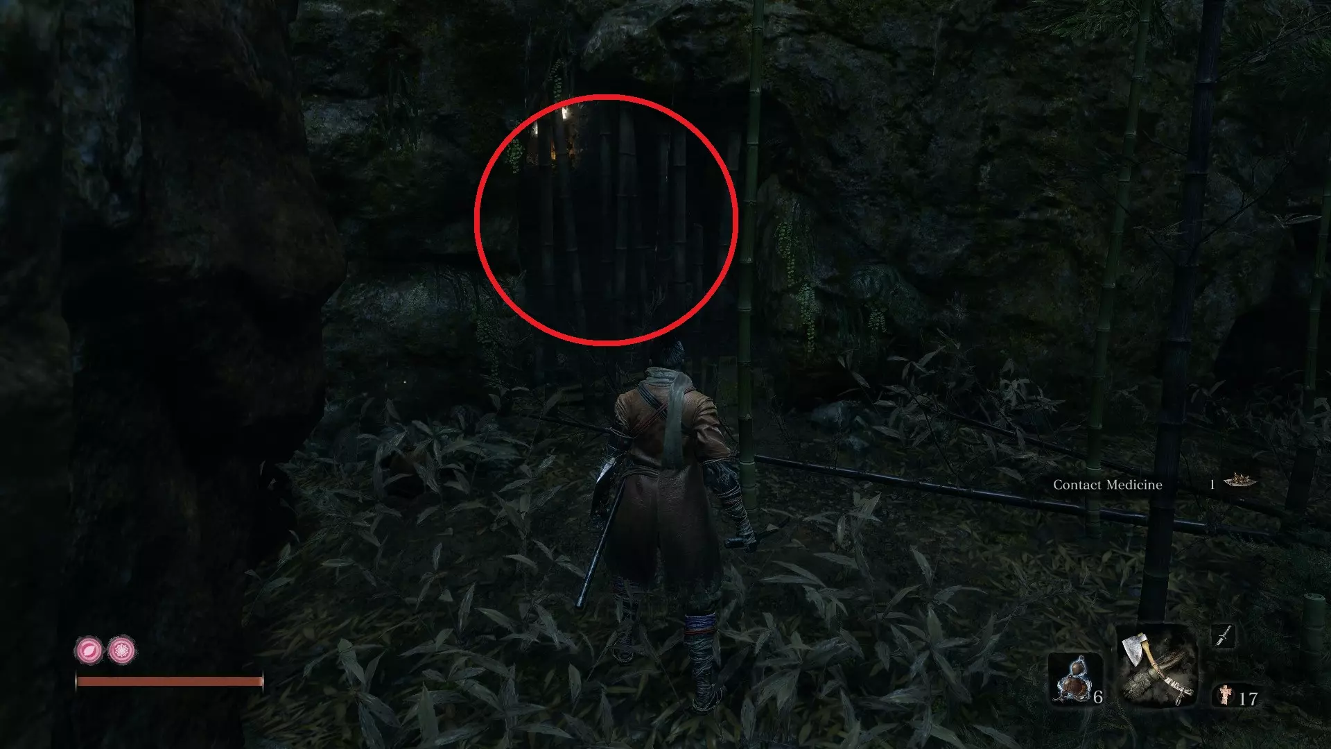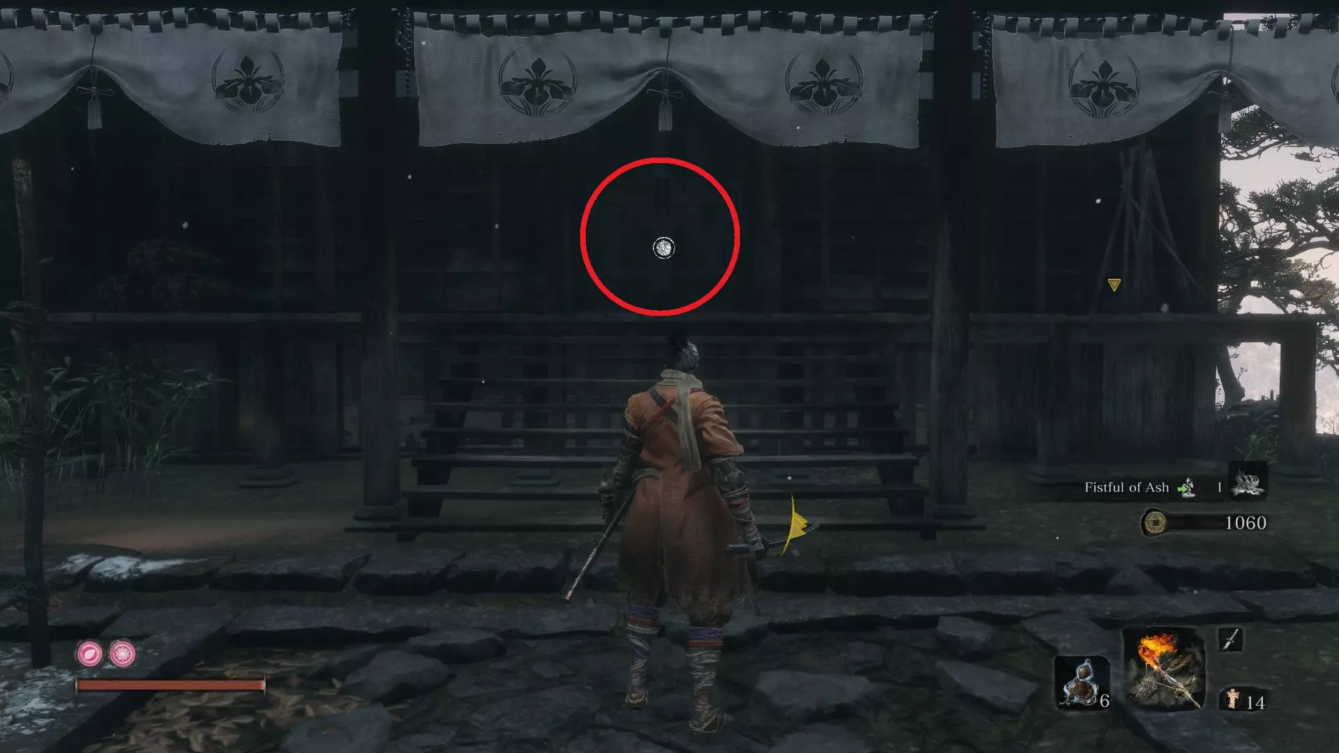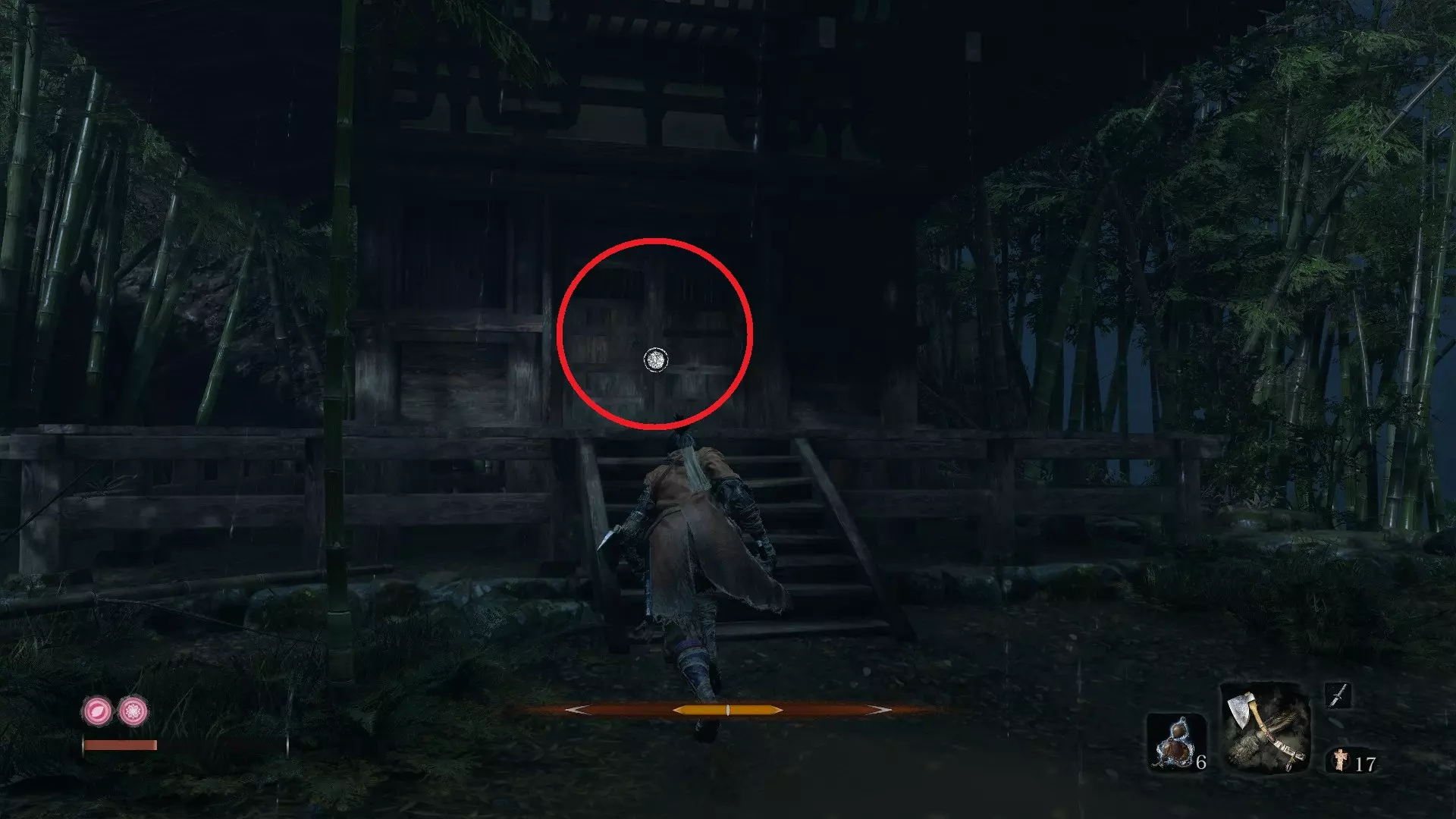 义手忍具#5 雾鸦羽毛:竹林坡 在竹林坡鬼佛处;击败精英怪【 Shinobi Hunter 】后;沿着小路走一小段,直到能钩爪到最左边的树桩。跳入水中向北游。钩爪到最右边的树枝,会发现一扇竹门。 打破竹门进入小洞穴。在洞穴中壁跳,向上进入一座小寺庙。会有敌人出现,但你可以直接从他身边走过,打开寺庙的门。打开门后,道具就在里面。