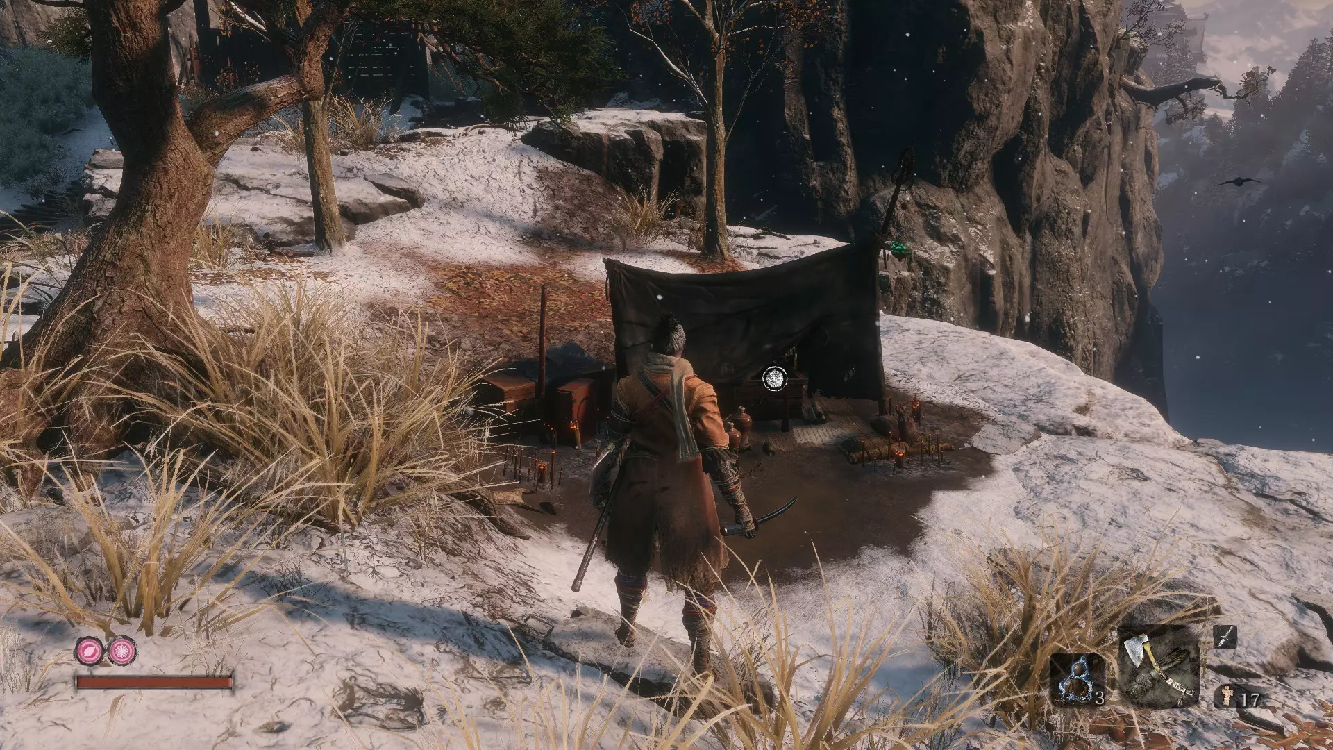 获得忍义手 无法错过。在游戏序章被苇名弦一郎击败后,你会在破旧寺庙中醒来,获得由雕佛师为你装上的义肢;雕佛师正是最初将你拖入寺庙的人。 Revered Blade