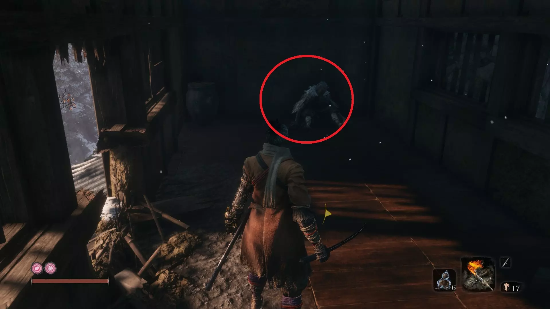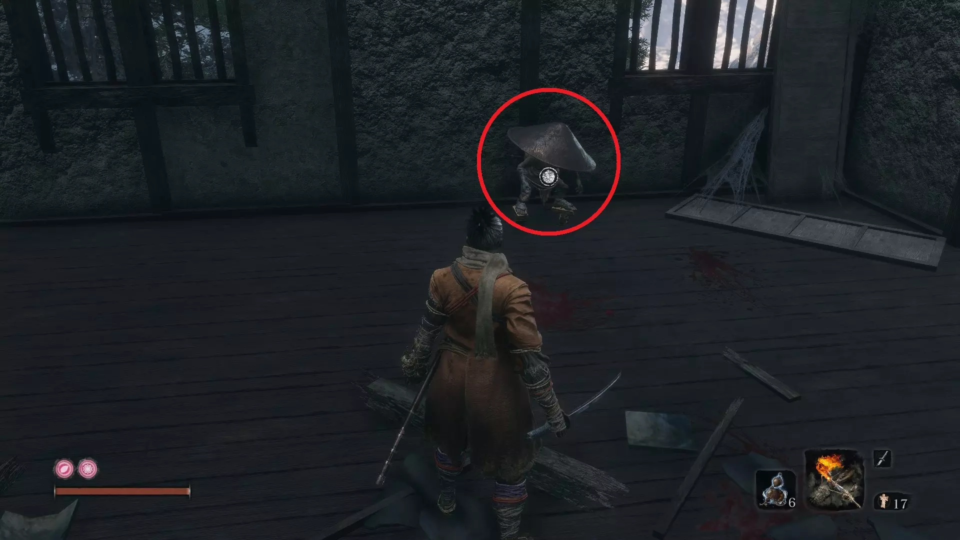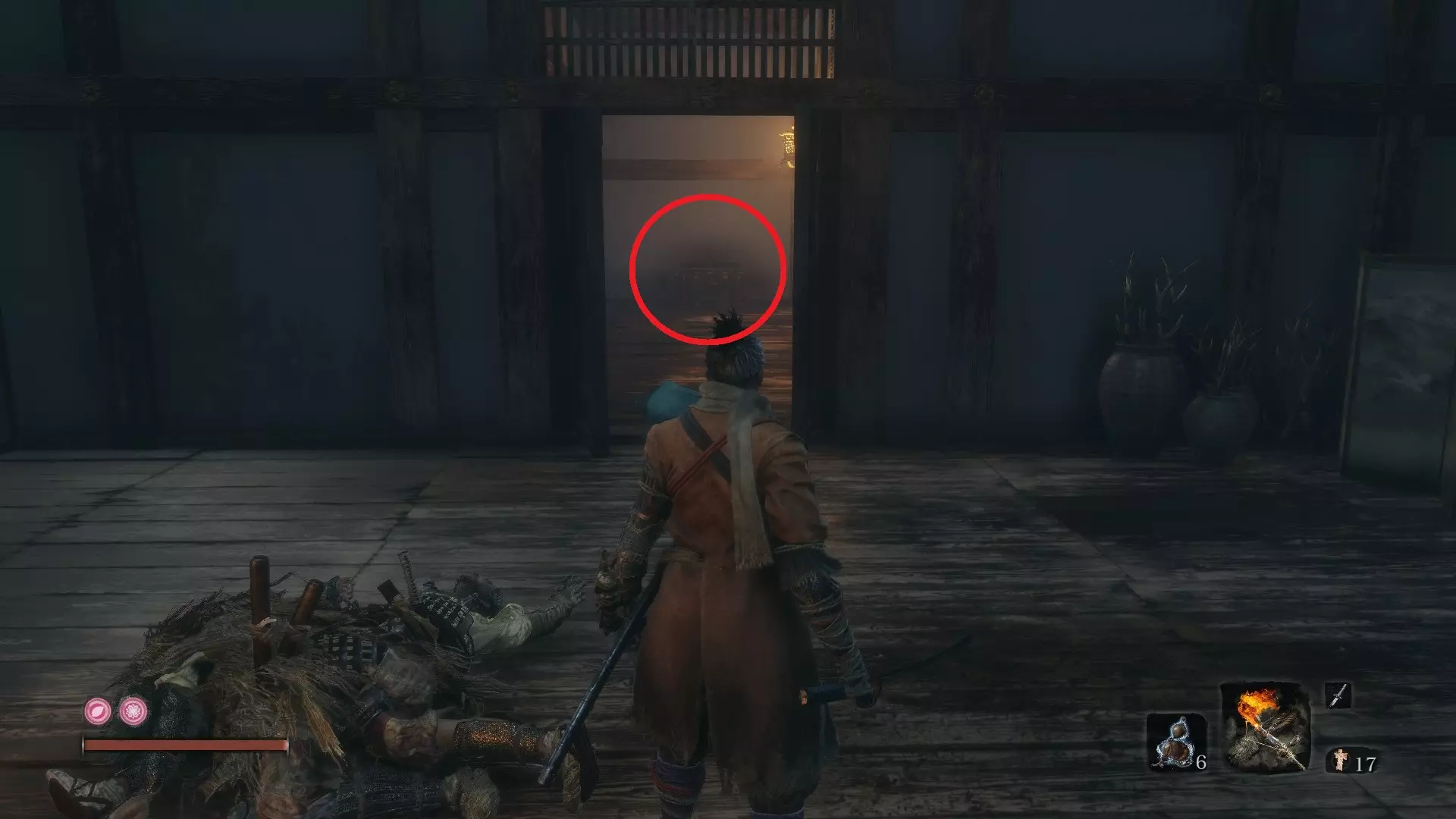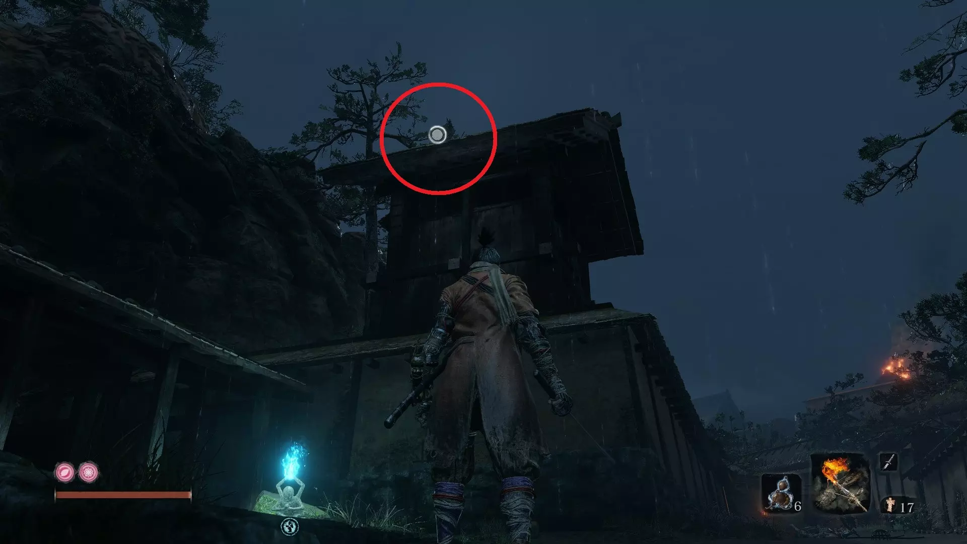 苇名城 义手忍具#6 鬼刑部的断角:苇名城 在苇名城,转身朝向桥梁,钩爪到右侧的树枝上。之后,穿过大门,偷听相邻桥梁上两个敌人的对话。杀死他们可获得门房钥匙,后续会用到。 在苇名贮水城区的鬼佛处,正前方是一片有多个魁梧敌人和少量远程敌人的开阔区域。进入该区域后,就在你的左手边会看到一间小屋,这就是门房。打开门后,里面的宝箱中装有该物品。