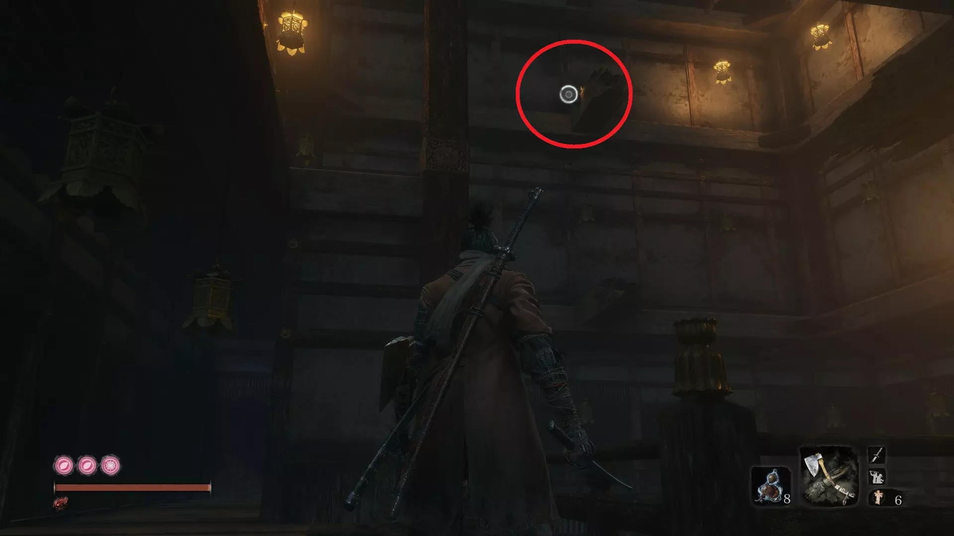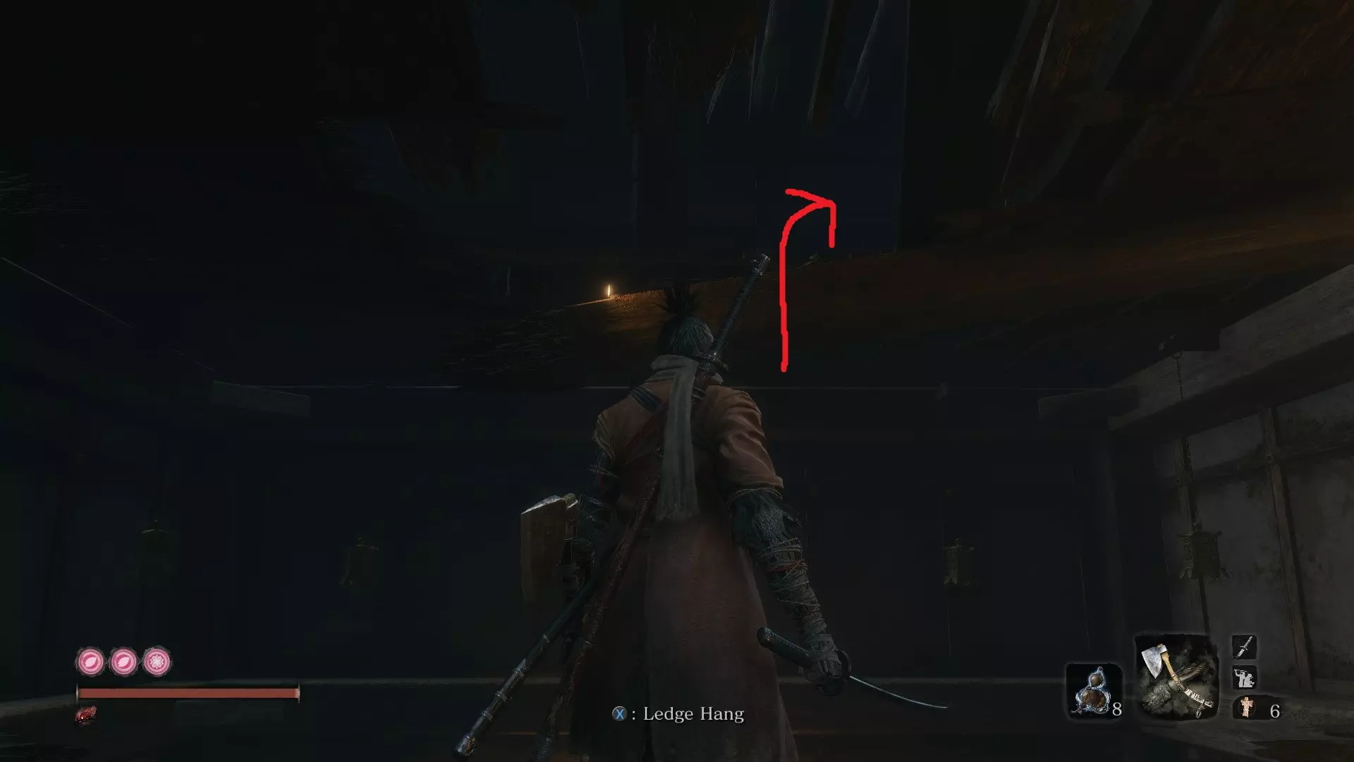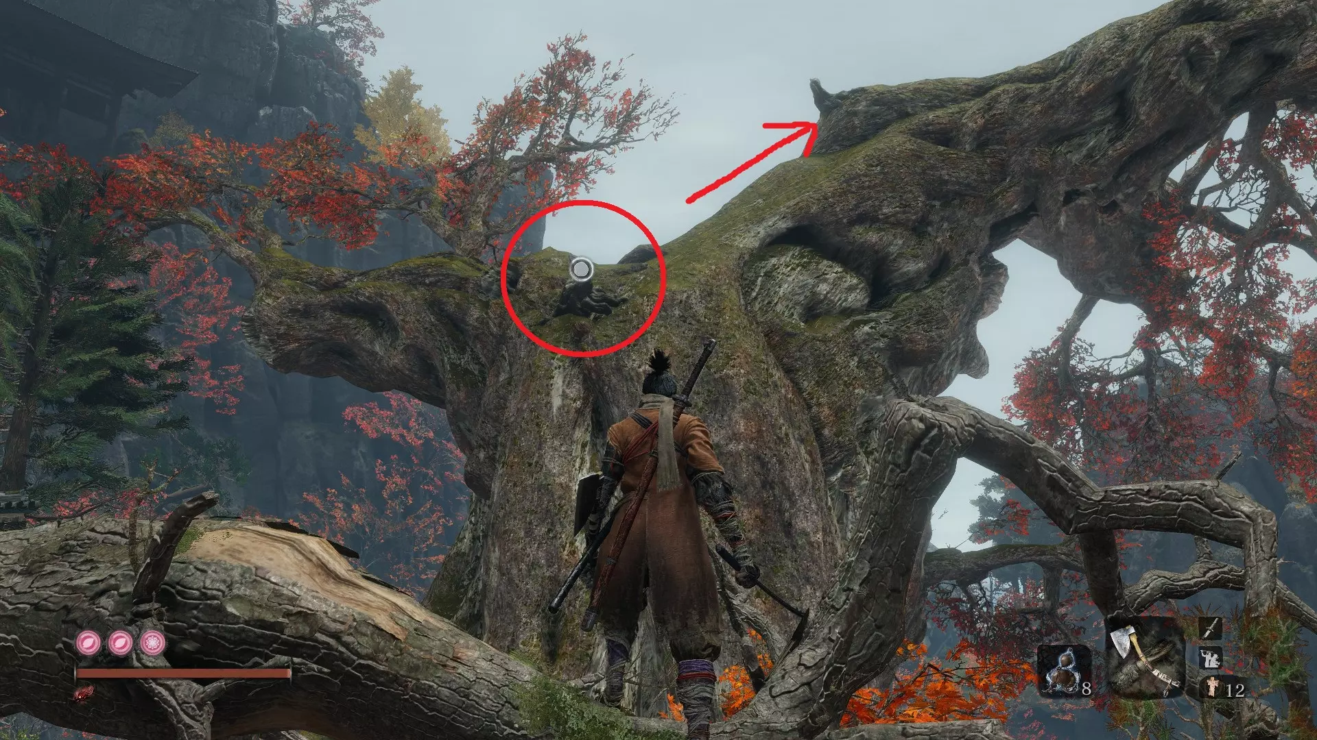 让你的随从升起风筝后,前往僧人区域。钩爪到尽头的那栋建筑,然后从窗户跳进去,那里有三个僧人正在向那个不死生物祈祷。到达那里后,你会看到一棵大树,爬上去。