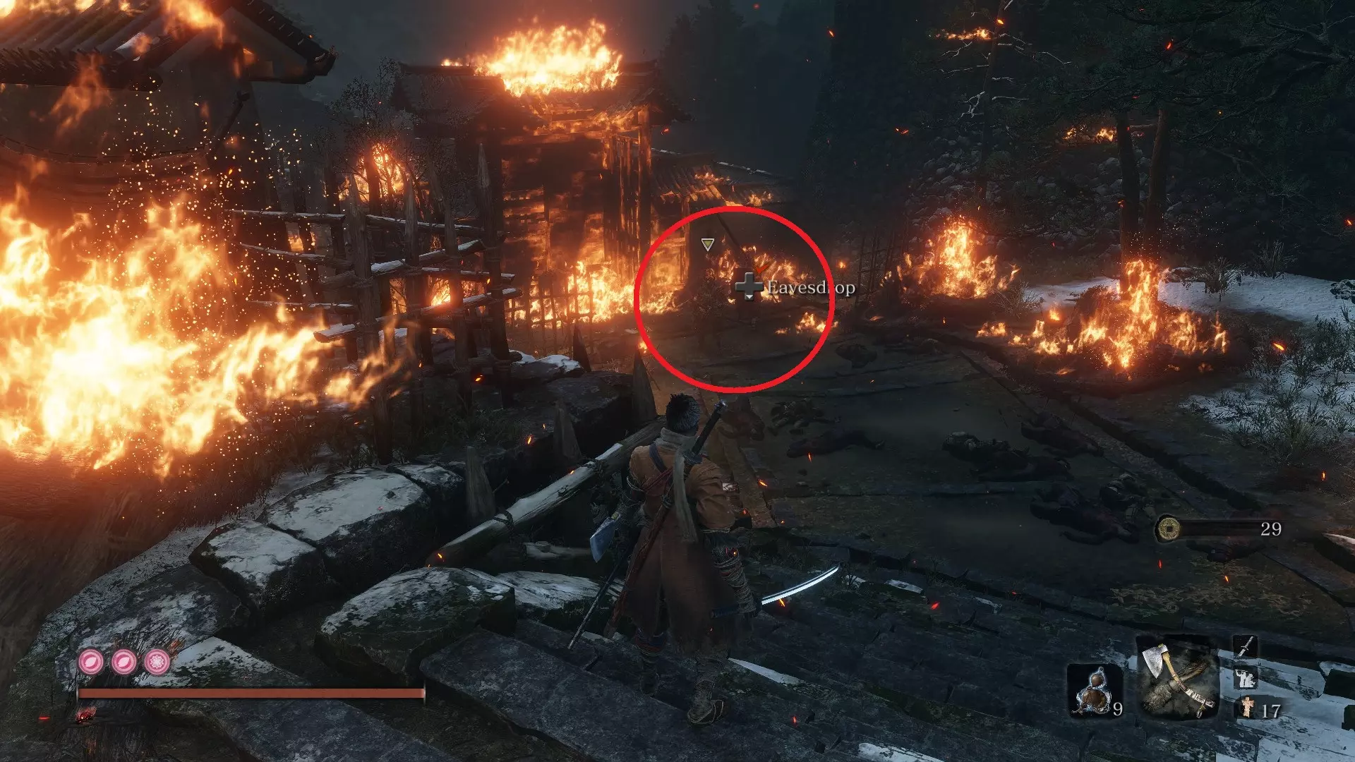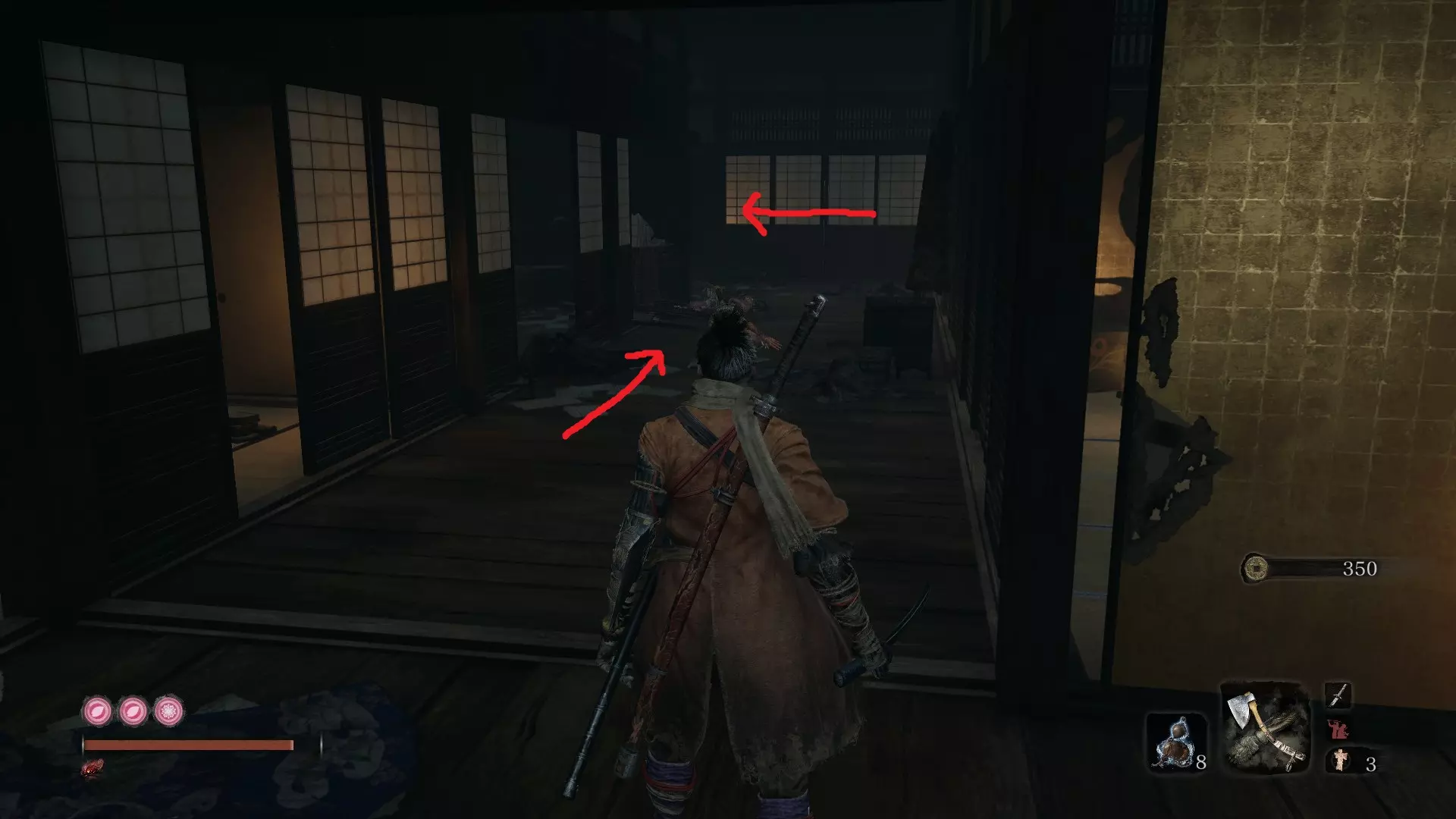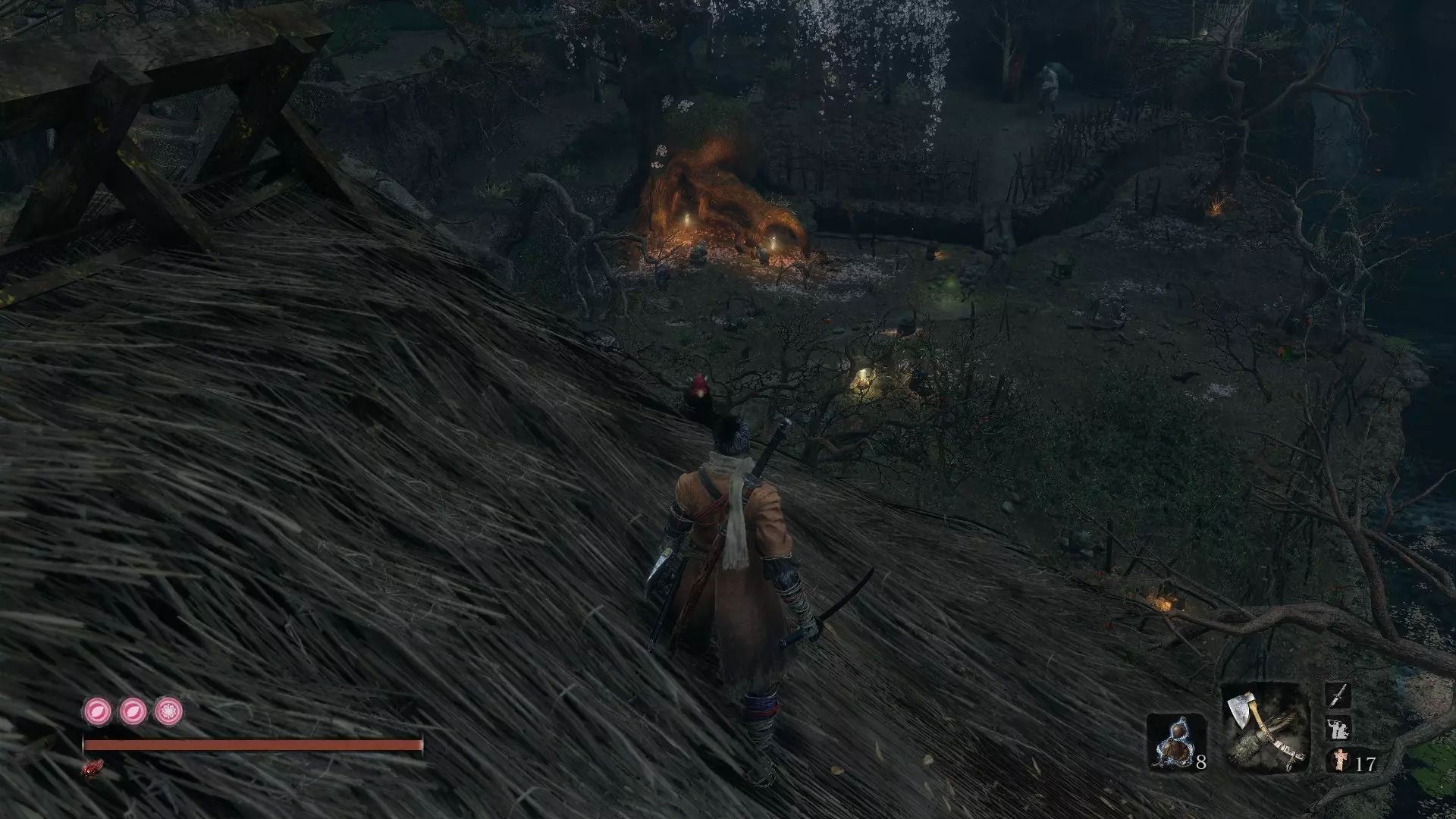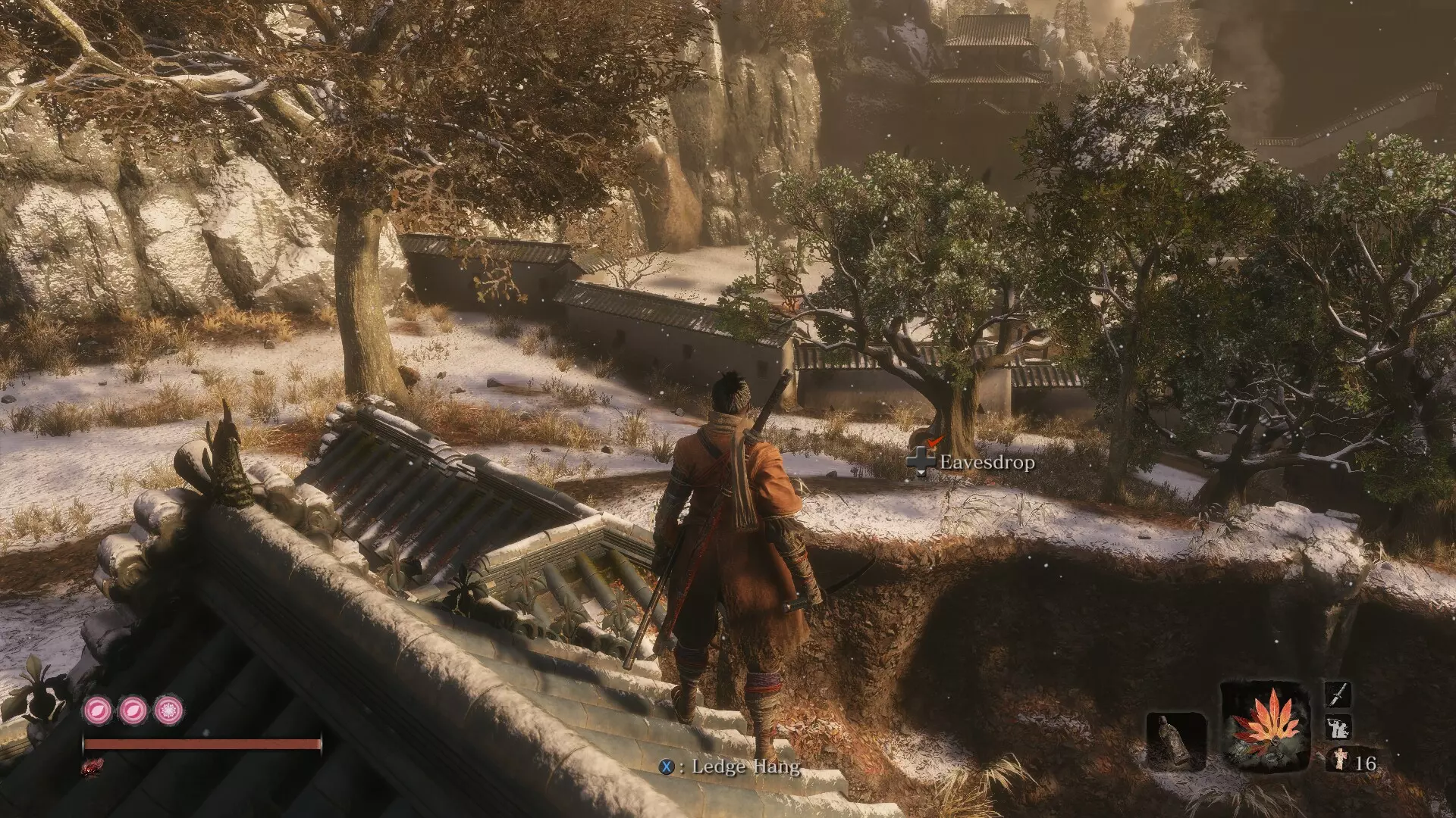 让你的随从升起风筝后,前往僧人区域。钩爪到尽头的那栋建筑,然后从窗户跳进去,那里有三个僧人正在向那个不死生物祈祷。到达那里后,你会看到一棵大树,爬上去。