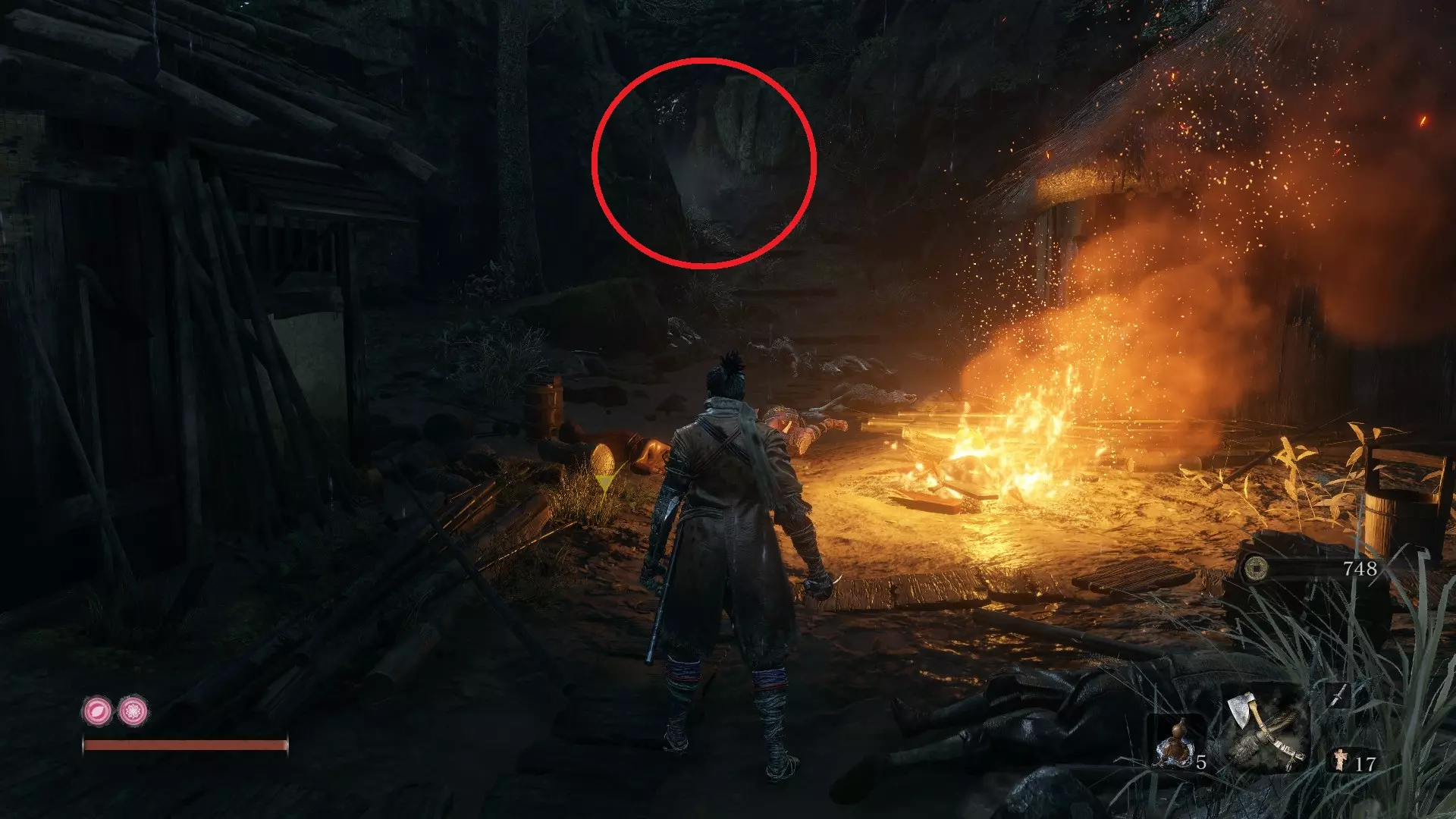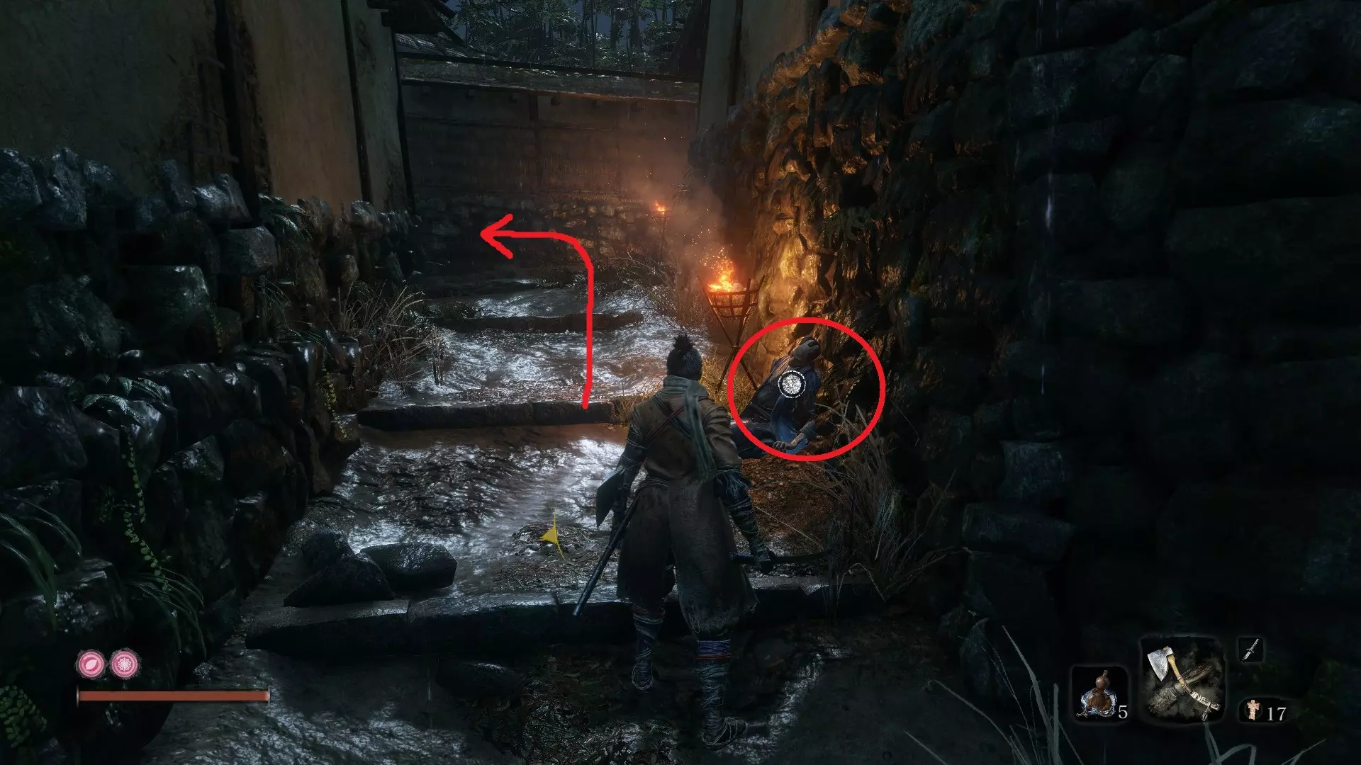 平田宅邸 义手忍具#3 火焰喷射筒:宅邸通路 在【外围城墙大门通路】与【楼梯】两个鬼佛之间,你会在一栋建筑内找到一位老妇人。与她对话后,她会交给你一个铃铛,你可以用这个铃铛在寺庙的佛像处使用。 这会将你传送到平田宅邸。到达【宅邸通路】鬼佛后,向右跳上墙,一直前进,直到你发现一片开阔区域,屋顶上有一名弓箭手,还有几名敌人围在一堆火旁。火焰喷射筒就在火堆里。