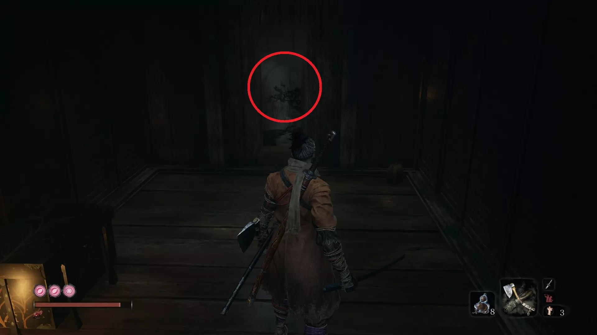 当他靠近第一个台阶时,你要迅速沿着墙壁蹲下并移到左侧。从那里,你可以悄悄绕到他身后施展忍杀!之后,你就会开始与长枪小Boss的战斗。 在这里,你最好使用见切(Mikiri counter)和格挡。由于他盔甲厚重且会弹开大部分斩击,所以要对他造成架势伤害。注意他的横向横扫技能,并持续施加压力!如果你真的感觉快撑不住了,竞技场左侧有几根可以钩爪过去的树枝。 佛珠#34:苇名城前厅鬼佛 当你通过最初进入城堡的窗户返回后,沿着走廊向下走,会看到一个房间里有两个武士正在互相打斗。在后面的墙上,你会注意到一张海报。贴着墙走,你就能穿过去。里面有一个装着佛珠的箱子。 佛珠#35:苇名城 在大蛇神社战败后,你会在苇名城外的其中一个神社找到持矛孤影众真永。他会掉落一颗佛珠。 佛珠#36:苇名城 - 上层天守 当城堡被忍者侵占后,锁链食人魔会掉落这颗佛珠。从你遇到一位老妇人和两名并排行走的武士的前室鬼佛处跳下。你会再次遇到锁链食人魔。杀死他可获得一颗佛珠。 佛珠#37:苇名城 - 上层天守 这颗我自己还没找到,但以下是《只狼》维基上的描述。【佛珠#38:苇名郊外】由赤备重吉精英怪掉落。具体位置:在郊外城墙楼梯后的庭院中。 【佛珠#39和#40:寺院境内】由孤影众枪足之正长精英怪掉落,位置在第一次平田宅邸记忆中发现濒死枭的地方。 苇名被点燃后,在苇名一心房间下方的隐藏道场中,由红眼苇名精英 - 水生氏成掉落。该房间在击败弦一郎前有3名夜枭忍者,苇名城被忍者占领后有1名夜枭忍者和1名独臂剑客忍者。 苇名郊外(燃烧时) 仙峰寺,寺院境内(获得潜水技能后) 平田宅邸 - 净化结局另一个可通过与迷你Boss【醉鬼刑部】重战后获得。究极伤药葫芦