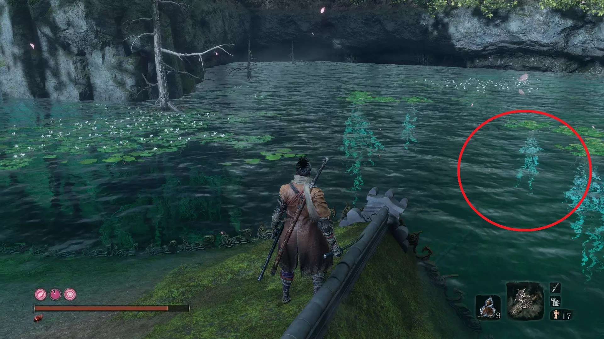 源之宫 葫芦种子 #9:隐藏森林 - 水生村佛像 当你到达宫殿的巨大樱花树佛像处,钩住你面前的树并向西望去。你会注意到一座半沉的房屋,上面有一个女人。前往那里,她会告诉你一条藏在水下洞穴中的巨大鲤鱼的事情。