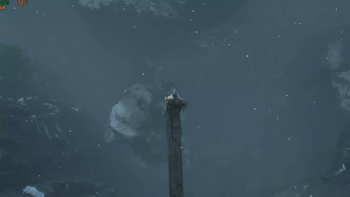 从这里开始,路径是线性的。沿着它进入小洞穴,然后从另一边出去。你会看到大量的积雪,以及一根从山上伸出来的小横梁。沿着横梁慢慢移动,向下看。啊,一条蛇!