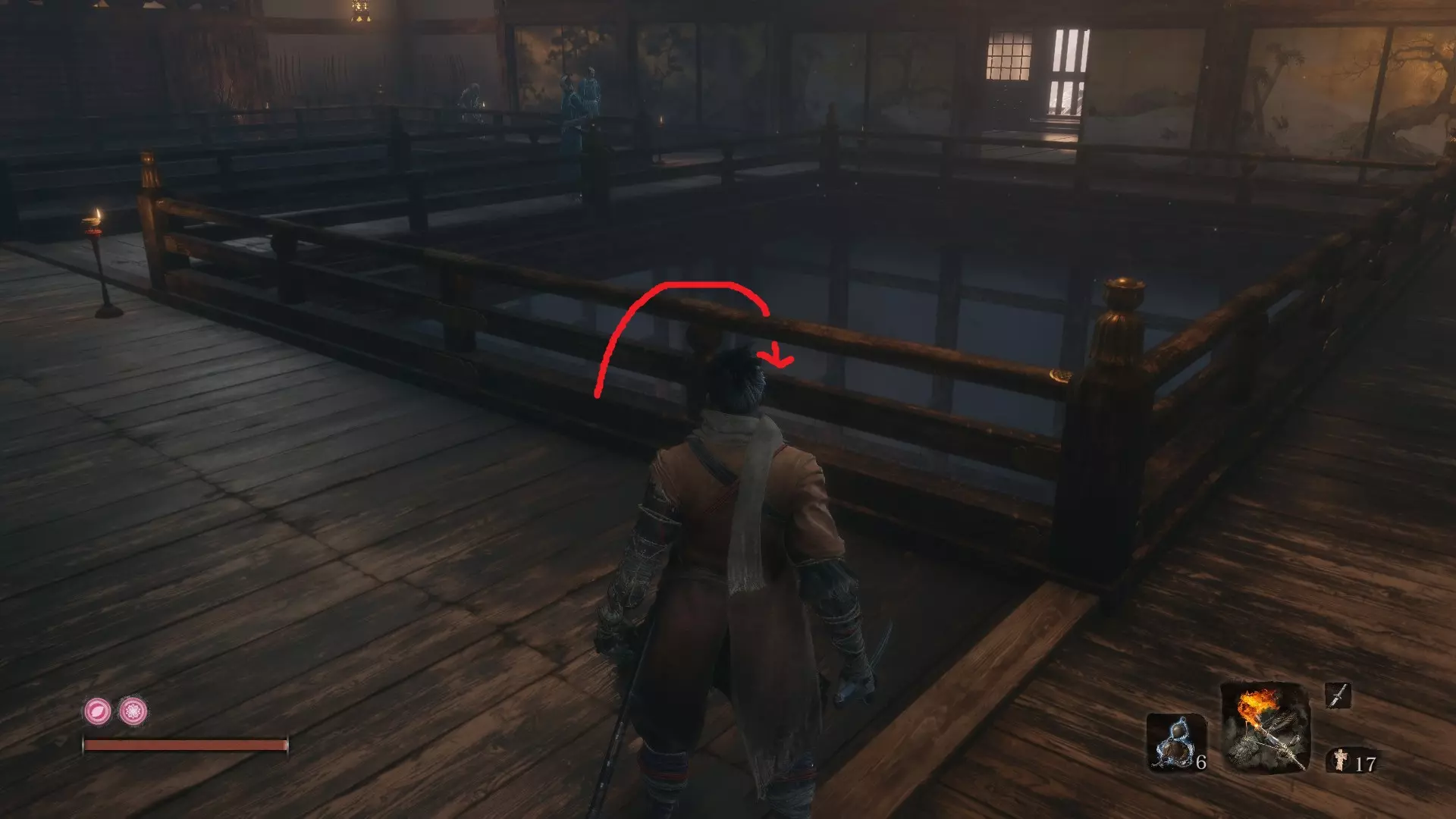 义手忍具#7 锈丸:上层天守阁 - 前室 在前室鬼佛处,你会注意到相邻房间里有一些身着蓝色长袍的移动敌人。这个房间的中央有一个大缺口,可通向一楼。跳到下方,消灭那里的四个敌人,你的忍具就在该区域附近的一个箱子里。